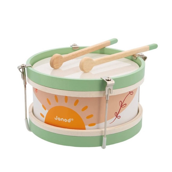 Drewniany bębenek z serii Sunshine francuskiej marki JANOD to idealna pierwsza zabawka muzyczna dla dziecka, która pomaga rozwijać słuch, poczucie rytmu oraz zdolności muzyczne. Wspiera także rozwój wyobraźni, koncentracji, wytrwałości i koordynacji ruchowej. Bębenek ma drewnianą konstrukcję, wzmocnioną metalowymi uchwytami, poręczny rozmiar, dwa patyczki do wystukiwania rytmu i piękną słoneczną kolorystykę – na brzegach namalowane jest małe lwiątko Leo oraz pomarańczowe odciski łap.