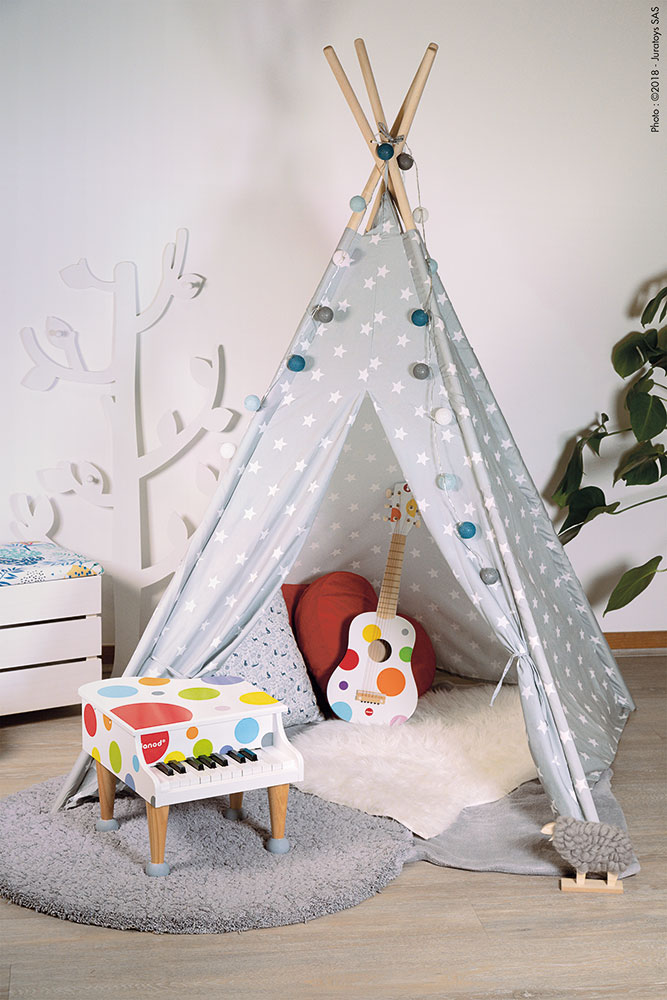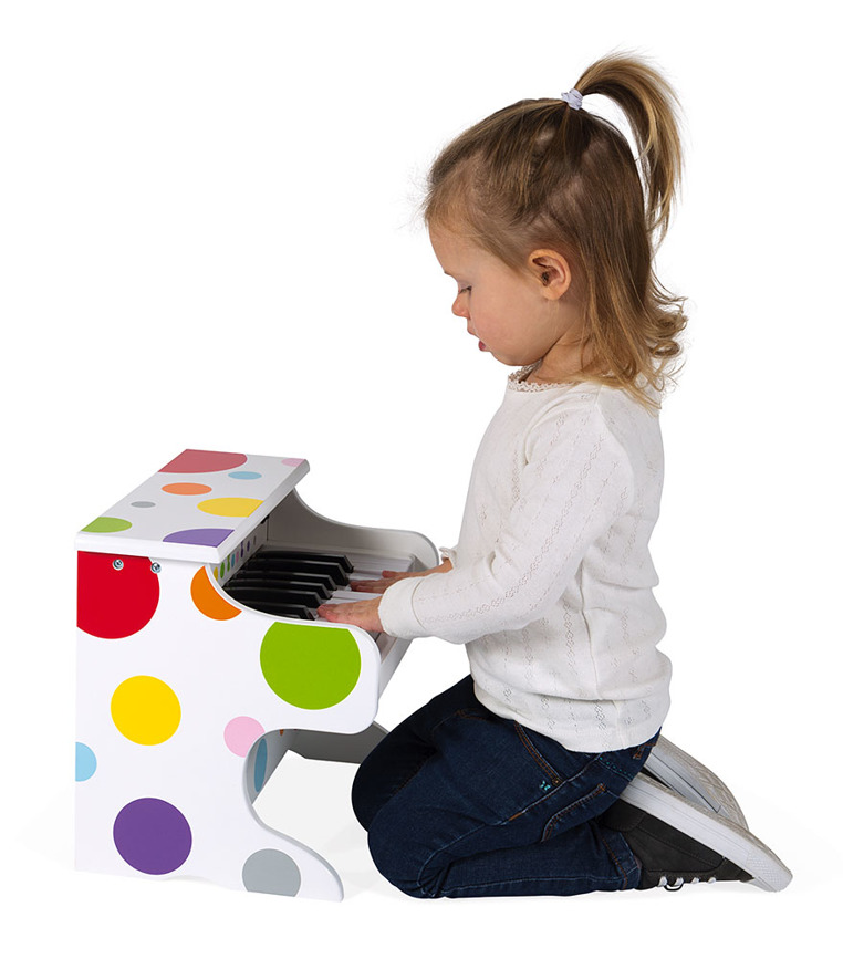 Drewniane elektroniczne pianino francuskiej marki JANOD idealnie sprawdzi się jako pierwszy instrument Twojego dziecka. Jest łatwe w obsłudze, pięknie wykonane i doskonale dopasowane rozmiarami do małej dłoni. Ma 18 klawiszy, a jego oryginalna, przyjazna kolorystyka (kolorowe kółka na białym tle) wręcz zaprasza do zabawy. Pianino wspiera rozwój maluchów poprzez obcowanie z muzyką, a jego dźwięk jest wyjątkowo przyjemny dla ucha. Instrument wyposażony jest w przycisk ON/OFF, po włączeniu gra melodię. Do zestawu dołączono książeczkę z nutami, w której znajdują się 4 proste dziecięce utwory do zagrania. Zapakowana jest w estetyczne, kartonowe pudełko i idealnie nadaje się na prezent.