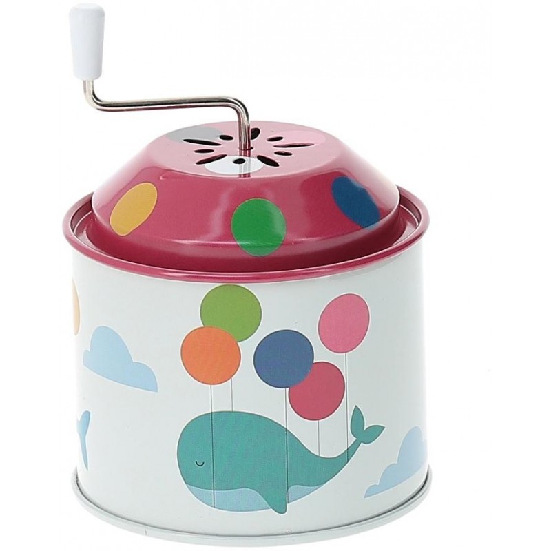 Kolorowy instrument muzyczny posiada oryginalną grafikę przedstawiającą uroczego wieloryba unoszącego się na kolorowych balonach.