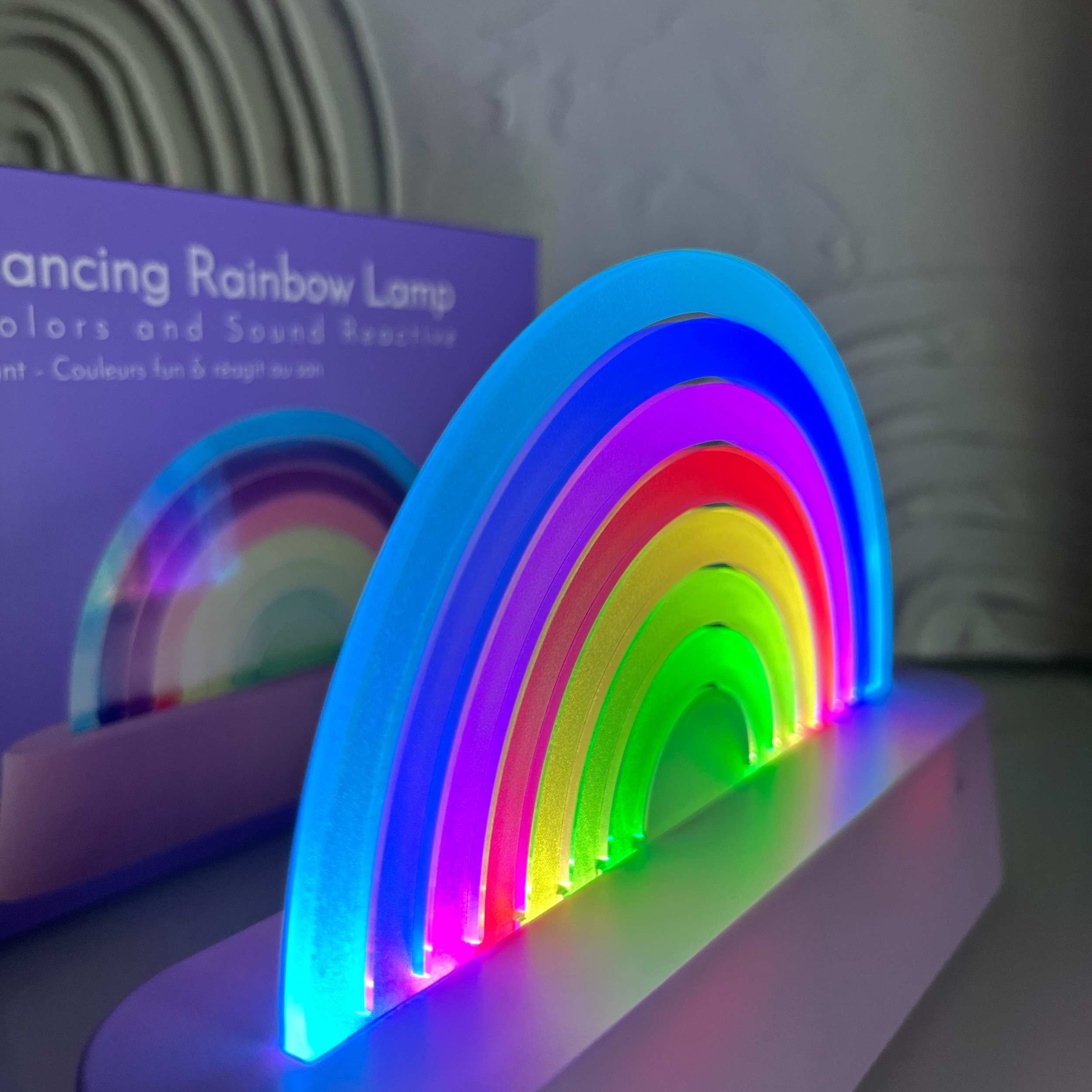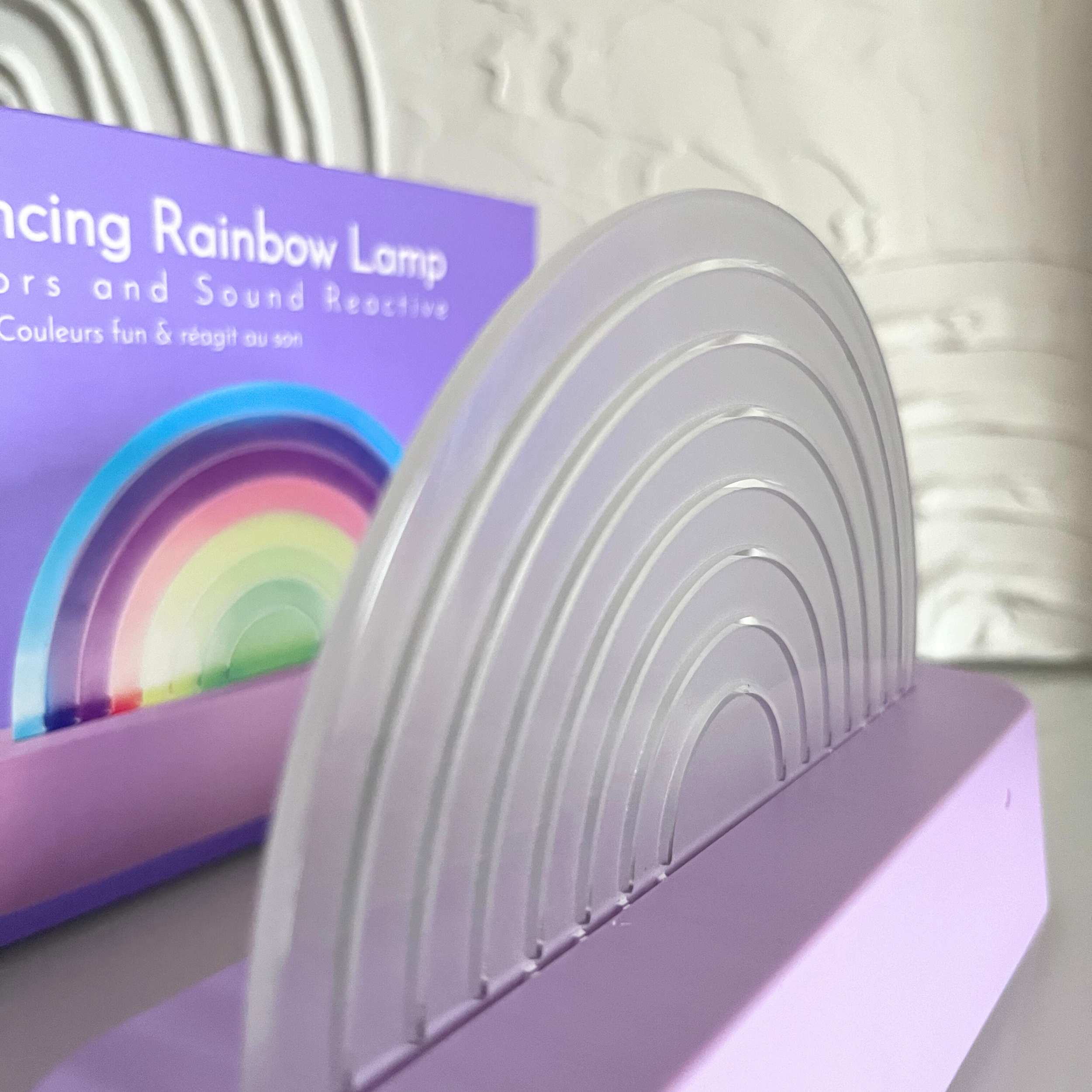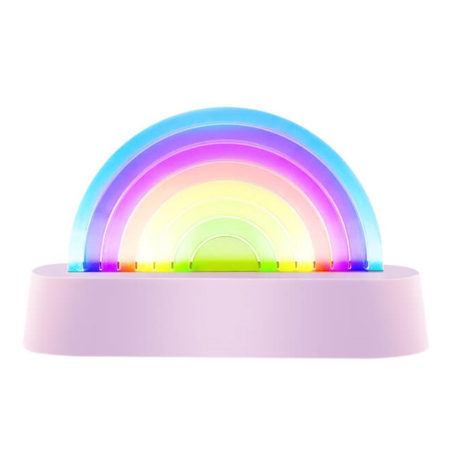 Piękna lampka Lalarma w kształcie kolorowej tęczy w ośmiu odcieniach z fioletową podstawą.