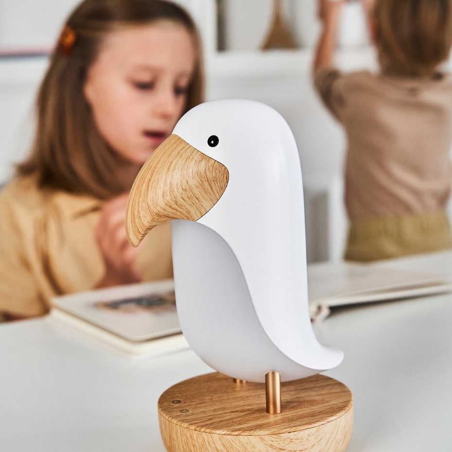 Maskonur to wyjątkowa lampka nocna z głośnikiem w kształcie ptaka z dużym dziobem i krótkimi nóżkami o charakterystycznym i zabawnym wyglądzie.