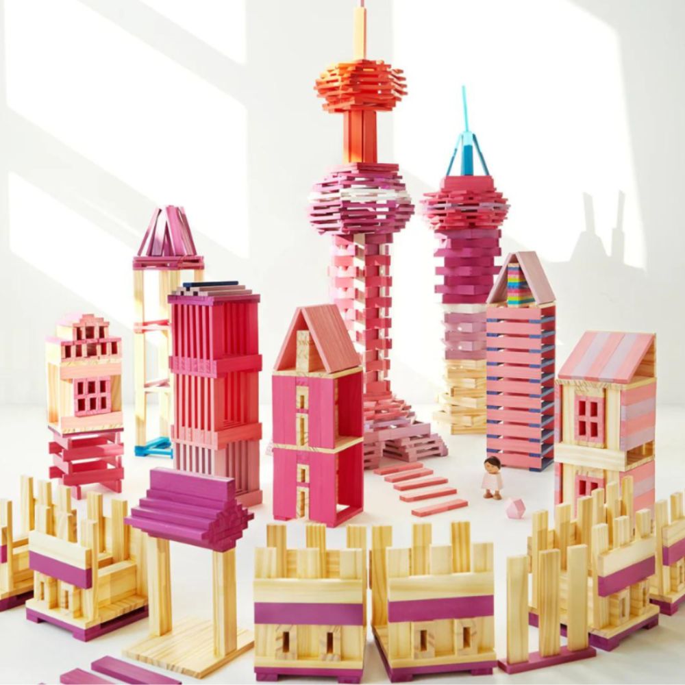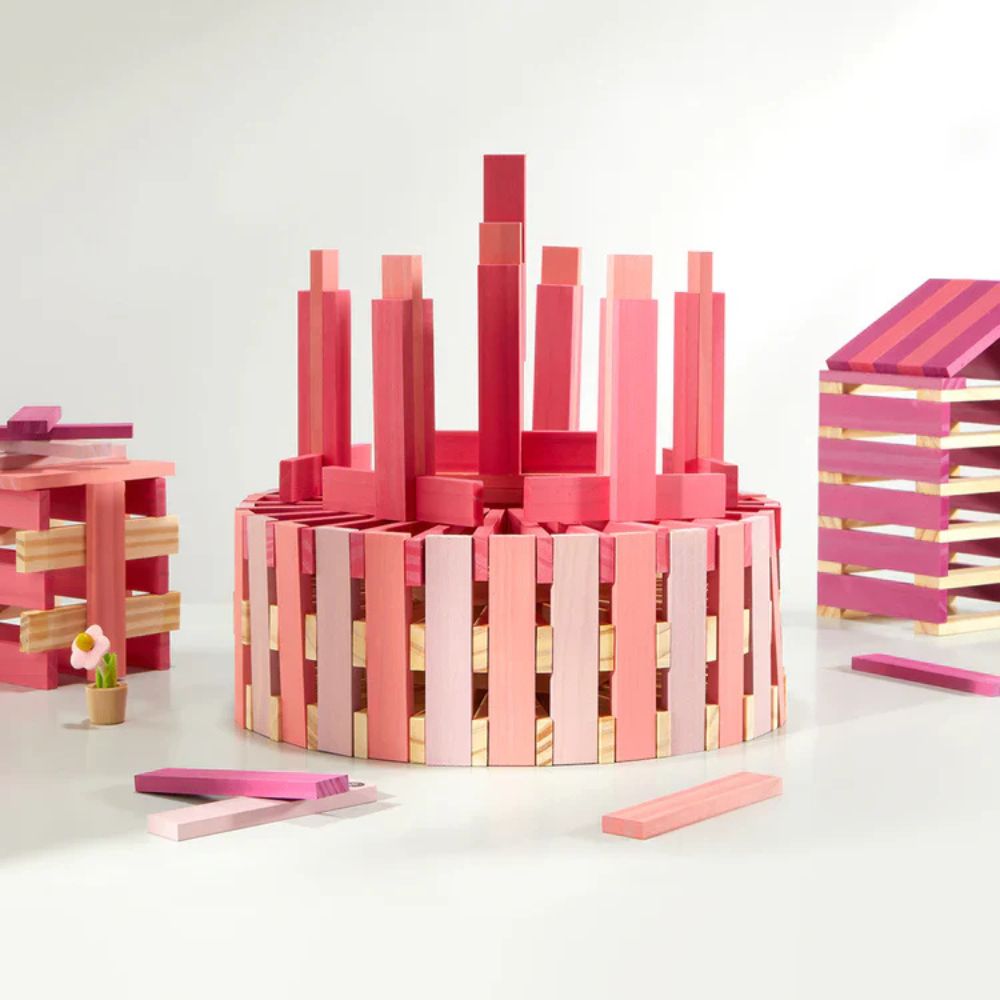 Uwagę przyciąga unikalna kolorystyka w gamie odcieni różu, która nadaje konstrukcjom nowoczesny i harmonijny wygląd. Zabawa klockami wspiera nie tylko wyobraźnię, ale także uczy precyzji, równowagi oraz podstawowych zasad fizyki (nauka poprzez zabawę!).