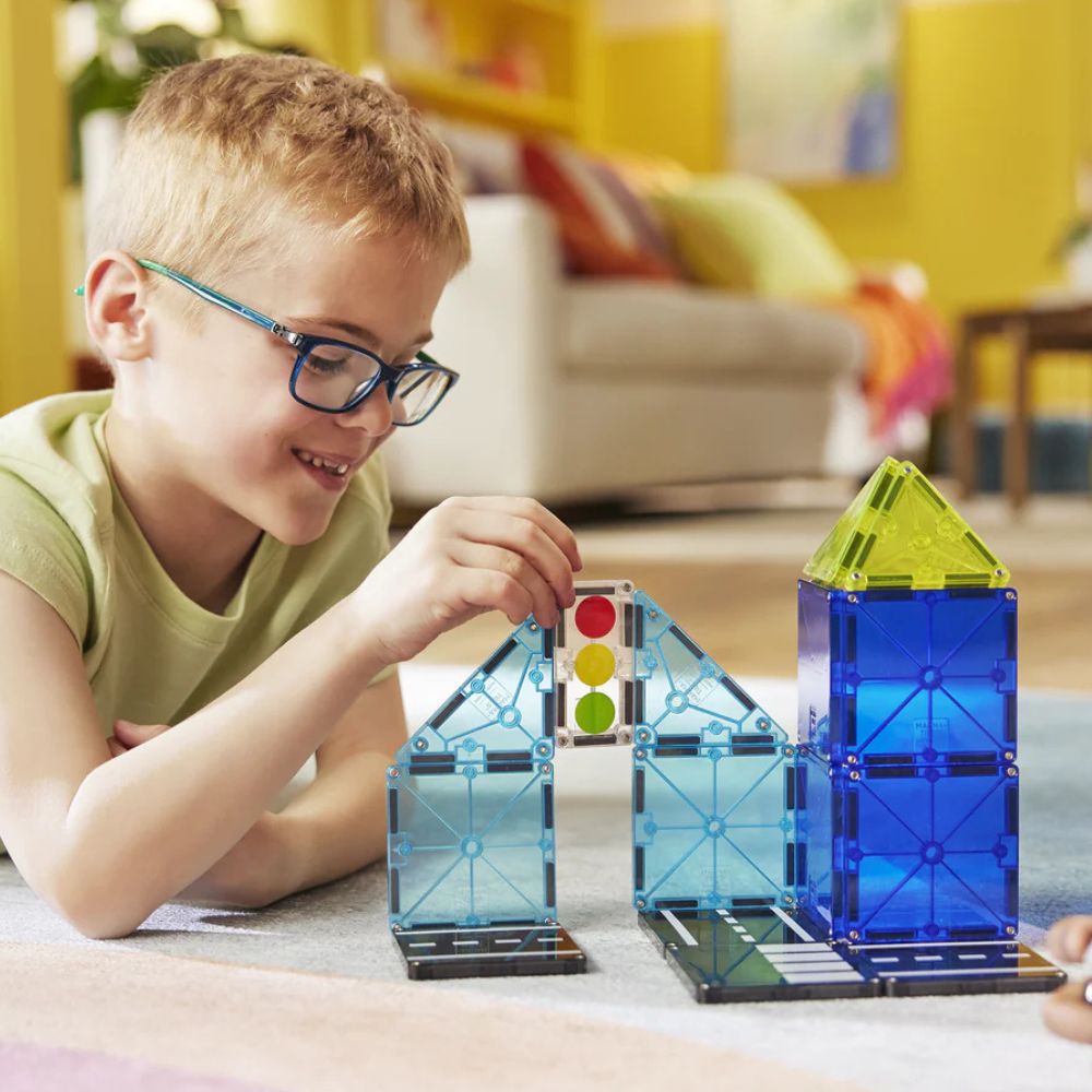 Zestaw klocków magnetycznych Magna-Tiles zawiera kolorowe płytki przypominające szkiełka. Elementy łączą się za pomocą mocnych magnesów, które znajdują się na krawędziach klocków. Dzięki nim konstrukcje są stabilne, a budowanie i tworzenie zyskuje zupełnie nowy wymiar.