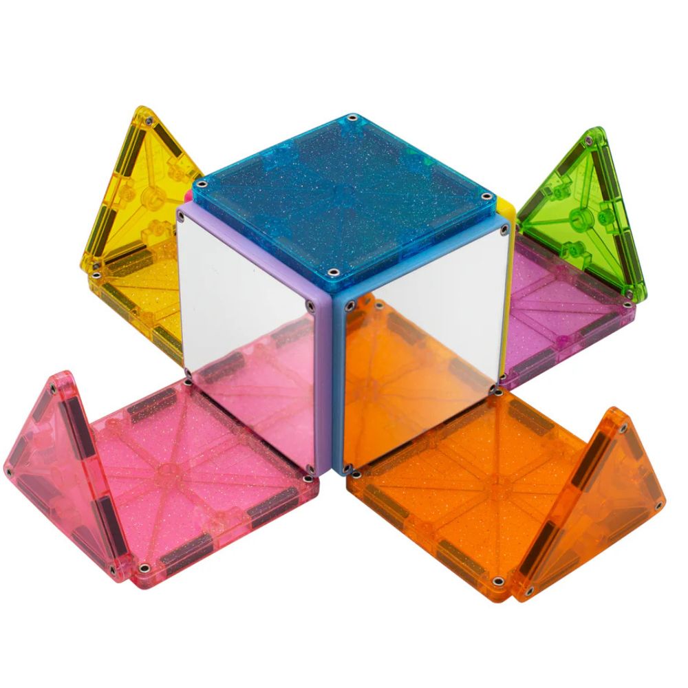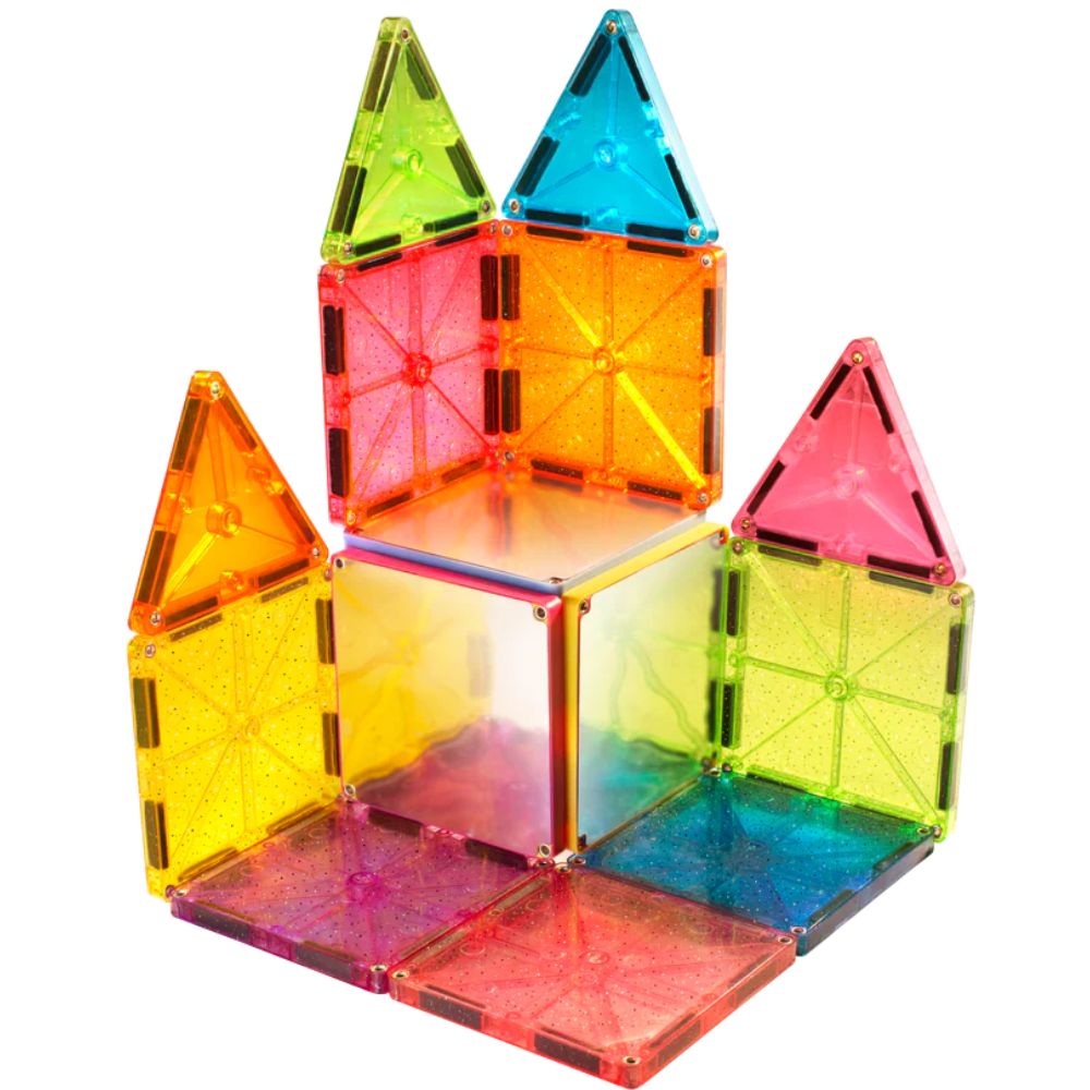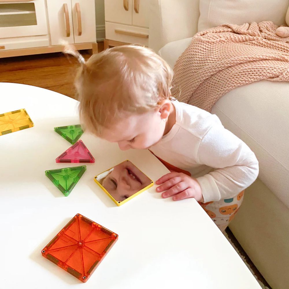 Zestaw klocków magnetycznych Magna-Tiles zawiera kolorowe, lustrzane płytki przypominające szkiełka. Elementy łączą się za pomocą mocnych magnesów, które znajdują się na krawędziach klocków. Dzięki nim konstrukcje są stabilne, a budowanie i tworzenie zyskuje zupełnie nowy wymiar.