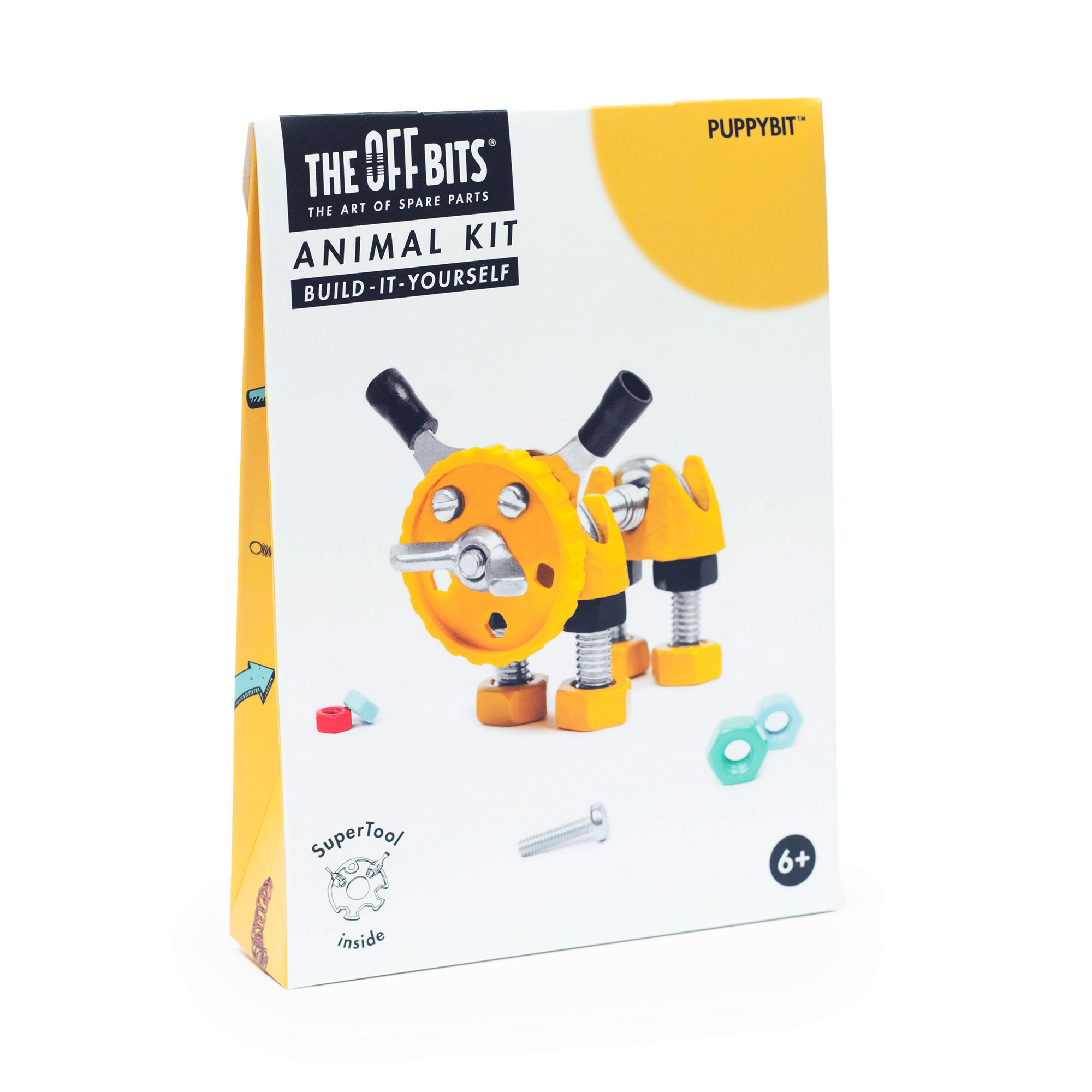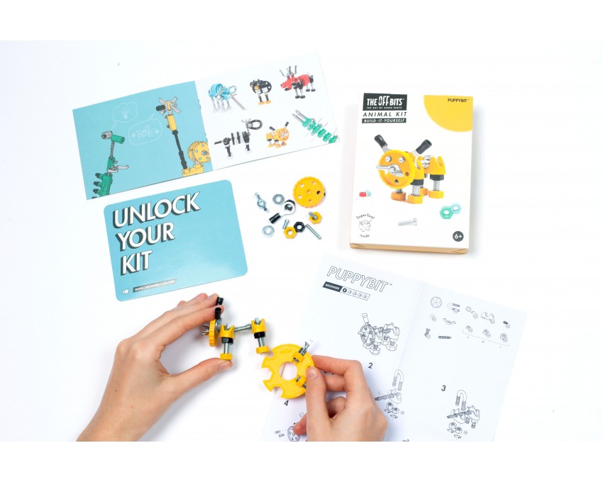 Zbuduj szczeniaka PuppyBit z tym niewilkim zestawem. „Open-source” OFFBITS® to system do konstrukcji zabawek bazujący na specjalnych elementach, które zostały uzupełnione o części dostępne w przeciętnym markecie budowlanym. Zestawy to barwne postaci robotów wraz z ciekawymi historiami oraz nieszablonowe pojazdy. Pomocne i inspirujące są także zestawy rozszerzeń, dodatkowe narzędzia oraz akcesoria. Masz pełną dowolność w łączeniu zestawów i rozszerzaniu ich o większą ilość części, które znajdziesz w domowej skrzynce z narzędziami. Zestaw zawiera: szczegółowe instrukcje, SuperTool™ pięć-w-jednym, niepowtarzalny kod rejestracyjny. Użyj kodu na stronie www.theoffbits.com aby dołączyć do internetowej społeczności twórców. Każdy zestaw zawiera narzędzie SuperTool™, które odpowiada wspólnym standardom wszystkich zestawów OFFBITS®. Niezwykłe, unikatowe podejście do tworzenia zabawek oraz oryginalne rozwiązania to cechy wyróżniające firmę OFFBITS®. Zestawy nowej generacji w swoim składzie mają ogólnie znane elementy. Celem projektantów OFFBITS® jest tworzenie zabawek, które zachęcają do kreatywności i rozbudzają wyobraźnię.