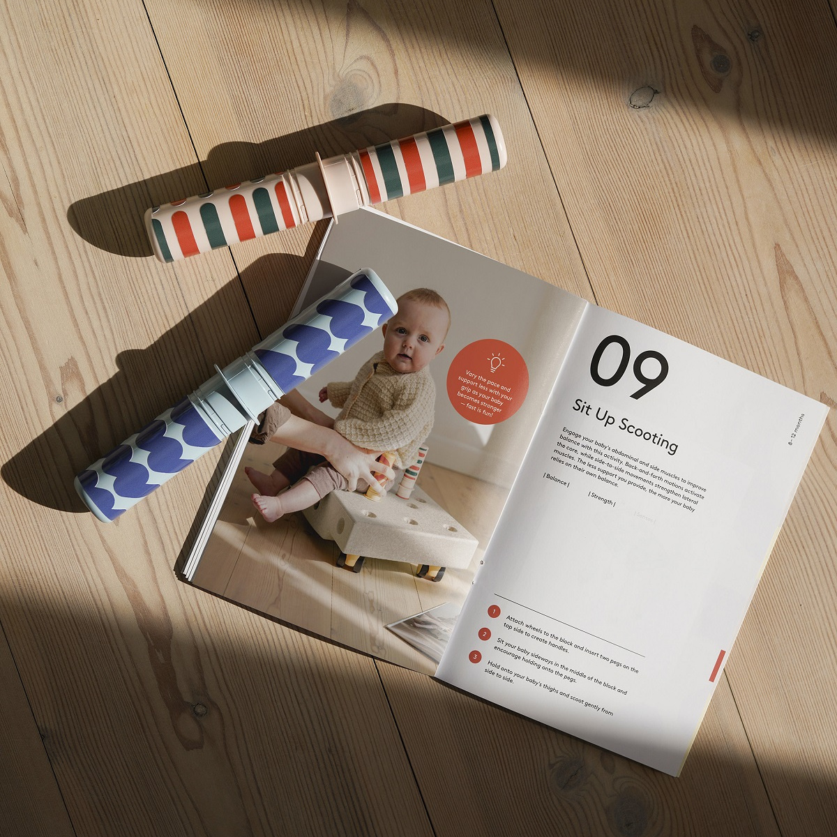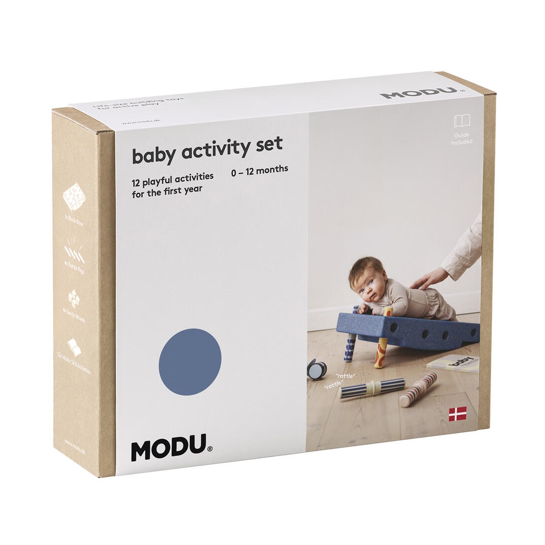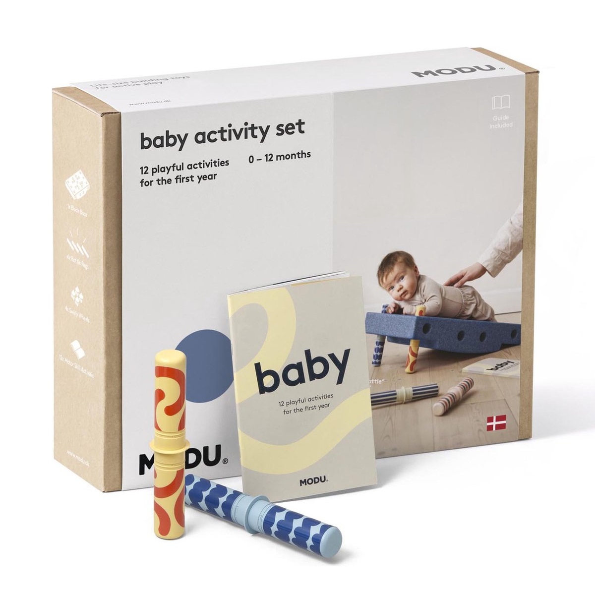 MODU - Zestaw Aktywnego Dziecka został opracowany we współpracy z terapeutką zajęciową, Anną Sundby Jensen. Do zestawu dołączony jest Przewodnik Aktywności zawierający 12 ćwiczeń na pierwsze 12 miesięcy życia dziecka. Przewodnik zawiera zdjęcia i instrukcje przedstawiające najważniejsze etapy rozwoju motorycznego, począwszy od karmienia, leżenia na brzuszku po raczkowanie i później pierwsze kroki.