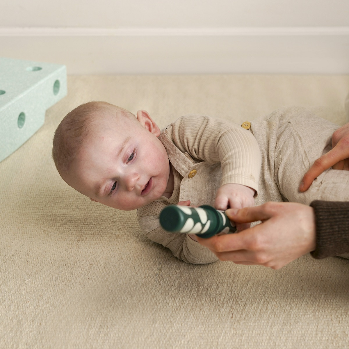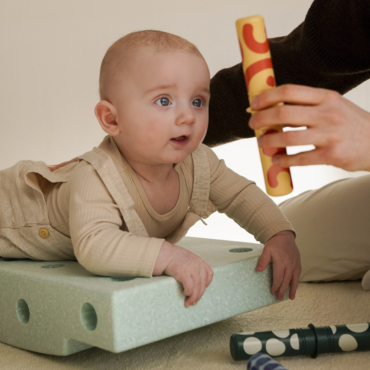 W zestawie poza sensorycznym blokiem piankowym, dzięki któremu maluszek może się położyć, chwiać, przechylać i kołysać znajdują się kolorowe grzechotki z ciekawymi wzorami i dźwiękami, zapewniającymi stymulację wizualną i sensoryczną - to idealny duet, który gwarantuje ciekawą, kreatywną i pobudzającą zmysły dziecka zabawę.