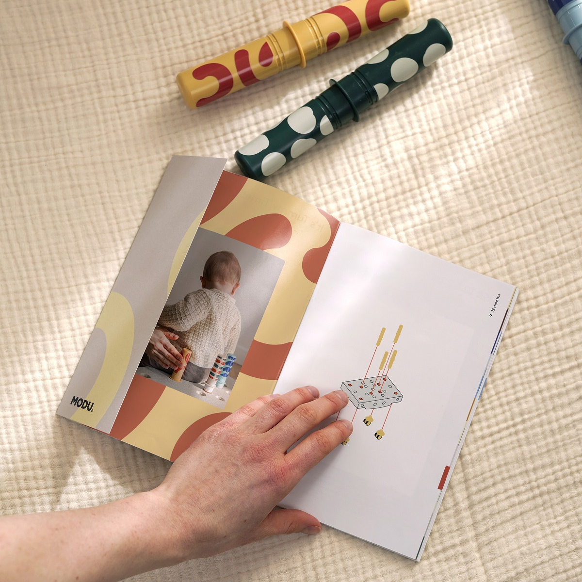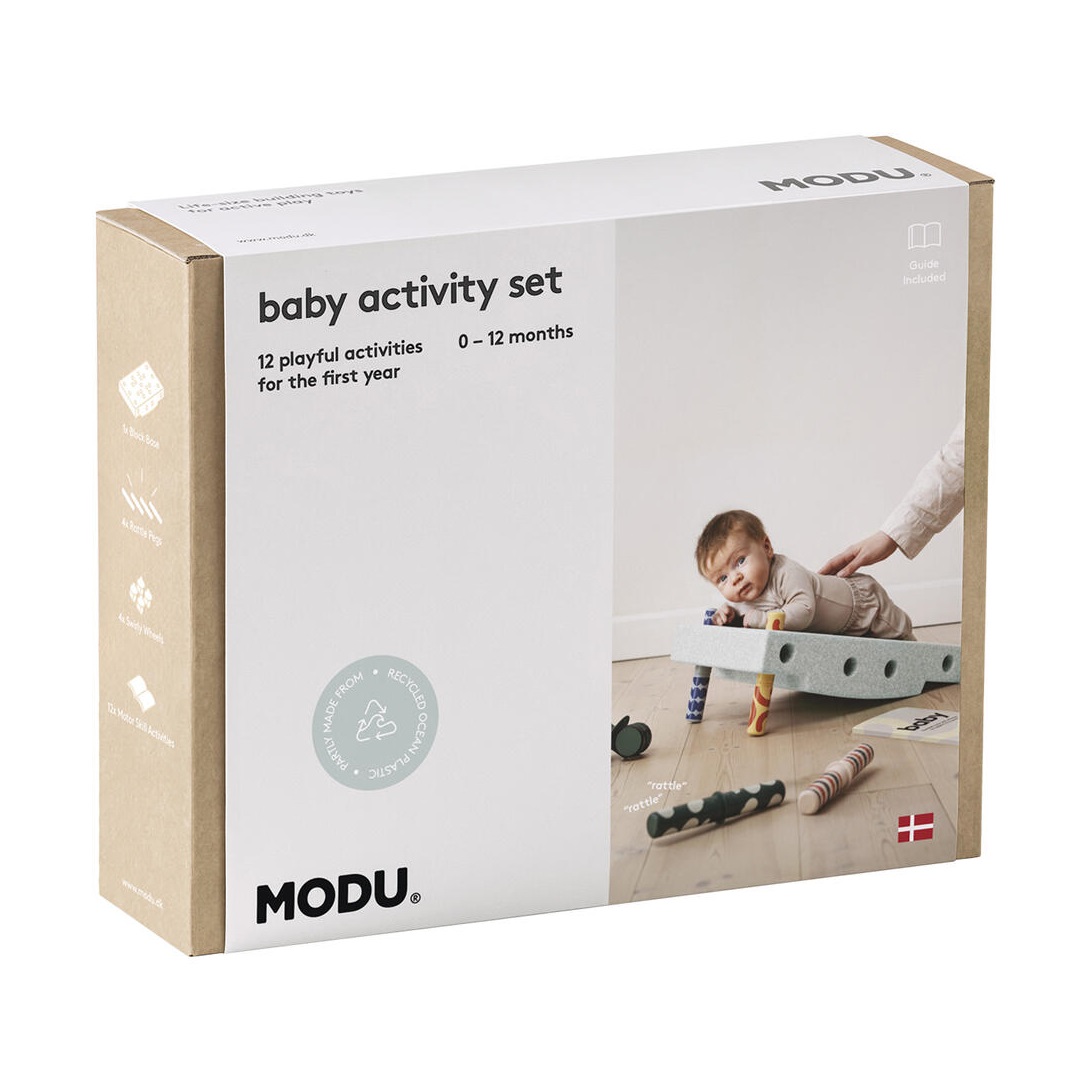 MODU - Zestaw Aktywnego Dziecka został opracowany we współpracy z terapeutką zajęciową, Anną Sundby Jensen. Do zestawu dołączony jest Przewodnik Aktywności zawierający 12 ćwiczeń na pierwsze 12 miesięcy życia dziecka. Przewodnik zawiera zdjęcia i instrukcje przedstawiające najważniejsze etapy rozwoju motorycznego, począwszy od karmienia, leżenia na brzuszku po raczkowanie i później pierwsze kroki.