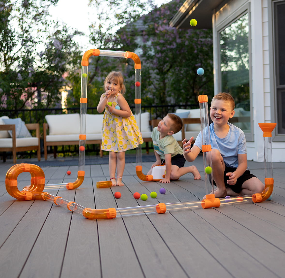Ułóż rurki i łączniki w dowolny sposób. Eksperymentuj, twórz jeszcze więcej pętli i zawijasów, przeplataj rurki pod stołem i nad krzesłem. Następnie włącz dmuchawę i zobacz jak kulki pędzą labiryntem napędzane powietrzem. Sprawdź co się stanie, gdy ustawisz niską lub wysoką moc dmuchawy, gdy włożysz na raz wszystkich kulki do labiryntu, a może uda ci się ułożyć rurki tak żeby kulki przeskakiwały z jednego do drugiego otworu, lub unosiły się w powietrzu.