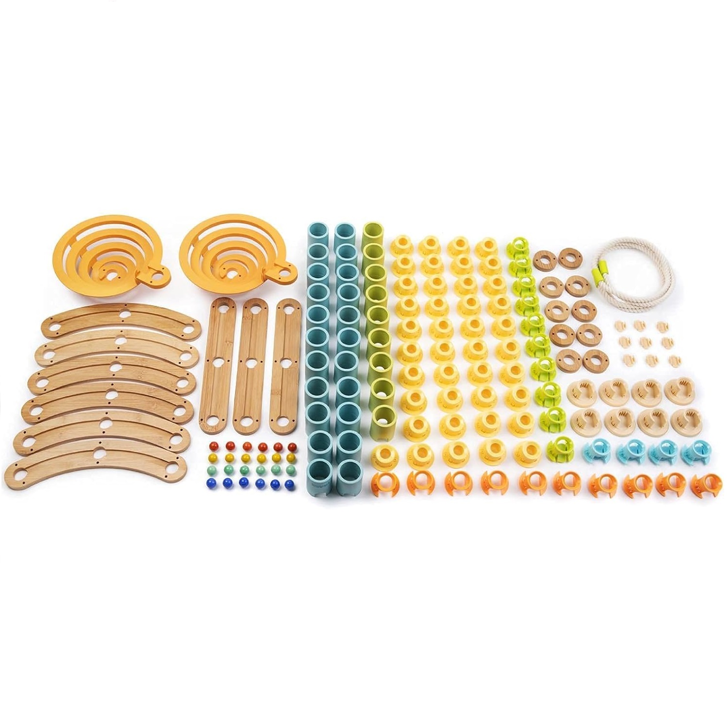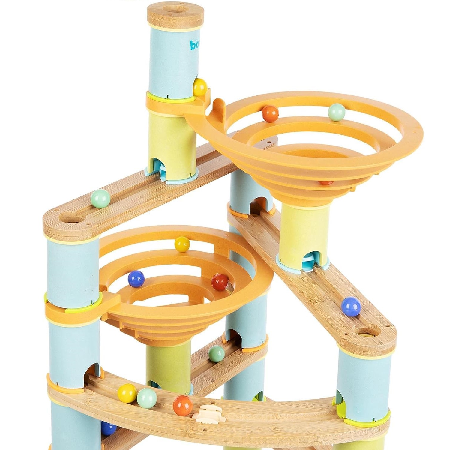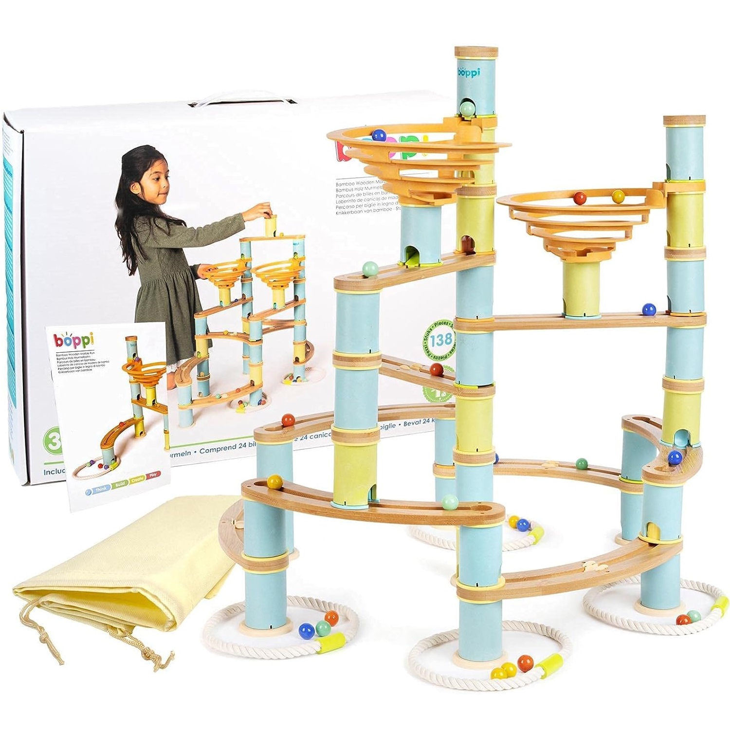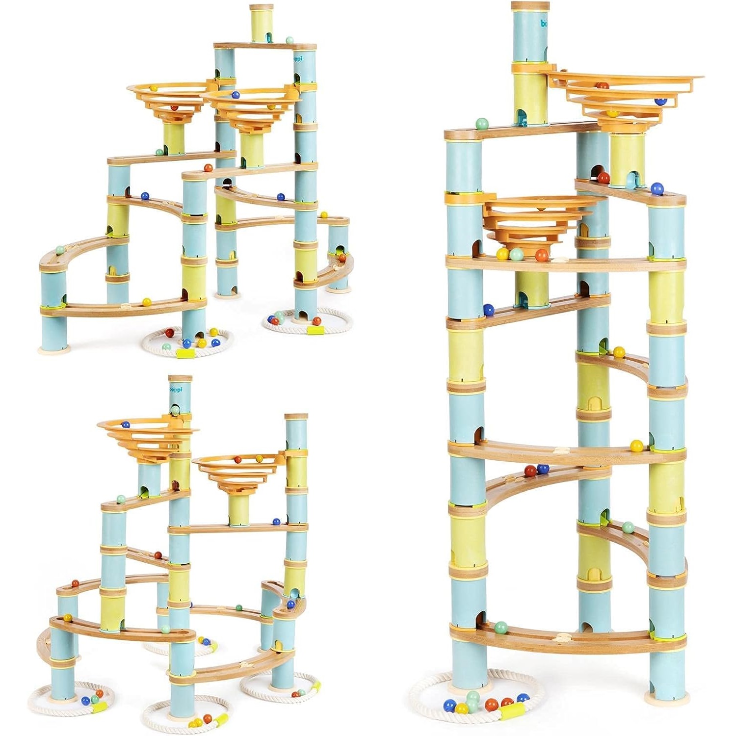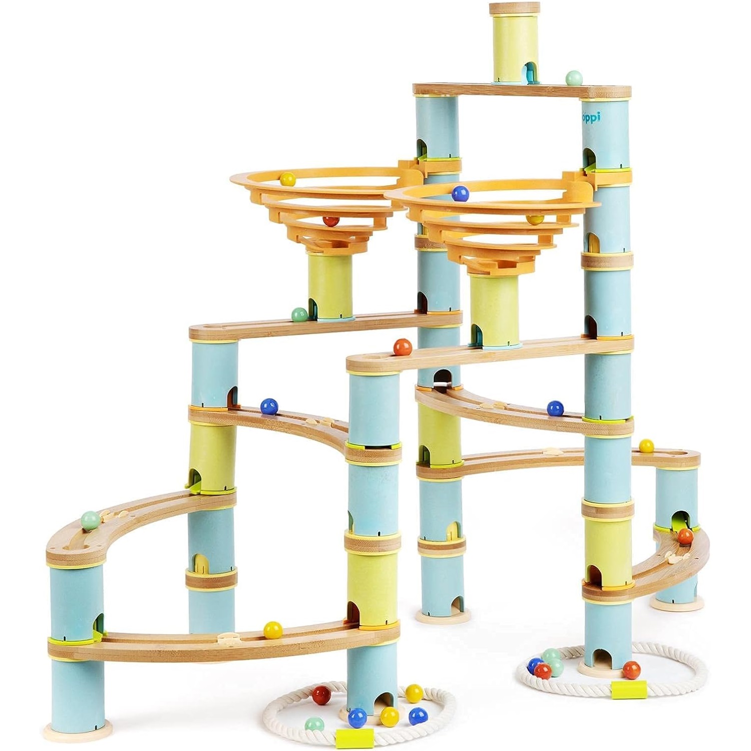 Przygotuj się na niekończącą się przygodę pełną zakrętów i niespodzianek! Tory BOPPI wykonane z bambusowego drewna są przyjazne dla środowiska i przynoszą mnóstwo zabawy. Twórz i buduj wiele struktur i poziomów za pomocą łączonych części tak, aby kulki mogły przemieszczać się od góry do podstawy przez spiralny spadek, tory i cylindry.