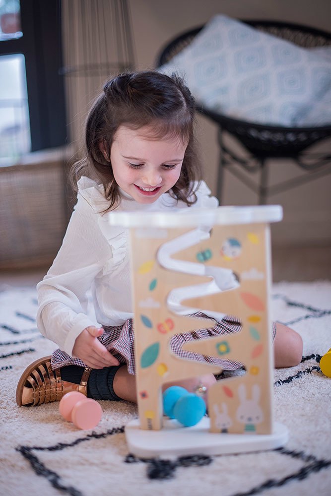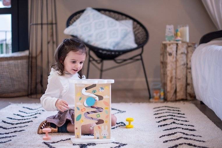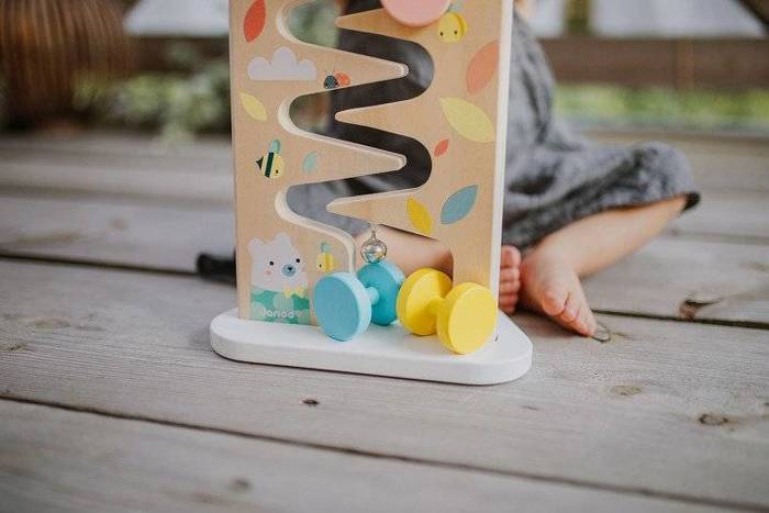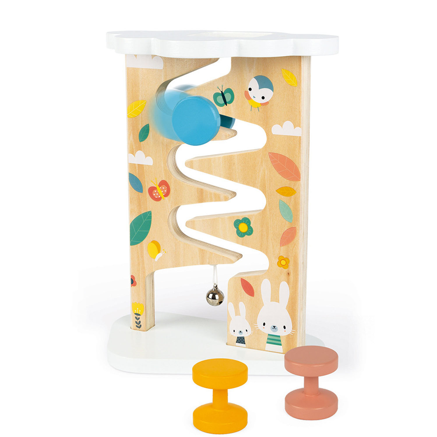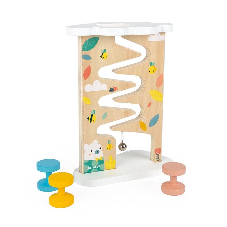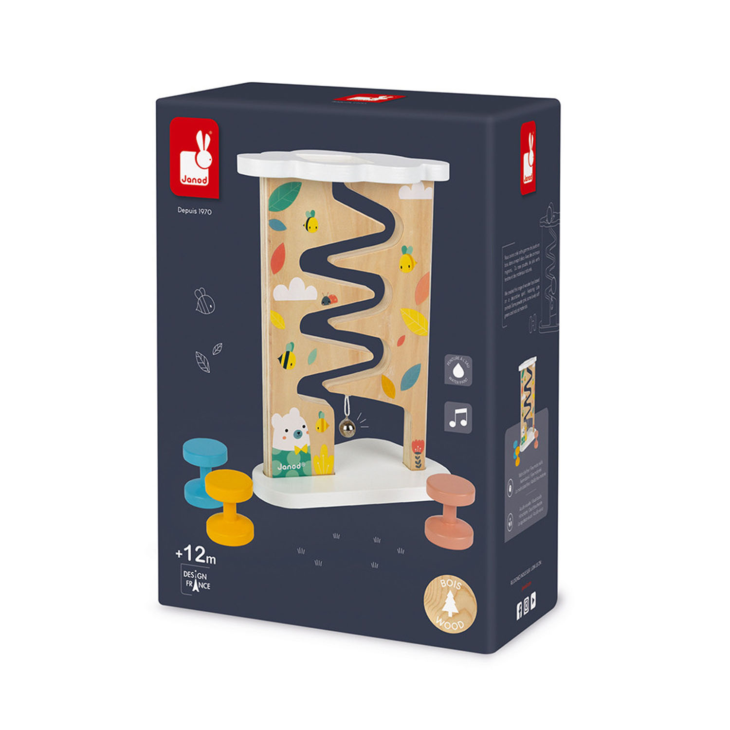 Drewniany tor zjeżdżalnia francuskiej marki JANOD to idealna zabawka dla dzieci od 1. roku życia. Przez otwór w górnej części w pętli umieszcza się klocek – w kształcie mini-sztangi z okrągłymi bokami (w komplecie są 3 sztuki), który następnie opada w dół toru. Na końcu swojej drogi, uderza on w dzwoneczek. Przesuwając elementy maluch rozwija koordynację ruchową i motorykę, a także uczy się logicznego myślenia. Tor ma piękne pastelowe kolory, które zaciekawiają i zachęcają dziecko do zabawy. Wszystkie elementy są wygodne do trzymania w małych rączkach. Zabawka jest umieszczona na podstawce. Jest w pełni bezpieczna dla dziecka. Zabawka została zaprojektowana we Francji. Zapakowana jest w estetyczne, kartonowe pudełko w pastelowych kolorach. Idealnie nadaje się na prezent.