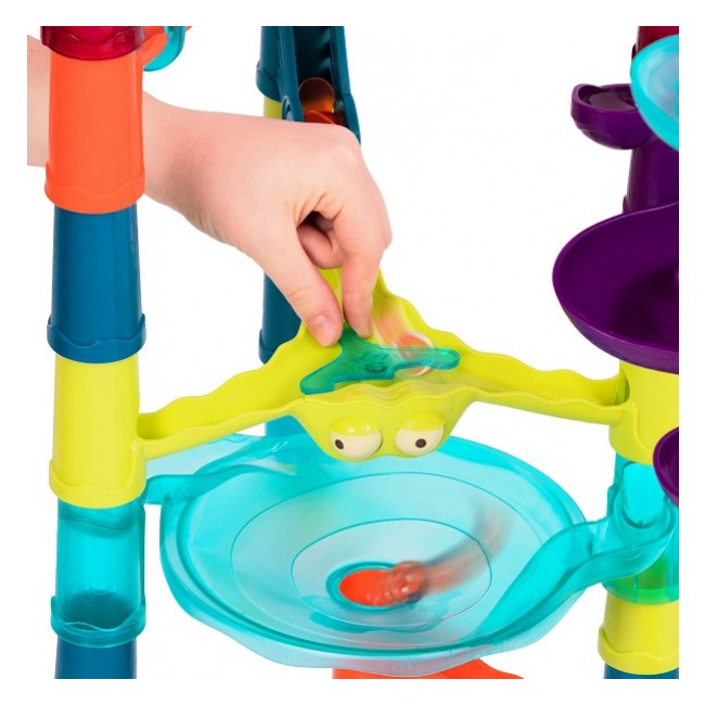 Fascynujący, bajecznie kolorowy interaktywny kulodrom Marble Palooza B. Toys z zabawnymi światłami i dźwiękiem. Zestaw składa się z 38 kolorowych elementów, w tym 8 kulek, łatwych do złożenia w nieskończoną ilość konfiguracji. Zróżnicowane kształty komponentów oraz ruchome części pozwalają na zmiany kierunków/przebiegu tras, co stymuluje kreatywne myślenie i pobudza wyobraźnię przestrzenną. Zabawka rozwija także zdolności manualne, motoryczne i rozumowanie przyczynowo-skutkowe.