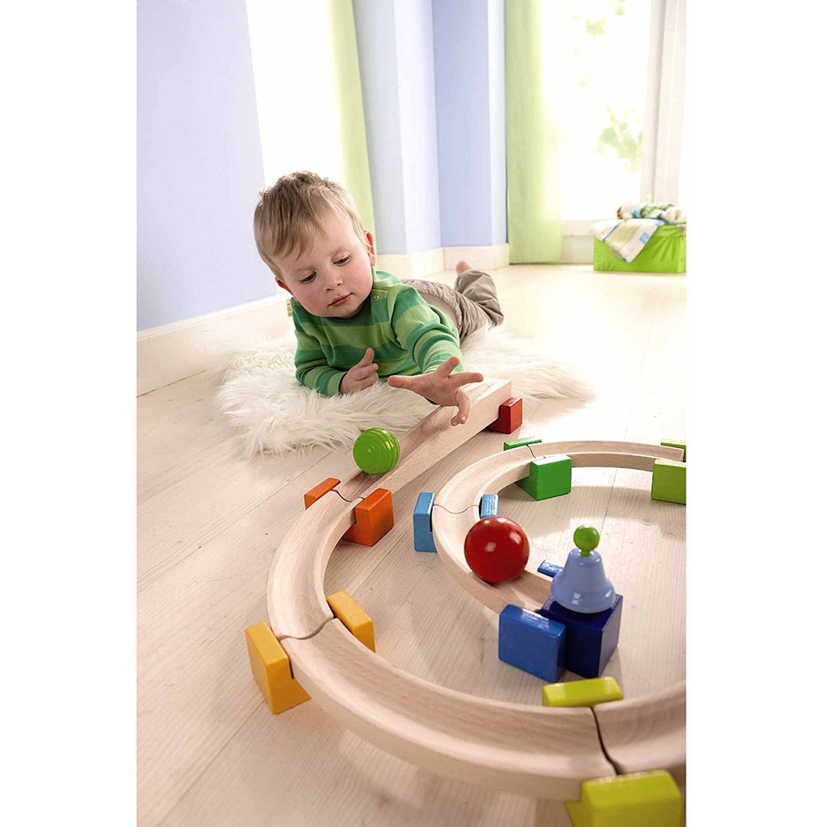 Kulodrom to wspaniała kreatywna zabawka dla dzieci od 18 mc-a życia.Toczące się i dzwoniące kulki, stymulują dziecko do poznawania podstawowych praw fizyki oraz rozwijają je manualnie. Zabawa z kulkami fascynowała dzieci od wielu pokoleń. Od trzeciego roku życia, dziecko może kontynuować zabawę z kulkami, na bardziej rozbudowanych kulodromach oraz mniejszych kulkach(patrz produkty powiązane). W skład zestawu wchodzą: rampa 1 szt, zakręty 6 szt, kolorowe podstawy 8 szt, klocek z dzwoneczkiem 1 szt, kolorowe duże kulki 2 szt.