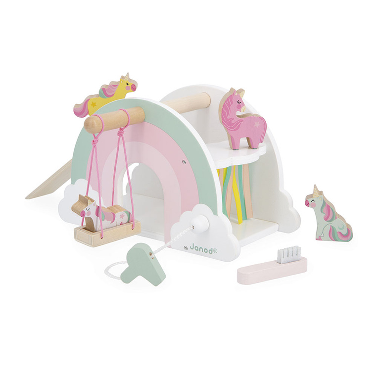 Drewniany domek jednorożców to doskonała zabawka dla dziewczynki. W skład zestawu wchodzi piętrowy domek ze ściankami w kształcie tęczy, zjeżdżalnią, myjnią z tasiemek i zewnętrzną huśtawką. Ponadto w komplecie są 4 drewniane figurki jednorożców oraz szczotka i suszarka do ich pielęgnacji. Zestaw pozwala na tworzenie wielu scenariuszy zabaw i zachęca do snucia opowieści. Idealnie nadaje się na prezent.