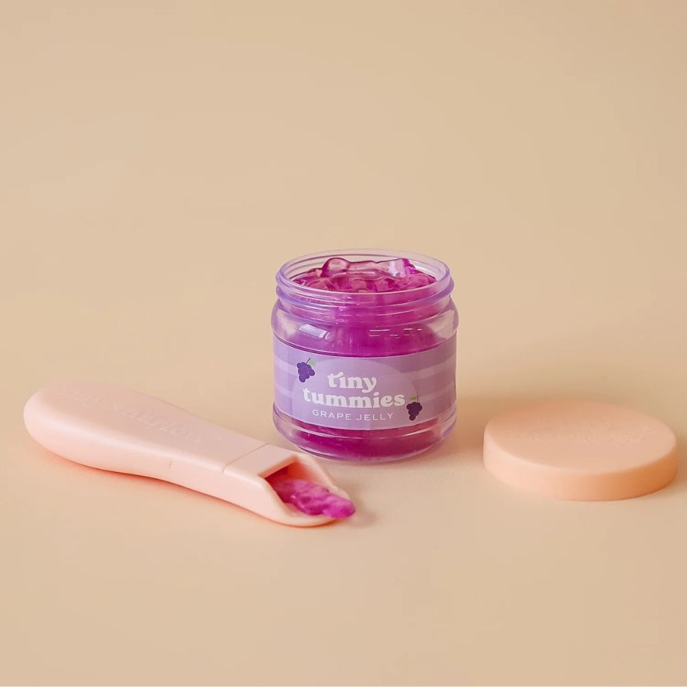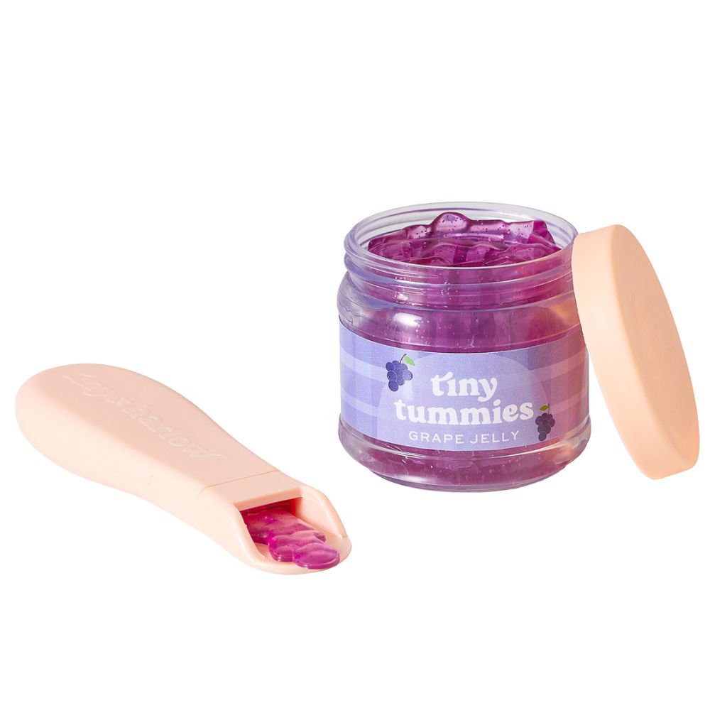Magiczny słoiczek Tiny Tummies z łyżeczką do karmienia lalek Tiny Harlow w wersji: Winogrono