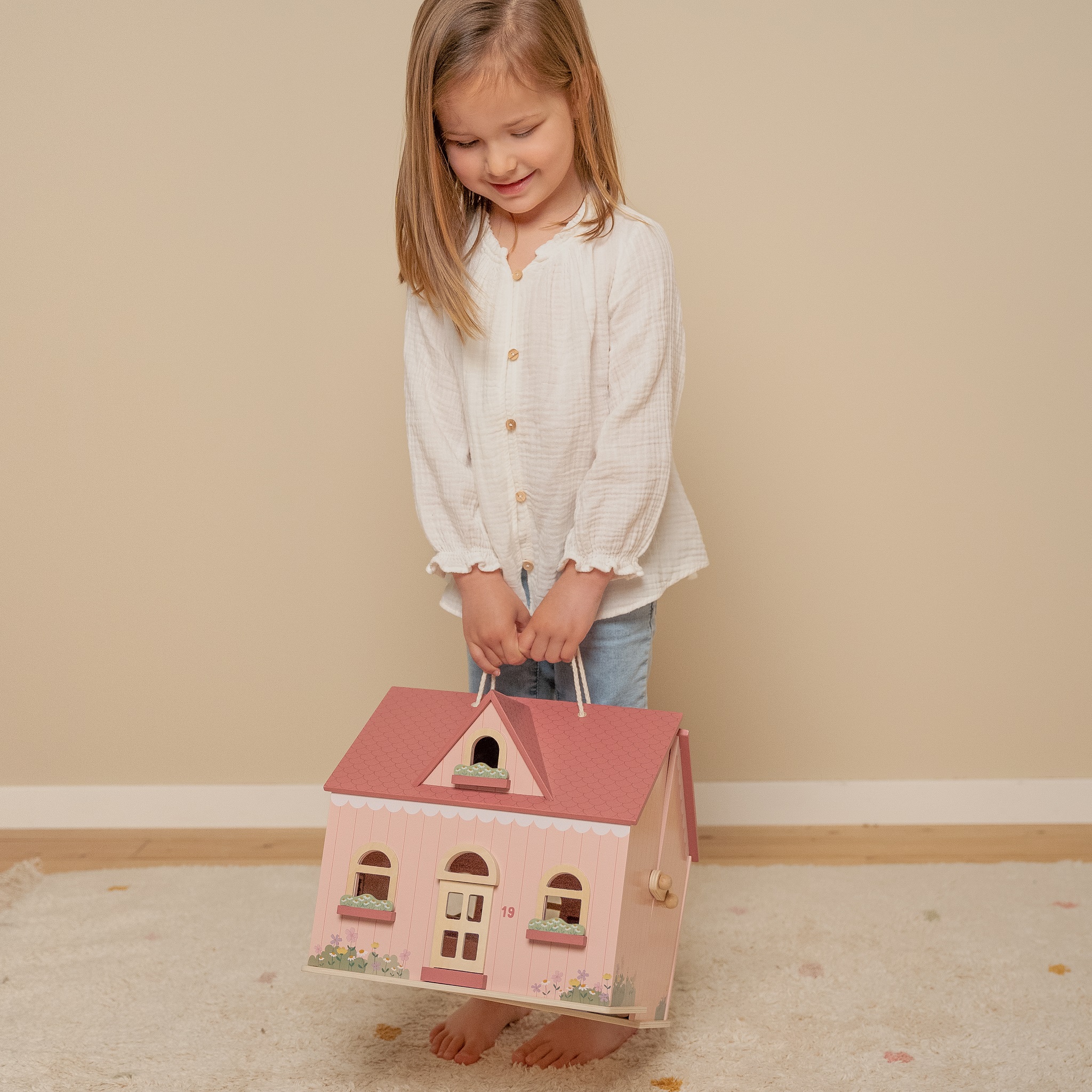 Drewniany, przenośny domek jest uroczy i bardzo starannie wykonany, posiada ładne detale. Domek dla lalek to rozrywka na dwóch poziomach: parter to salon i kuchnia, a na piętrze znajdują się sypialnia i łazienka. Dzięki drewnianemu zamknięciu, otwieranie i zamykanie domku jest bardzo proste, a uchwyt na dachu ułatwia przenoszenie go z miejsca na miejsce. Kompaktowe rozmiary tego domku pozwalają na swobodne umieszczenie go w każdym pokoju dziecięcym. Całe niezbędne wyposażenie, w tym meble oraz dwie drewniane postaci do zabawy, są dołączone do zestawu.