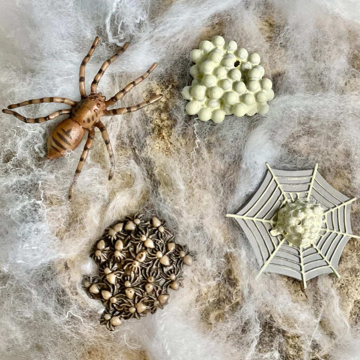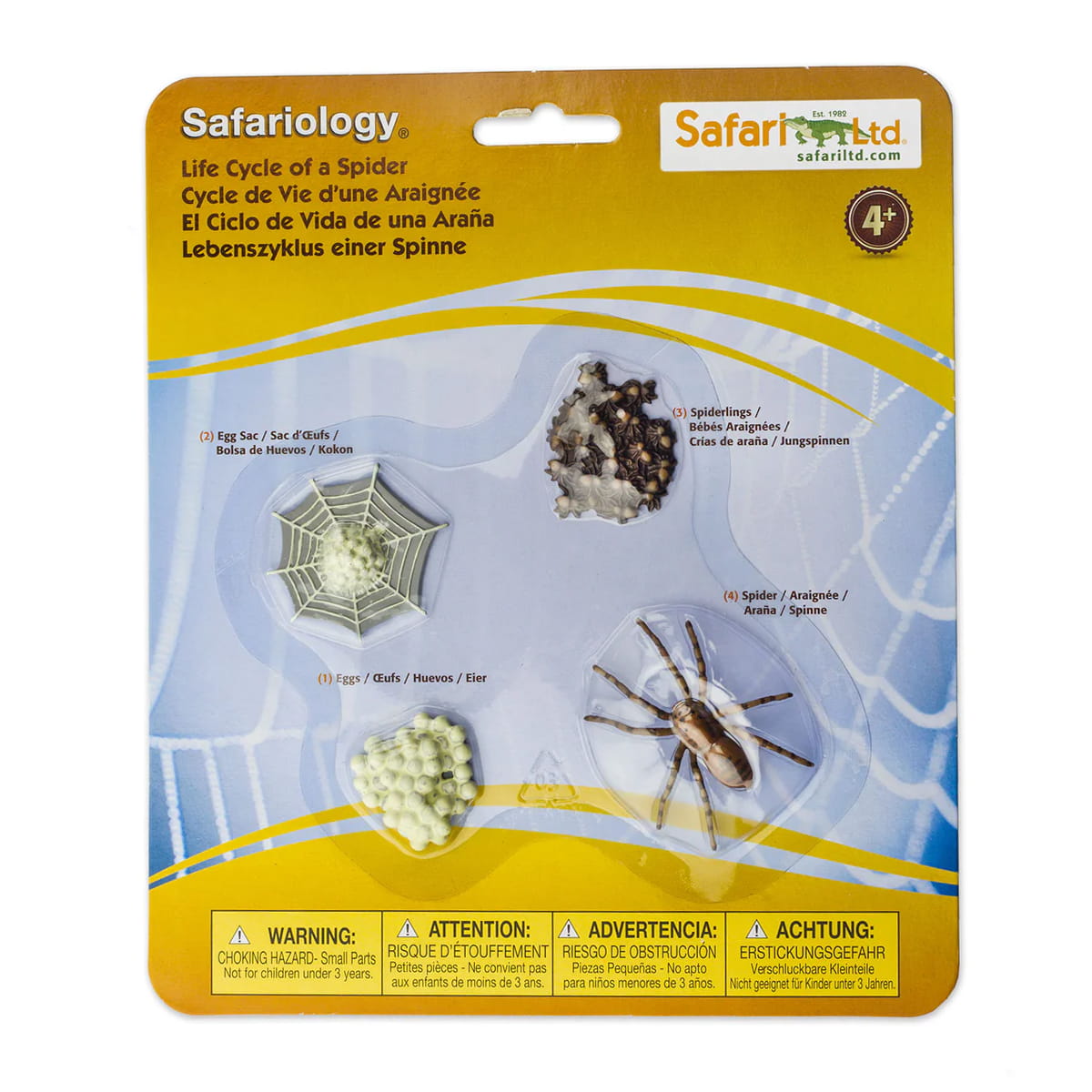 Zestaw 4 figurek cyklu życia pająka - jaja i worek jajowy, młode pająki, dorosły pająk. Figurki amerykańskiej marki Safari są ręcznie malowane i profesjonalnie wykonane, ukazując realistyczne detale figurek.