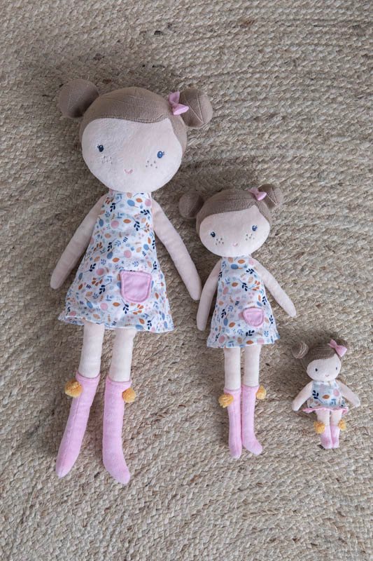 Urocza i przytulna lalka Rosa wykonana z miłego i miękkiego materiału. Będzie wspaniałą towarzyszką dziecięcych zabaw i ukochaną przytulanką. Wyglądem przypomina prawdziwą dziewczynkę. Laleczka posiada sukienkę z kieszonką z motywami roślinnymi, różowe skarpetki z pomponikami oraz różową kokardkę. Można ją posadzić. Zapakowana w piękne, kartonowe pudełeczko ze sznurkiem będzie wspaniałym prezentem dla każdej dziewczynki.