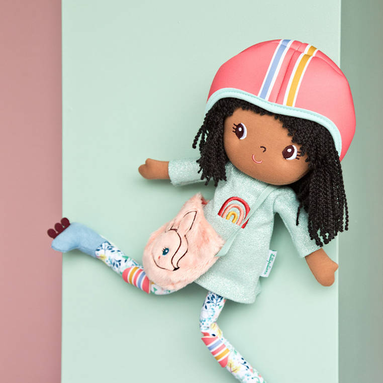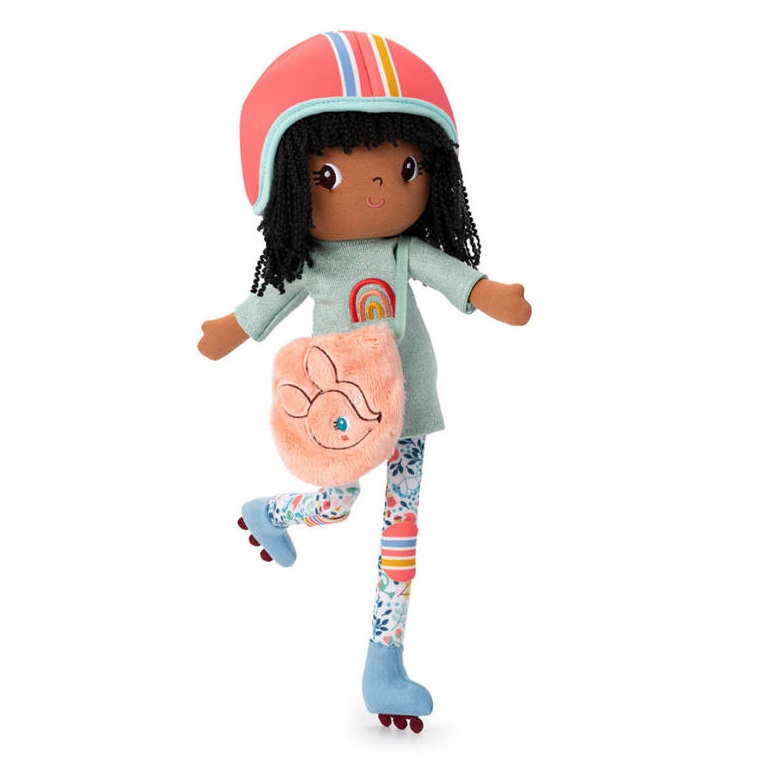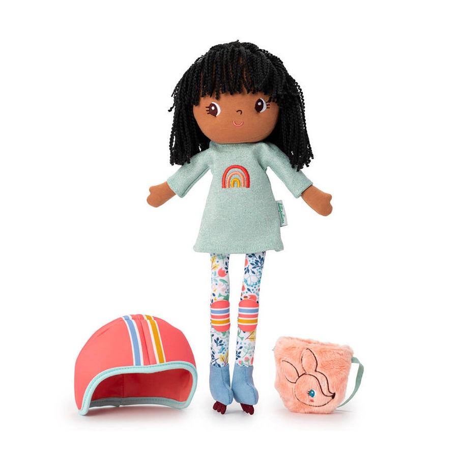 Liza uwielbia skating, ale zawsze robi to bezpiecznie – nie rusza się nigdzie bez swojego neoprenowego różowego kasku i ochraniaczy na kolana. Ma też pluszową przewieszaną przez ramię torebkę z wyszytą sarenką. Jest perfekcyjnie wykończona, z dbałością o każdy szczegół i w pełni bezpieczna dla dziecka. Oczy, nos i buzia lalki są wyszywane. Zapakowana jest w otwarte pudełko.
