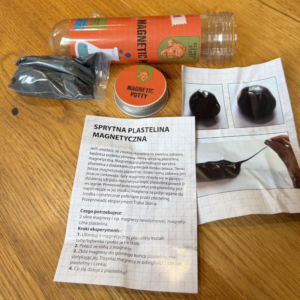Dziecko może samodzielnie sprawdzać, co się stanie, gdy położy magnes na plastelinie - czy zostanie odepchnięty, czy wciągnięty do środka? To świetna okazja do nauki przez zabawę i rozwijania ciekawości świata. Sprytna plastelina to także doskonała zabawka sensoryczna i antystresowa, która dostarcza mnóstwo frajdy podczas zgniatania, rozciągania i eksperymentowania.