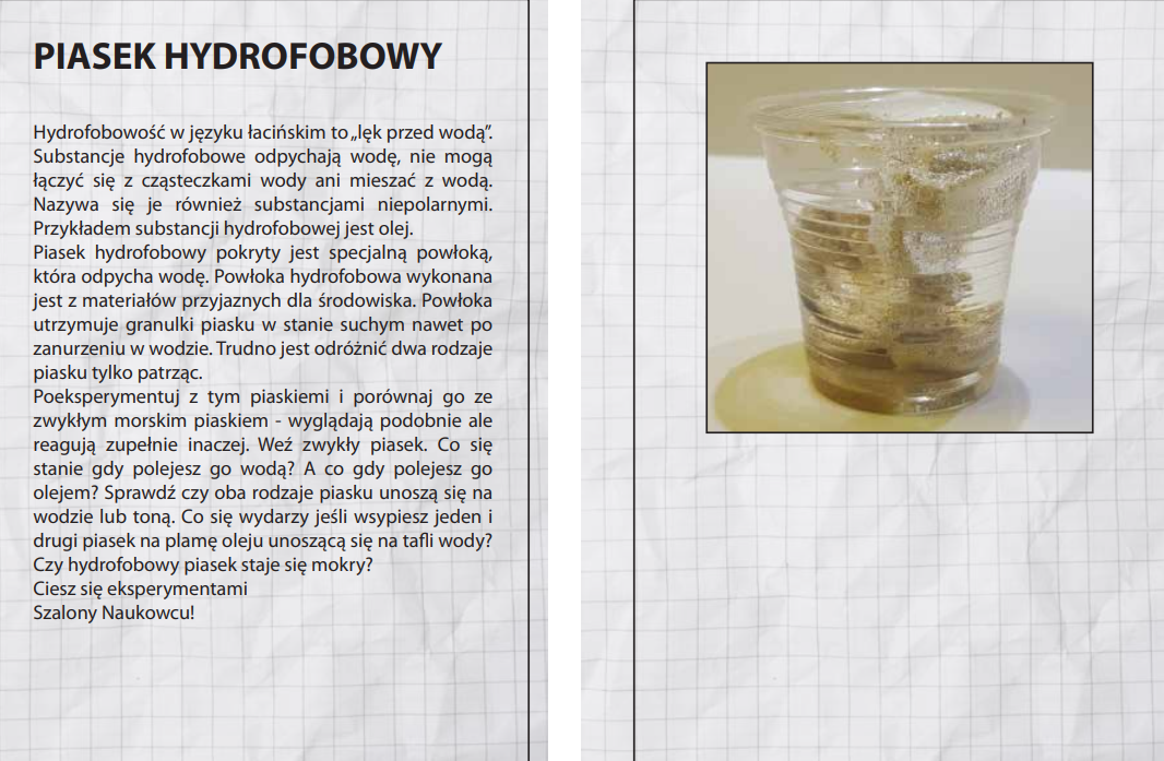 Piasek hydrofobowy to eksperymenty związane z substancjami, które odpychają wodę - nie mogą łączyć się z cząsteczkami wody ani z nią mieszać. Piasek hydrofobowy pokryty jest specjalna powłoką, która odpycha wodę. Poeksperymentuj z tym piaskiem i porównaj go ze zwykłym morskim odpowiednikiem - wyglądają podobnie, ale reagują zupełnie inaczej. Sprawdź czy oba rodzaje piasku unoszą się na wodzie lub toną. Co się wydarzy jeśli wsypiesz jeden i drugi piasek na plamę oleju unoszącą się na tafli wody? Do wykonania jest kilka zaskakujących eksperymentów.
