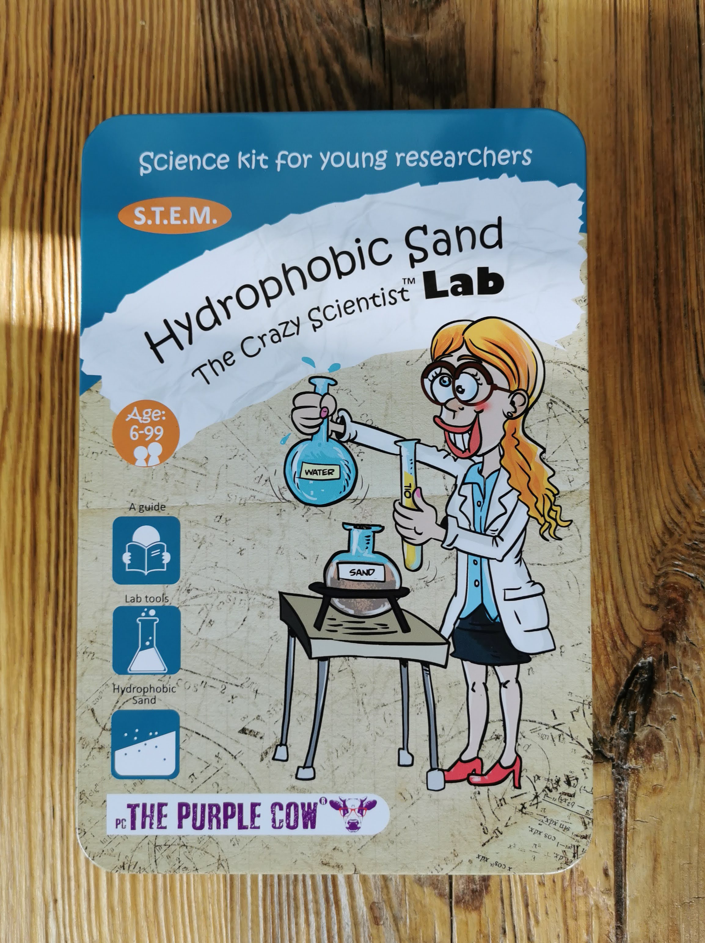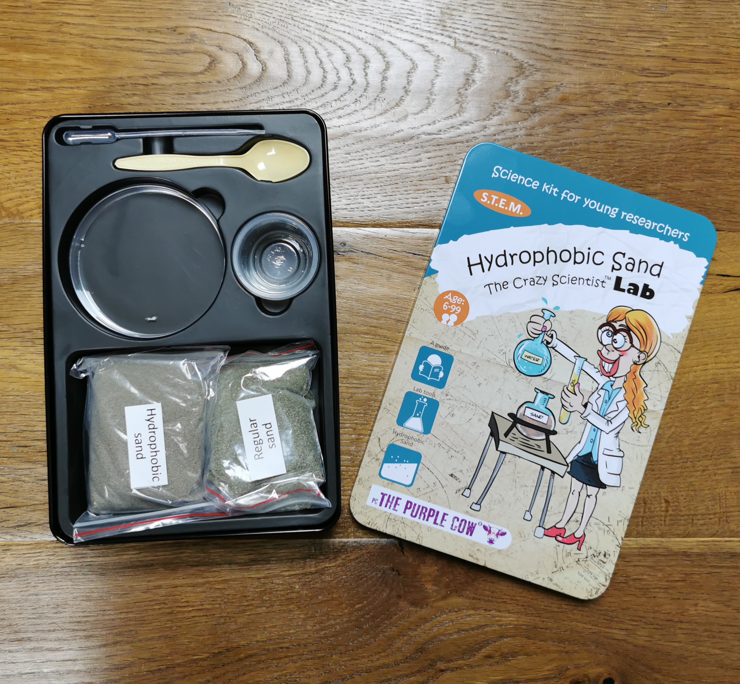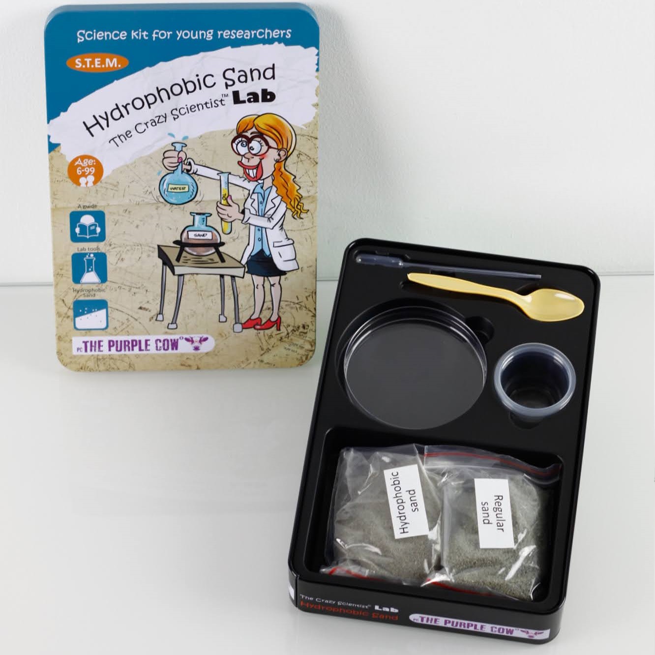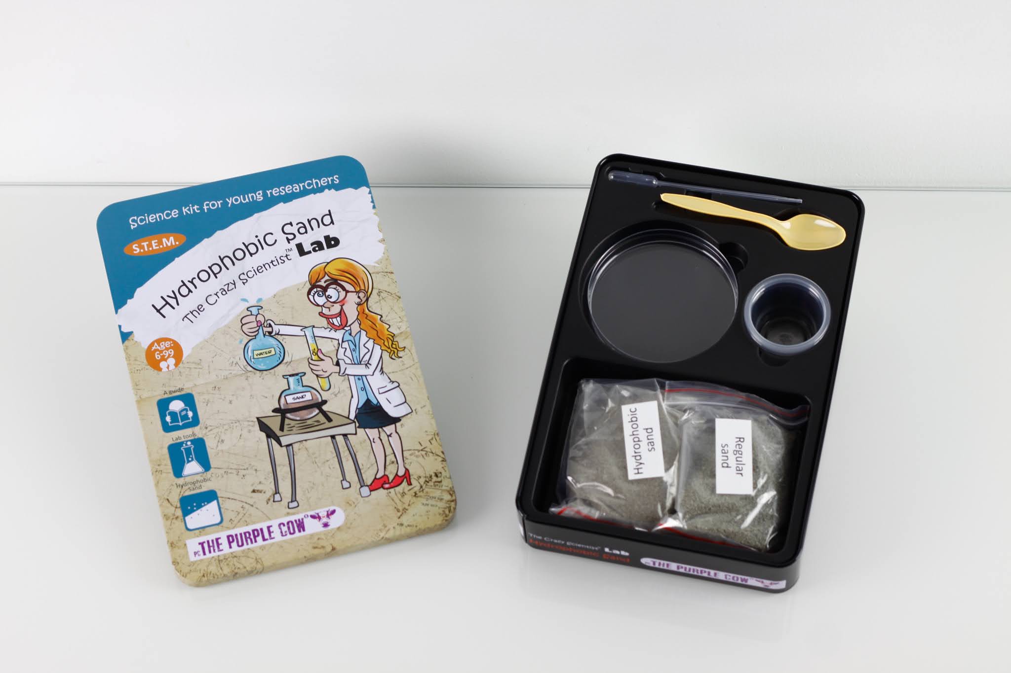 Zestaw do robienia eksperymentów The Purple Cow to nie lada gratka dla małego naukowca. Piasek hydrofobowy swoim wyglądem niczym nie różni się od piasku morskiego, ale dajemy gwarancję, że jest wyjątkowy! Z zestawem eksperymentów Twoje dziecko dowie się jakie właściwości ma piasek hydrofobowy, czym się różni od zwykłego oraz jakie jest jego zastosowanie. Podczas wykonywania doświadczeń mały odkrywca sprawdzi np. czy po wyjęciu z wody piasek pozostaje suchy, w jaki sposób zapobiega katastrofom naturalnym i wiele innych. Zestaw składa się z 10 ekscytujących eksperymentów. W opakowaniu znajdują się wszystkie niezbędne akcesoria z wyjątkiem podstawowych rzeczy użytku domowego (mydło, olej, woda, świeca, itd). Do zestawu dodano instrukcję z fotografiami, na których widnieją poszczególne etapy eksperymentów. Dodatkowo zawarto w niej wiele ciekawych wyjaśnień i faktów naukowych.