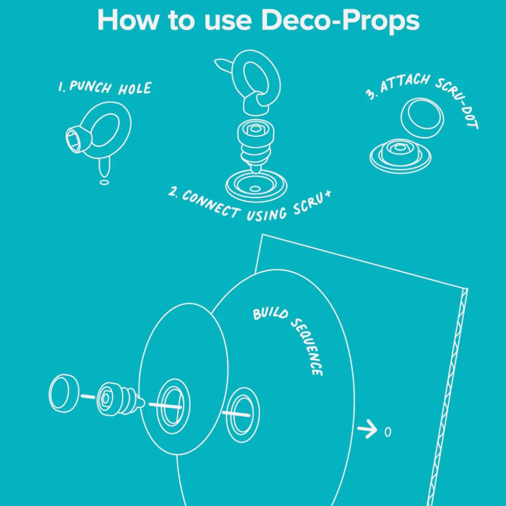 Deco-Props Makedo to kreatywny i kolorowy zestaw dekoracyjny, który wzbogaca każdą kartonową konstrukcję o zabawne detale. Dzięki niemu dzieci mogą nadawać kartonowym projektom indywidualny charakter, zamieniając proste pudełka w pojazdy, postacie lub fantastyczne budowle pełne detali.