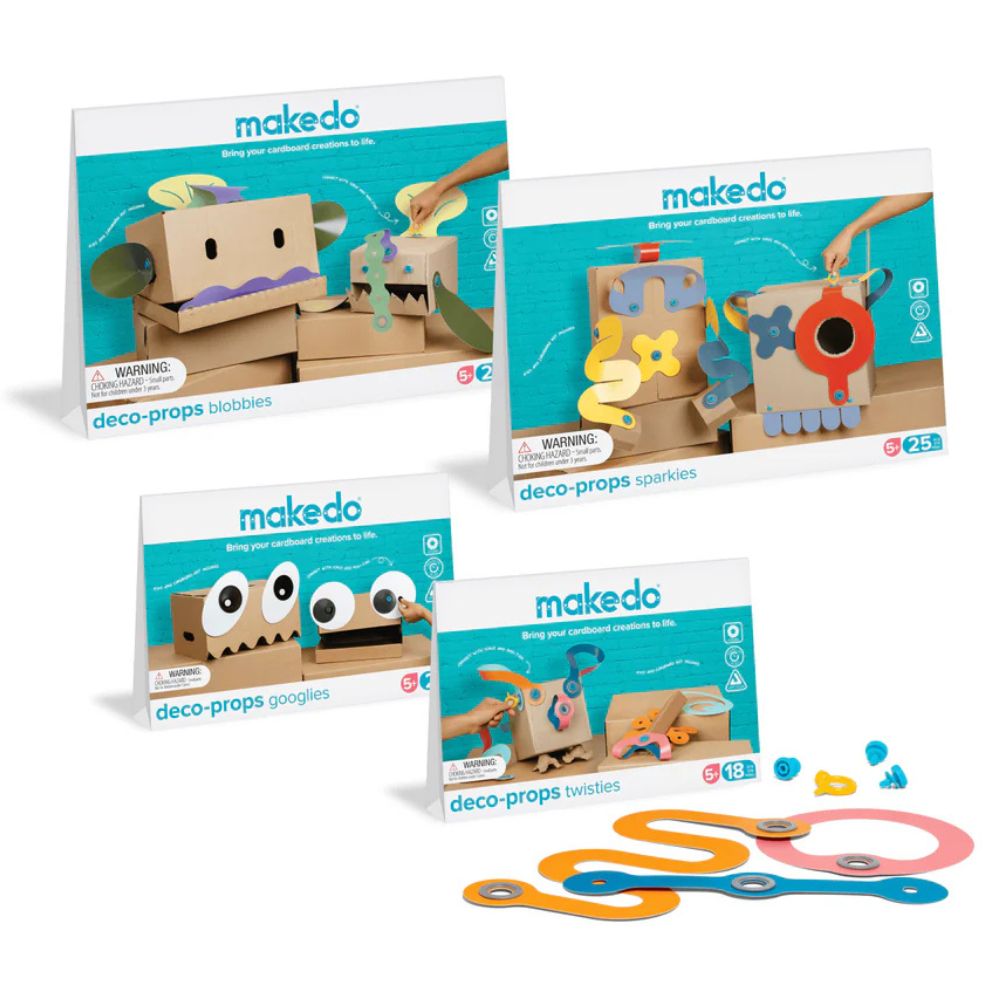 Zestaw Deco-Props Makedo to kreatywny i kolorowy zestaw dekoracyjny, który wzbogaca każdą kartonową konstrukcję o zabawne detale. Dzięki niemu dzieci mogą nadawać kartonowym projektom indywidualny charakter, zamieniając proste pudełka w pojazdy, postacie lub fantastyczne budowle pełne detali.