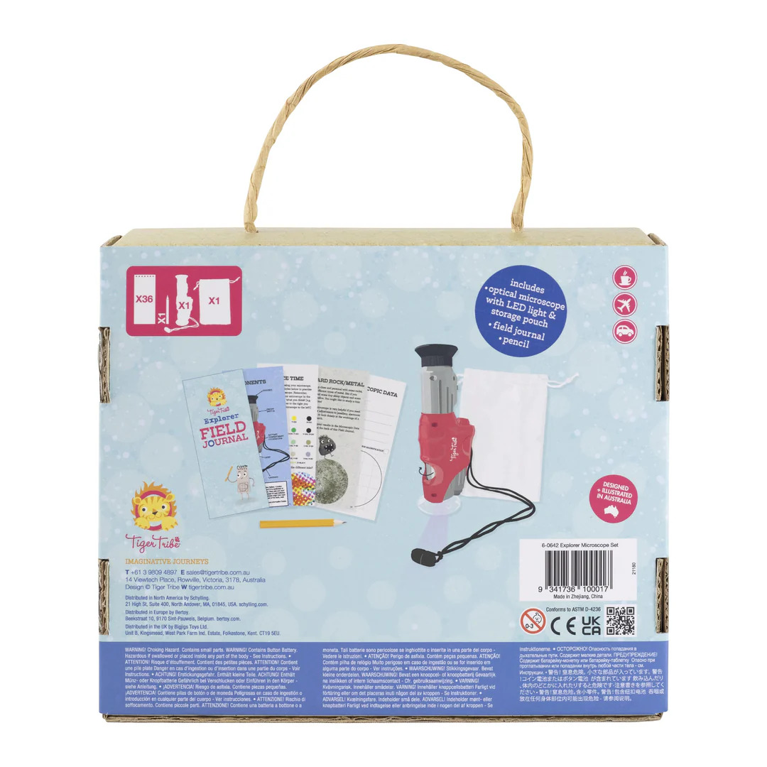 Zestaw Małego Odkrywcy - Mikroskop od Tiger Tribe. Zaprojektowany, aby rozbudzić ciekawość i zachęcić do obserwacji natury. Dzieci pokochają odkrywanie otaczającego je świata dzięki temu zestawowi. Ręczny mikroskop został specjalnie zaprojektowany, aby był lekki do użytku w terenie. Prosty w obsłudze, posiada dwa powiększenia (x20 i x60) oraz zasilane bateryjnie światło LED do oświetlania próbek.