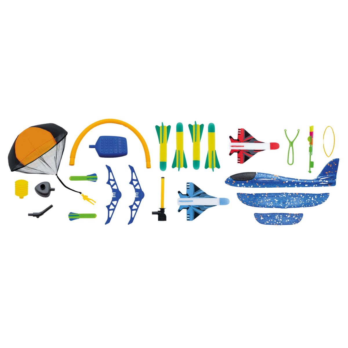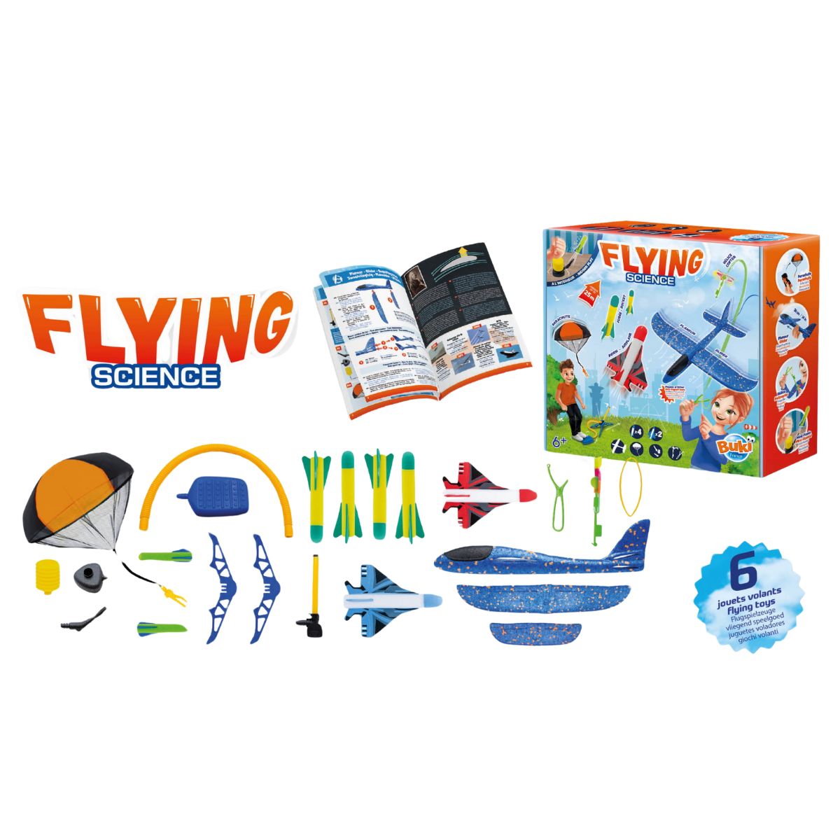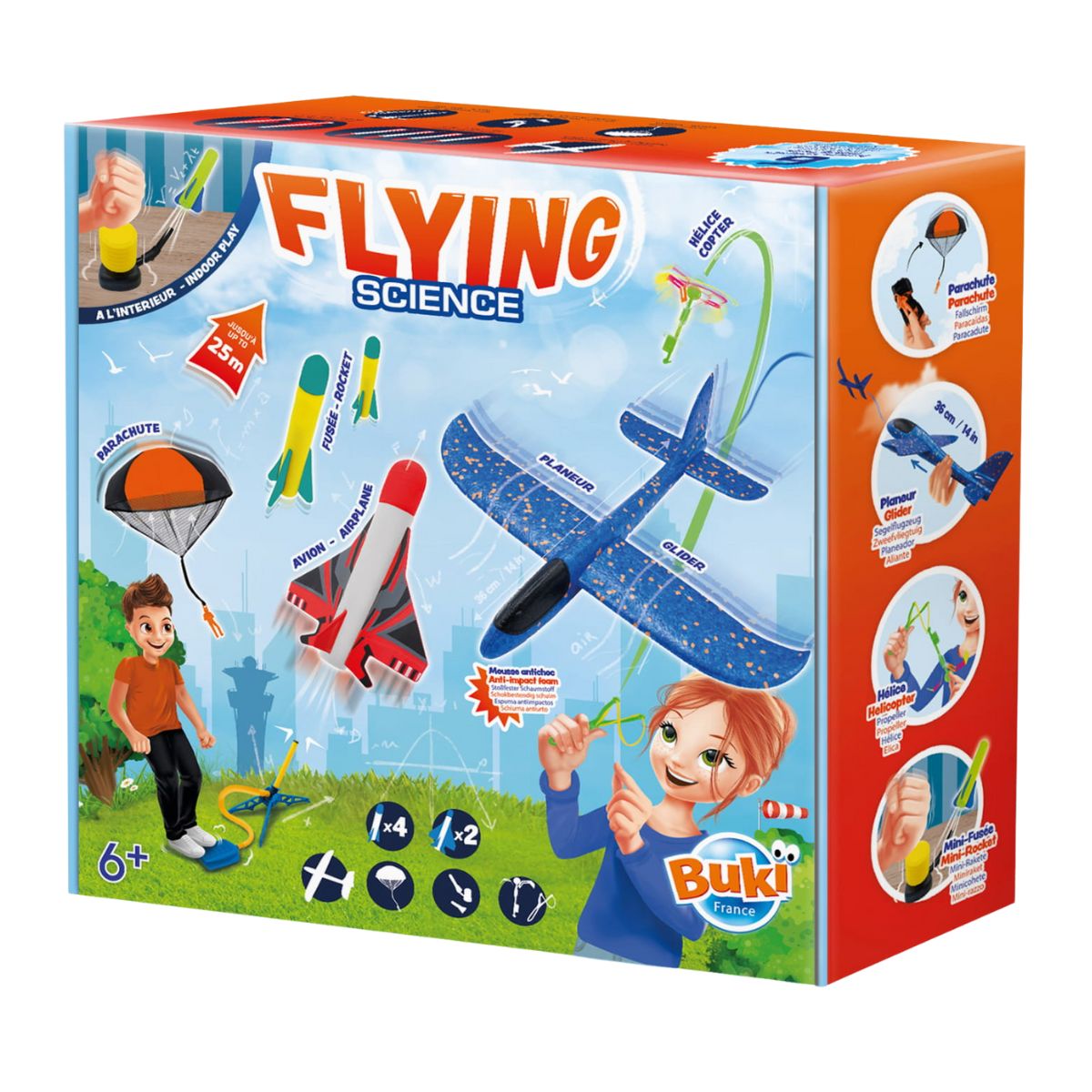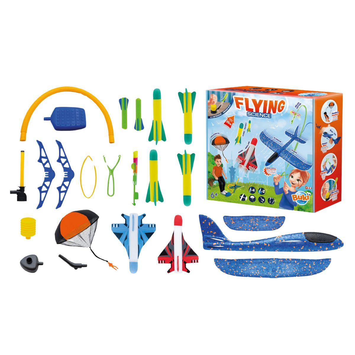 6 rodzajów latających zabawek jest gotowych na testowe loty! Latająca nauka to zestaw zawierający rakiety, odrzutowce, szybowce, spadochrony itp. zabawki, które można wypróbować w locie. Zabawa polega na podłączeniu do pompki nożnej wybranej maszyny, która wystrzelona, poszybuje na wysokość nawet 25 metrów! Wyrzutnię można ustawiać pod różnym kątem i próbować wystrzelić maszynę jak najwyżej. W zależności od siły nacisku stopy na pompkę, zabawka wzniesie się na określoną wysokość i nabierze określonej prędkości.