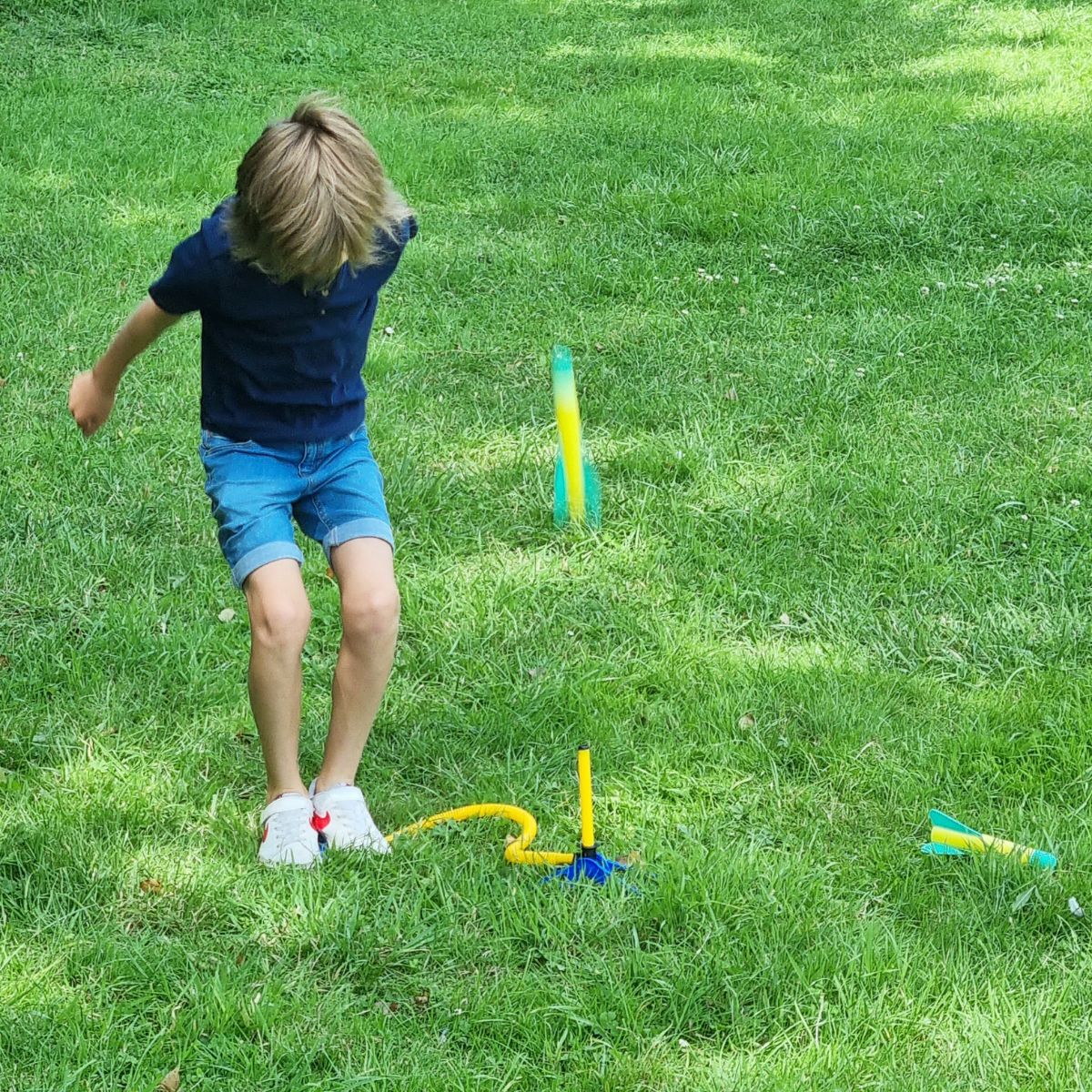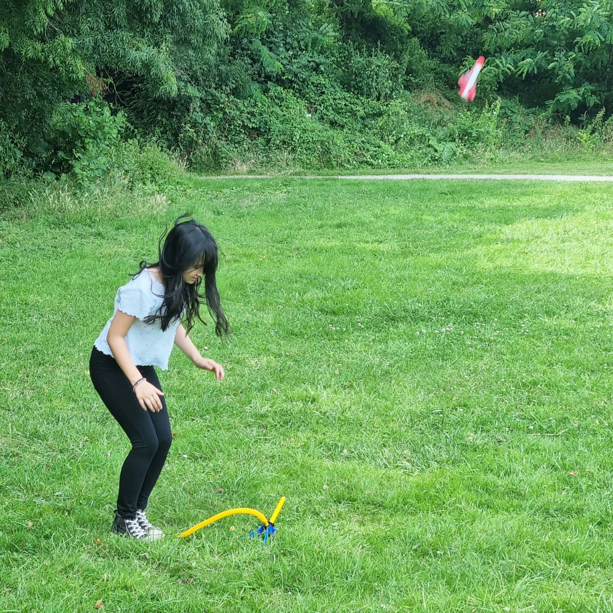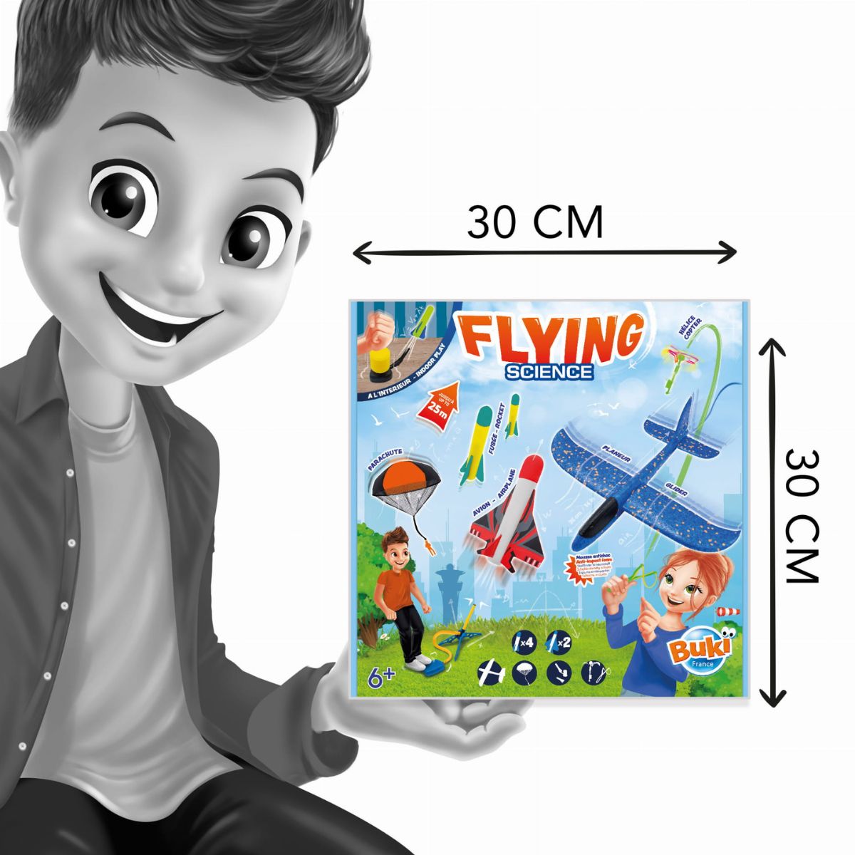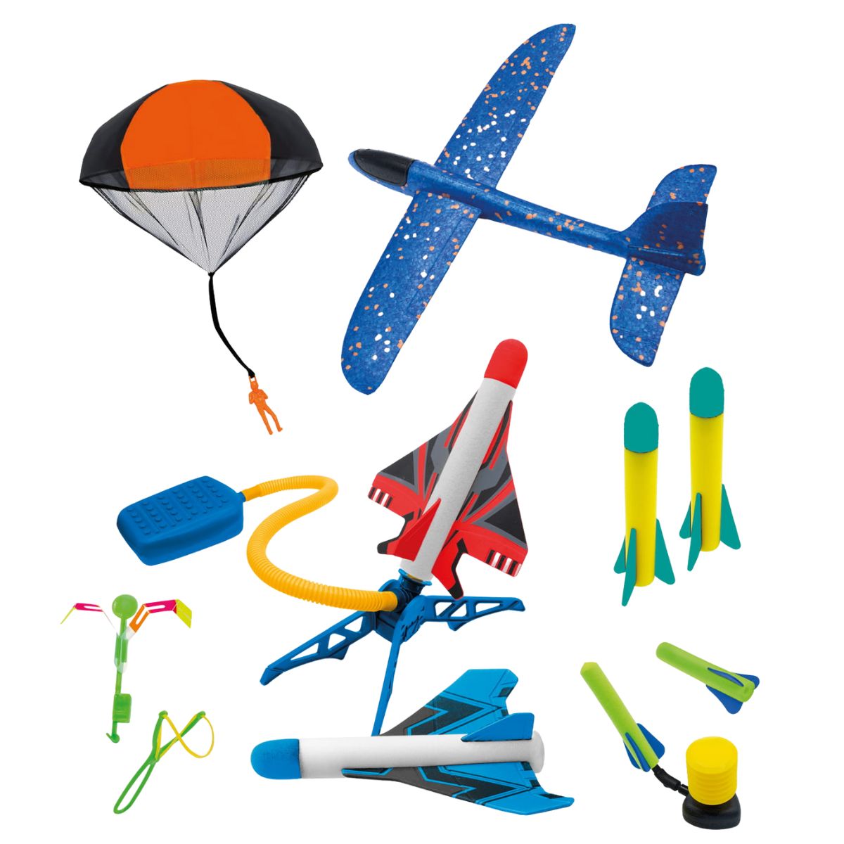6 rodzajów latających zabawek jest gotowych na testowe loty! Latająca nauka to zestaw zawierający rakiety, odrzutowce, szybowce, spadochrony itp. zabawki, które można wypróbować w locie. Zabawa polega na podłączeniu do pompki nożnej wybranej maszyny, która wystrzelona, poszybuje na wysokość nawet 25 metrów! Wyrzutnię można ustawiać pod różnym kątem i próbować wystrzelić maszynę jak najwyżej. W zależności od siły nacisku stopy na pompkę, zabawka wzniesie się na określoną wysokość i nabierze określonej prędkości.
