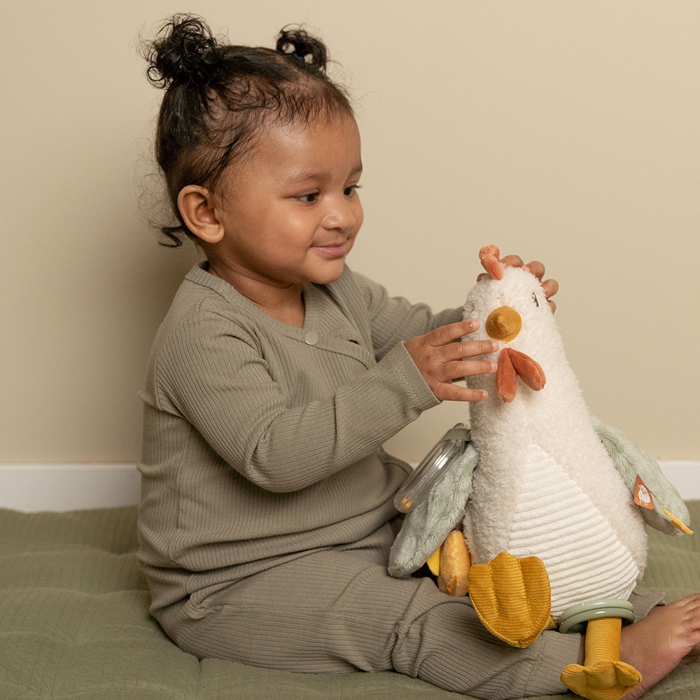 Ten uroczy kurczaczek wykonany jest z mięciutkiego, przyjemnego pluszu. Posiada wiele atrakcji do odkrycia. Znajdziecie tu lusterko, grzechotkę, gryzak oraz różne metki - tak uwielbiane przez maluchy! Jest zaprojektowany w taki sposób, by pomagać ćwiczyć umiejętności motoryczne Twojego maluszka w trakcie zabawy. Świetna, rozwijająca zabawa gwarantowana!