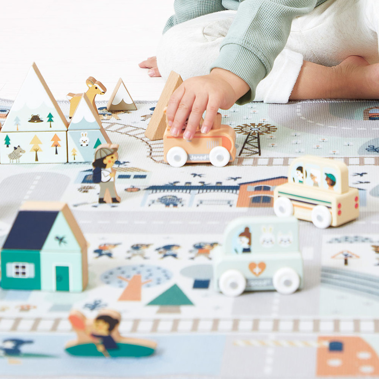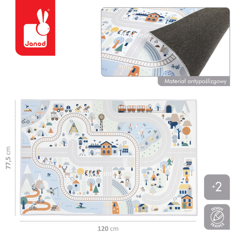 Mata pozwala na tworzenie wielu scenariuszy zabaw. Można do niej dokupić pojazdy oraz zestaw klocków z tej samej kolekcji, a także uzupełnić ją innymi matami z serii (wszystkie do siebie pasują). Zaprojektowana we Francji. Idealnie nadaje się na prezent.