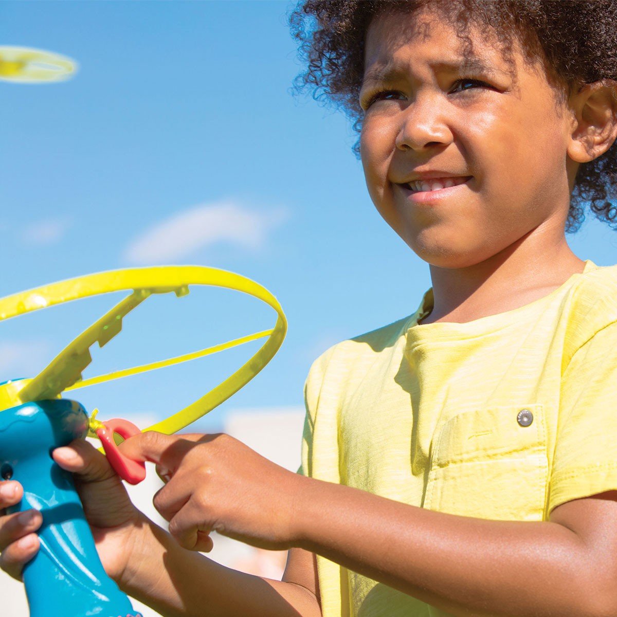 Rozświetl niebo wirującymi i kolorowymi światłami. Zabawka Latające śmigło - dysk z kolorowym światłem B. Toys sprzyja aktywności na świeżym powietrzu – atrakcja dla dużych i małych. Łatwa w obsłudze – śmigło montuje się na wyrzutni, a dysk wprawia w ruch (lot) poprzez pociągnięcie linki. Podczas lotu dysk emituje ładne, kolorowe światło – ciekawy efekt wizualny zachwyci nie tylko dzieci. Do zabawy w pojedynkę lub w grupie.
