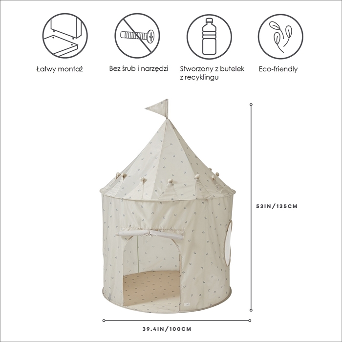 Odkryj idealne miejsce do zabawy, przestrzeń do czytania, relaksu i odpoczynku. Namiot tworzy przytulne i magiczne otoczenie, które dzieci pokochają. Jest to specjalny dodatek dekoracyjny do pokoju dziecięcego, wprowadzający wyjątkowy urok i oryginalny styl. Siateczkowe okna i drzwi można dowolnie odsłaniać i zasłaniać. Namiot został starannie zaprojektowany, aby zapewnić stabilność i wygodę podczas użytkowania. Posiada solidną ramę, która utrzymuje go w stabilnej pozycji, nawet podczas intensywnej zabawy. Dzięki lekkiej konstrukcji namiot można z łatwością przenosić i rozkładać w różnych miejscach. Namiot został wykonany z poliestru pochodzącego z recyklingu. Materiał ten jest zarówno przyjemny w dotyku, jak i odporny na codzienne zużycie.