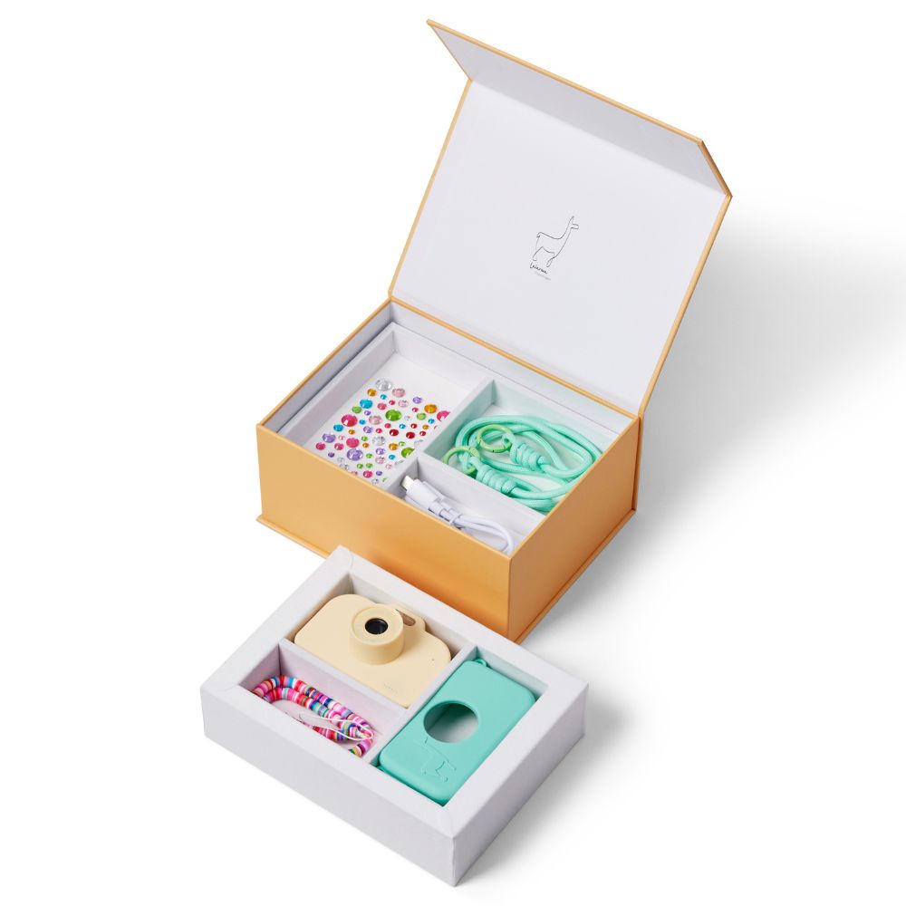 Miękka, silikonowa obudowa w kolorze miętowym sprawia, że aparat wygodnie leży w małych dłoniach, a dołączone diamentowe naklejki i uroczy brelok pozwalają ozdobić go tak, jak podpowiada wyobraźnia. W zestawie znajduje się także urocze pudełeczko na skarby, dzięki którym dziecko może przechowywać zarówno aparat, jak i swoje ulubione drobiazgi.
