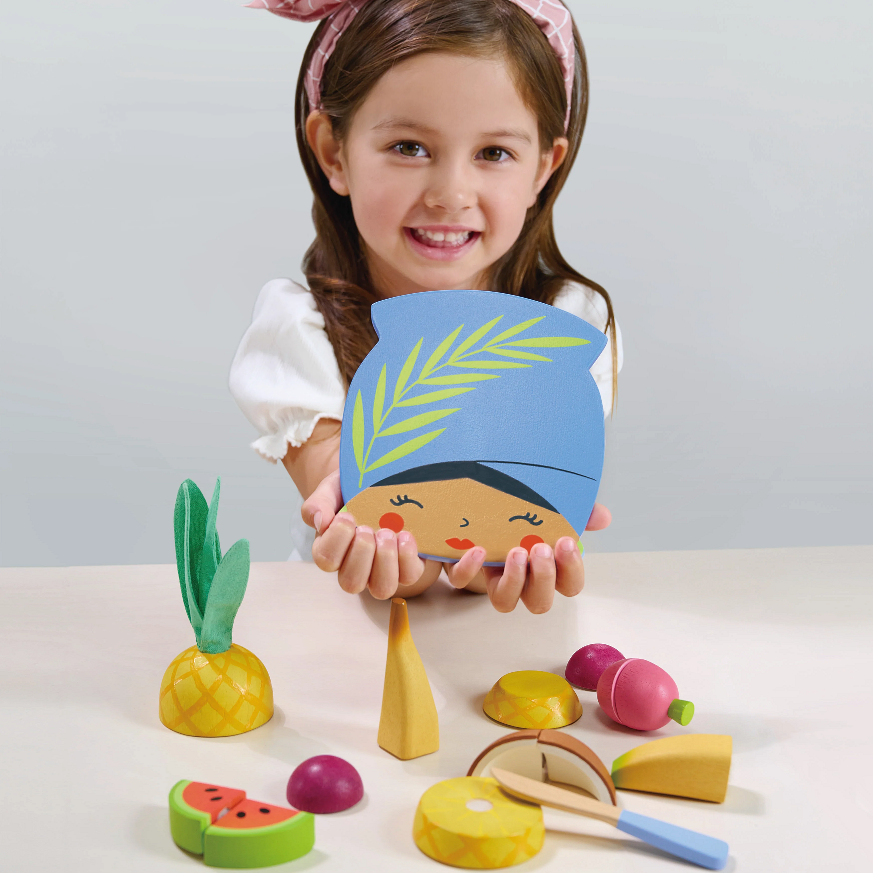 Kreatywna zabawa w kuchni dla dzieci! W pudełeczku znajdziemy drewnianą deskę do krojenia, mały niebieski nóż i mnóstwo pysznych owoców tropikalnych - ananasa w 3 częściach, arbuza, kokosa, banana, marakuje i smoczy owoc w 2 częściach. Całość zapinana jest na rzep, co pozwala na łatwe krojenie i składanie owoców. Drewniane elementy wykonane są z wysokiej jakości materiałów, co zapewnia bezpieczeństwo i długotrwałość zabawki. Zestaw doskonale współgra z innymi akcesoriami od Tender Leaf Toys, tworząc całą kolekcję zabawek dla dzieci. Daj swojemu dziecku niezapomnianą zabawę i edukację o smakowitych owocach tropikalnych z drewnianym zestawem do krojenia!