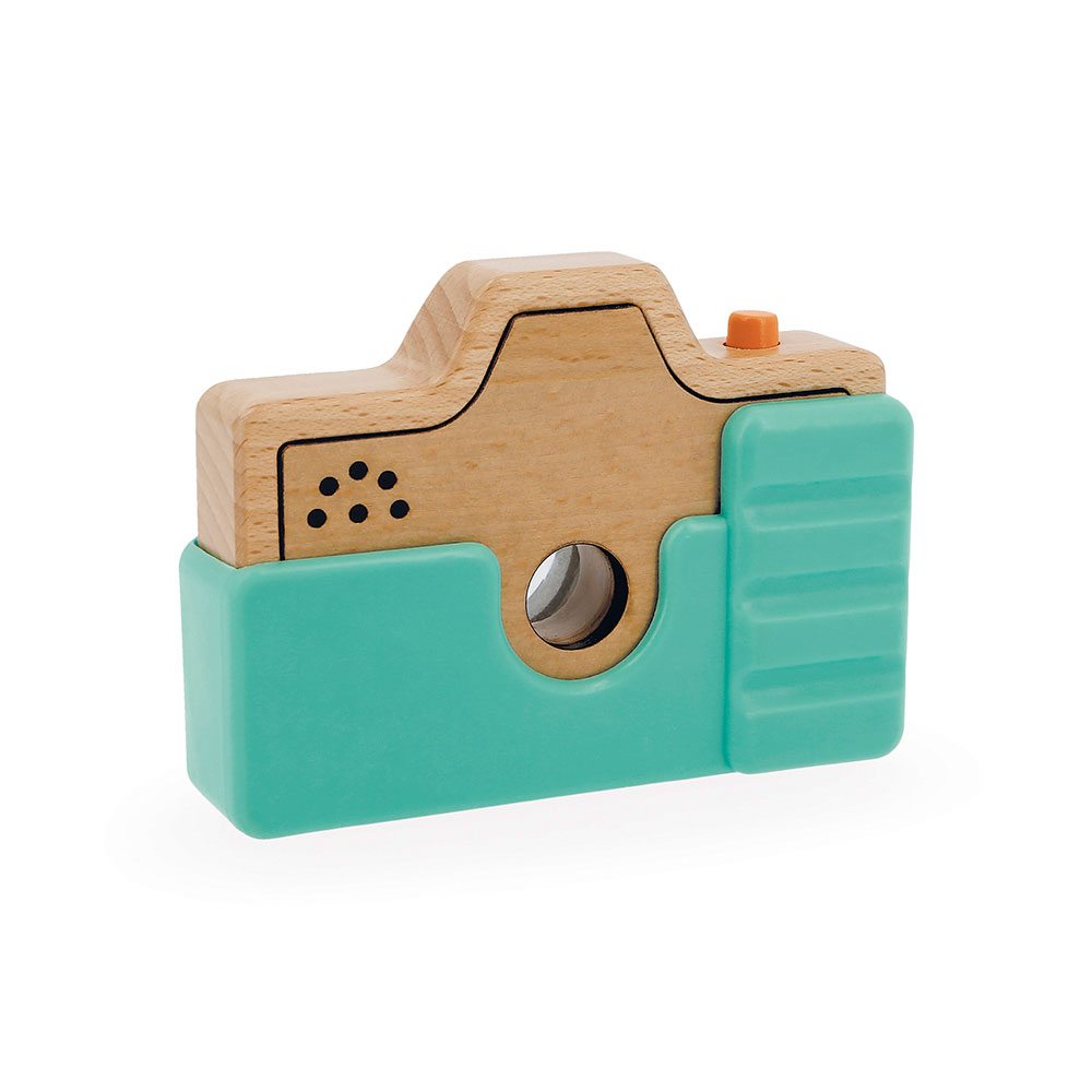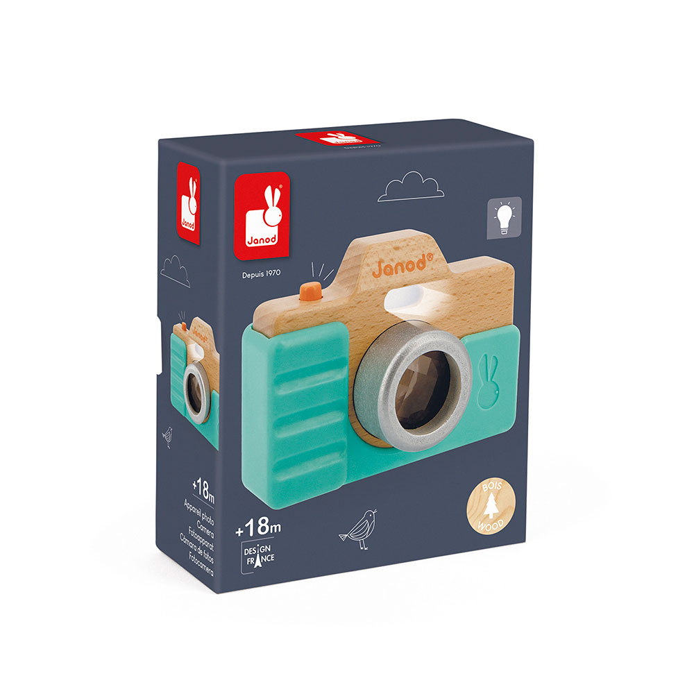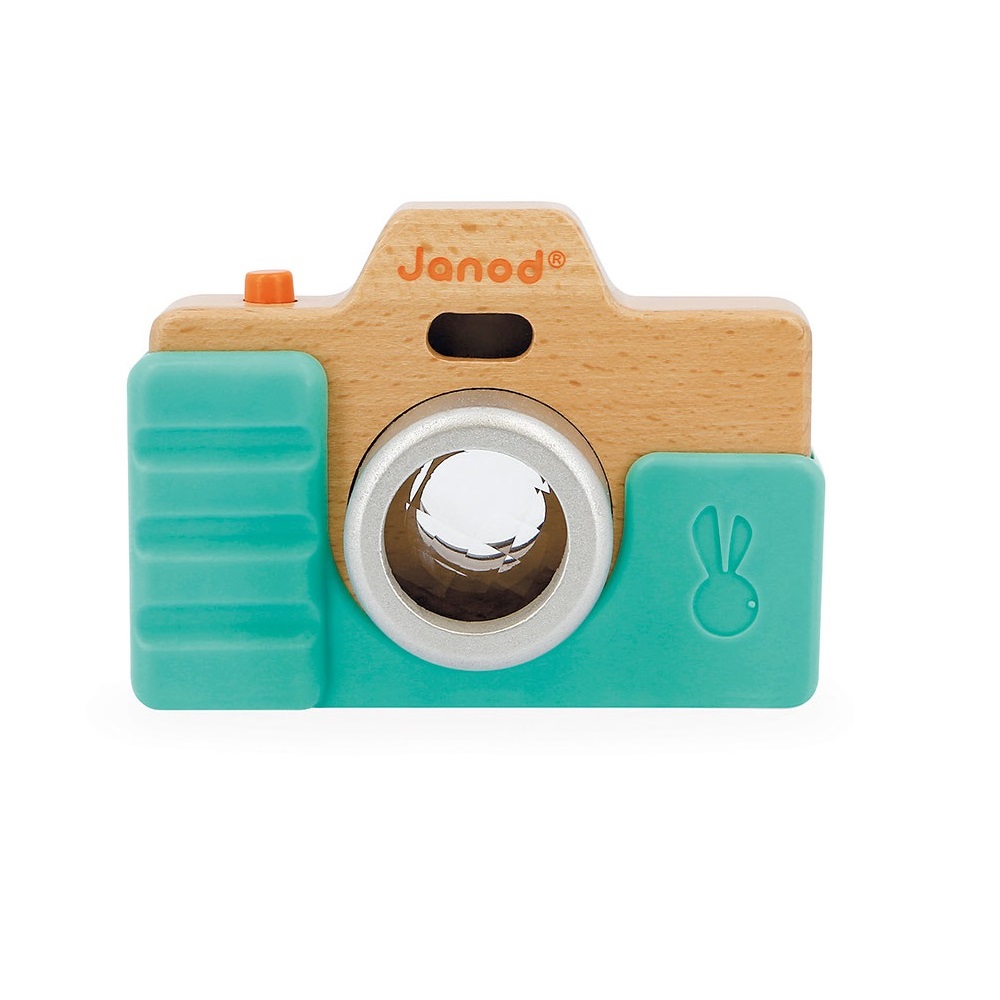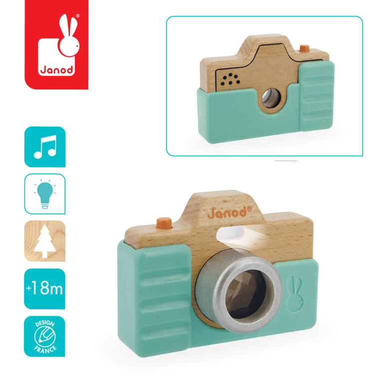 Drewniany aparat od JANOD to idealny prezent dla małego fana fotografii. Został bardzo estetycznie wykonany, z dbałością o wszystkie detale. Ma zdejmowaną silikonową obudowę w kolorze jasno turkusowym, obracany obiektyw-kalejdoskop, spust migawki, którego naciśnięcie wywołuje charakterystyczny dla prawdziwego aparatu dźwięk, a nawet lampę błyskową. W zestawie załączone są 3 baterie LR44.