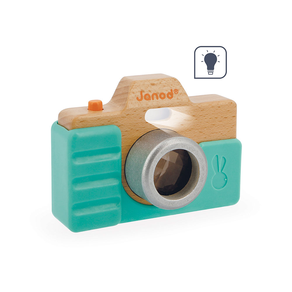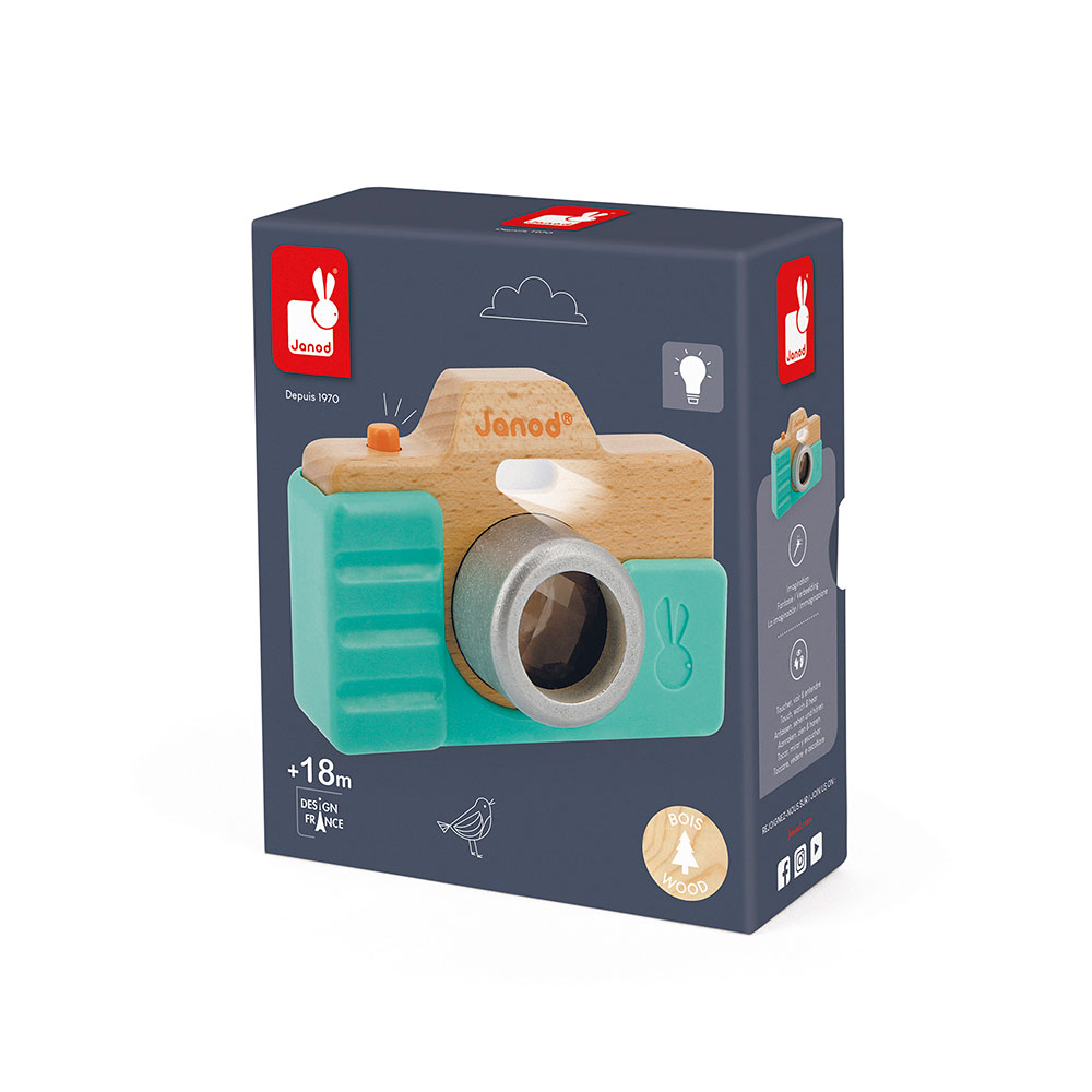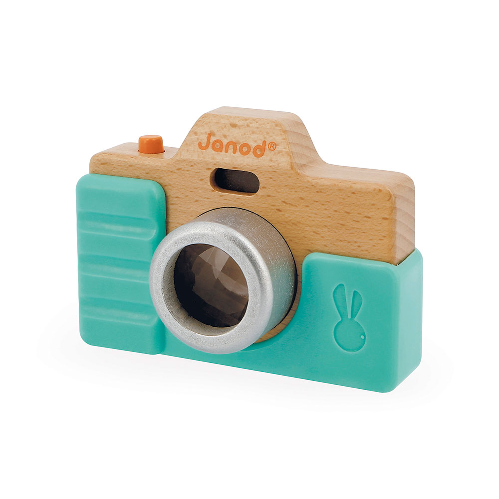 Drewniany aparat od JANOD to idealny prezent dla małego fana fotografii. Został bardzo estetycznie wykonany, z dbałością o wszystkie detale. Ma zdejmowaną silikonową obudowę w kolorze jasno turkusowym, obracany obiektyw-kalejdoskop, spust migawki, którego naciśnięcie wywołuje charakterystyczny dla prawdziwego aparatu dźwięk, a nawet lampę błyskową. W zestawie załączone są 3 baterie LR44.