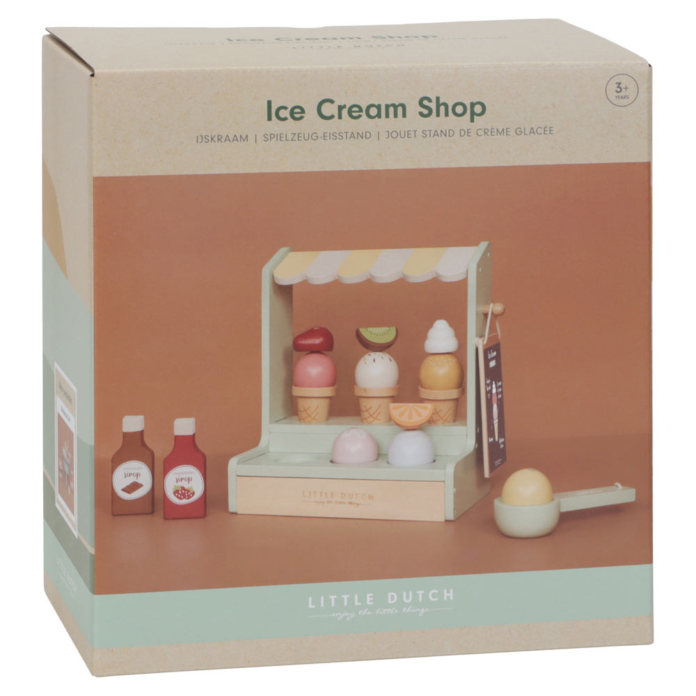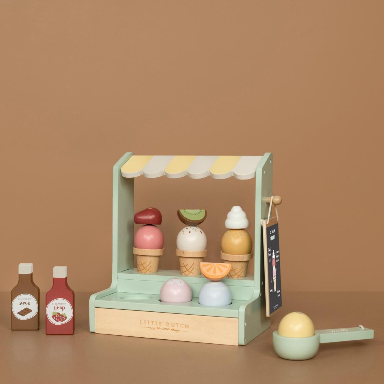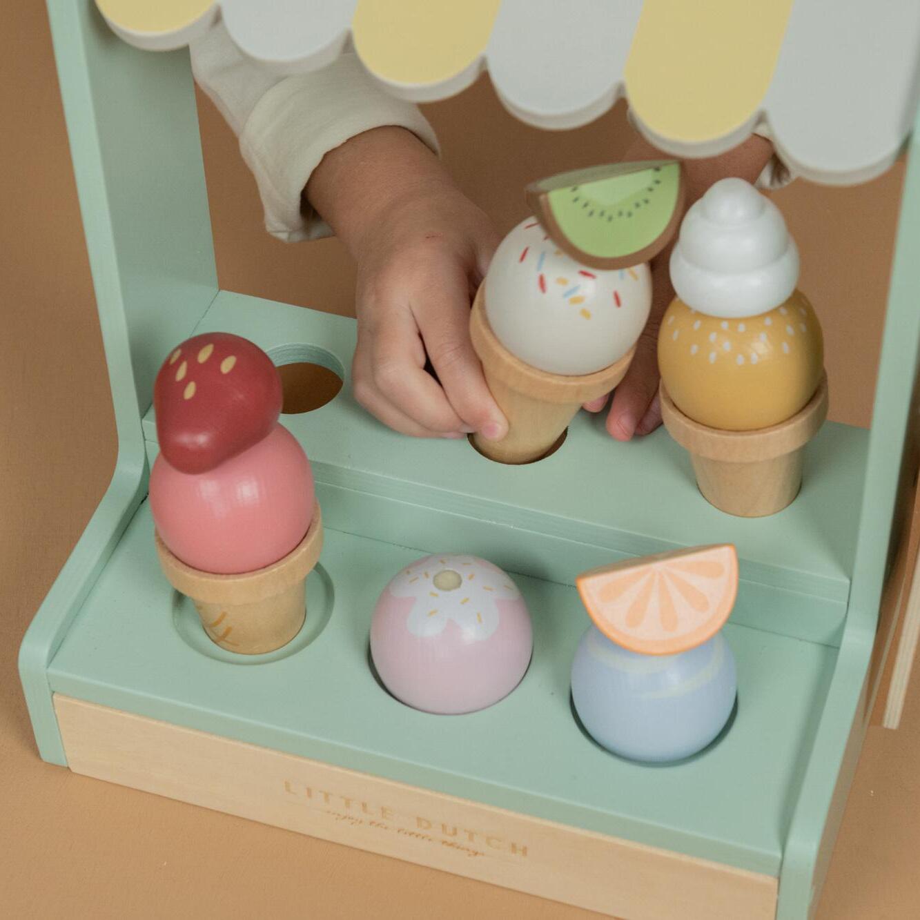 Jaki jest Twój ulubiony smak lodów? Wanilia czy truskawka? Ta lodziarnia z uroczą żółto-białą markizą zaprasza do spróbowania wszystkich sześciu smaków lodów. W zestawie znajdują się trzy rożki do wypełnienia lodami, a zabawę można uatrakcyjnić różnymi kolorowymi dodatkami.