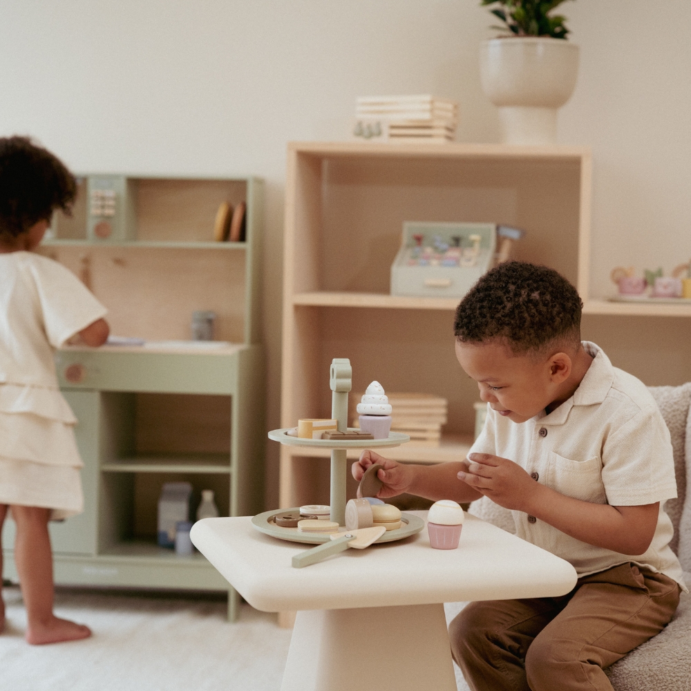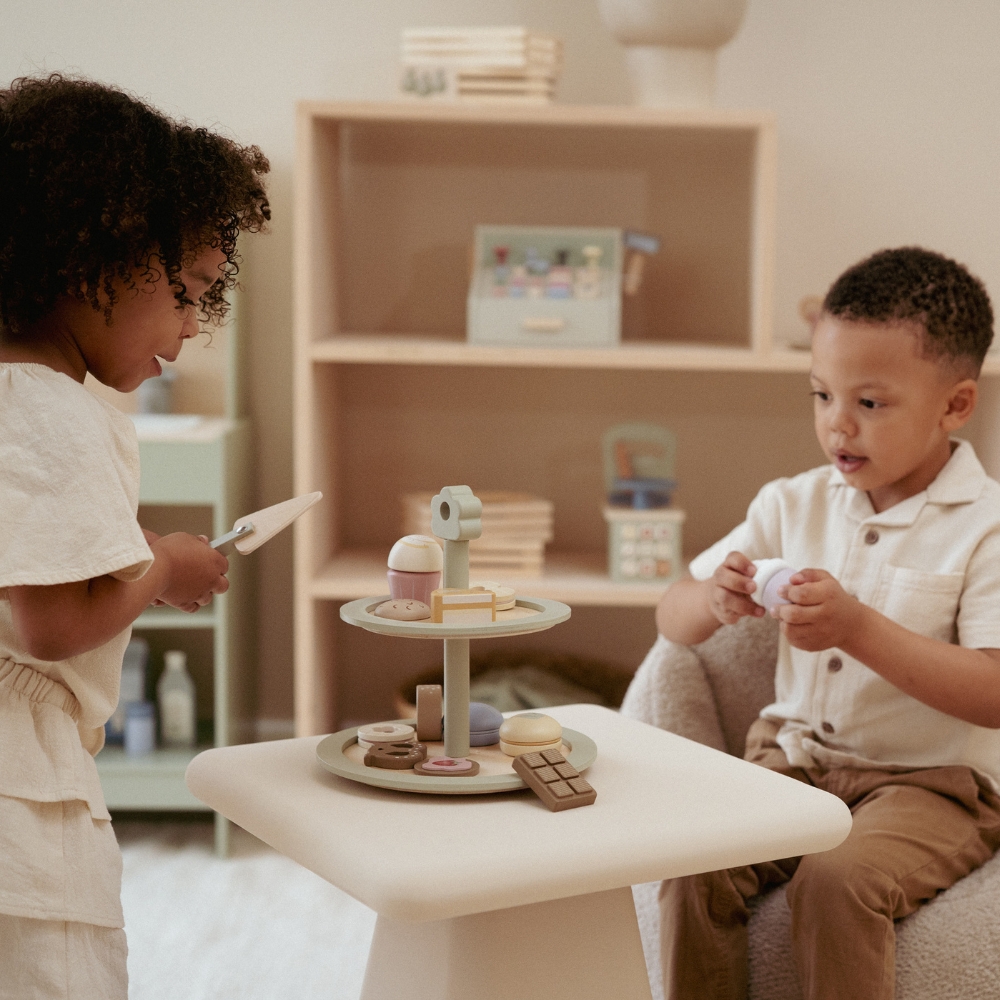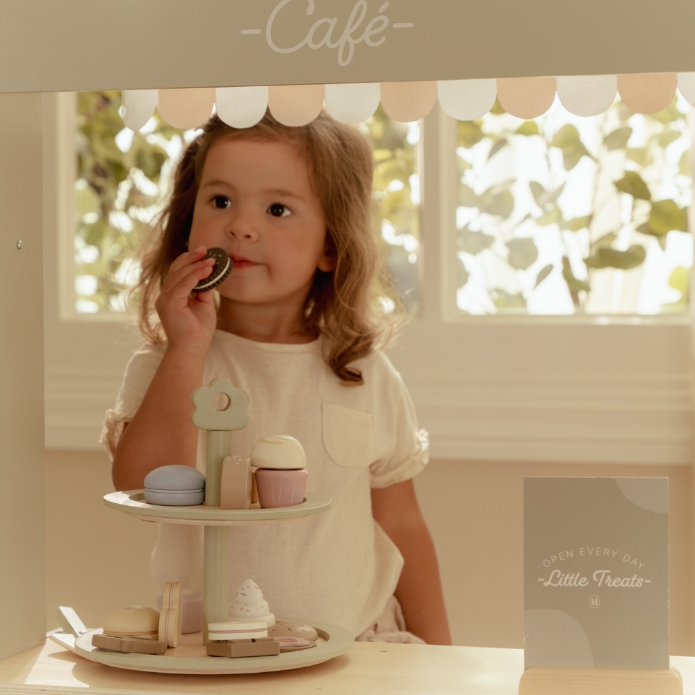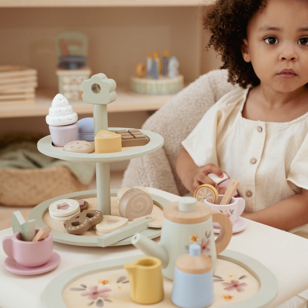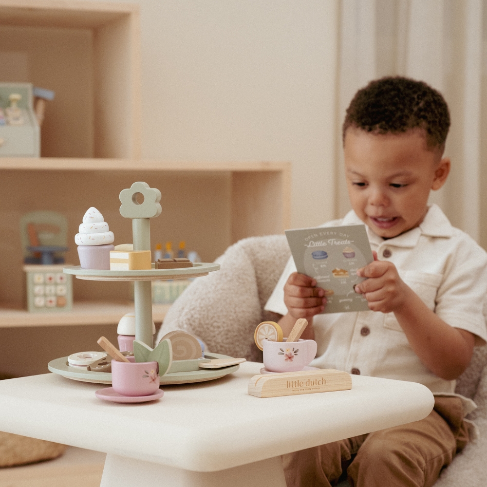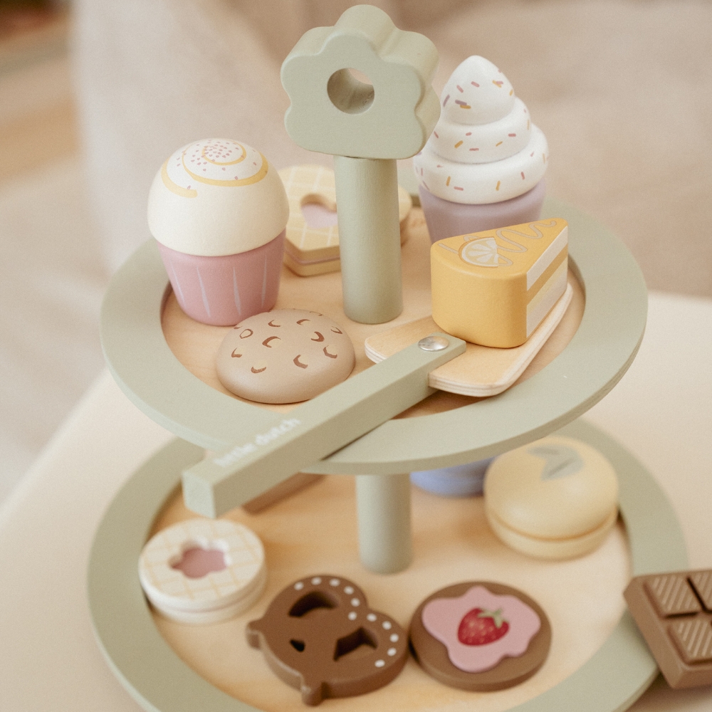 Zaproś swoich pluszowych gości na wyjątkowe przyjęcie! Piętrowa, drewniana patera od Little Dutch to prawdziwa uczta dla małych miłośników zabawy w dom i cukiernię. W zestawie znajdziesz apetycznie wyglądające ciasteczka w różnych kształtach i kolorach, szpatułkę do serwowania oraz papierowe menu – jak w prawdziwej kawiarni!
