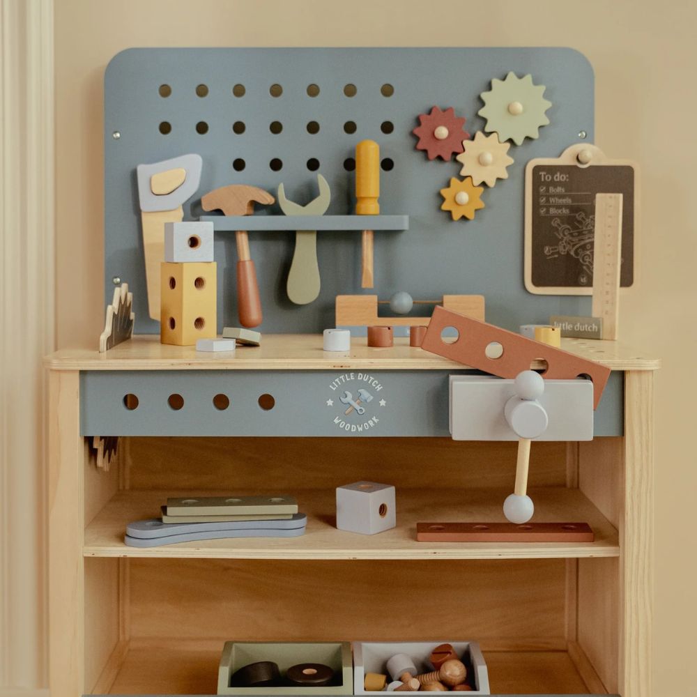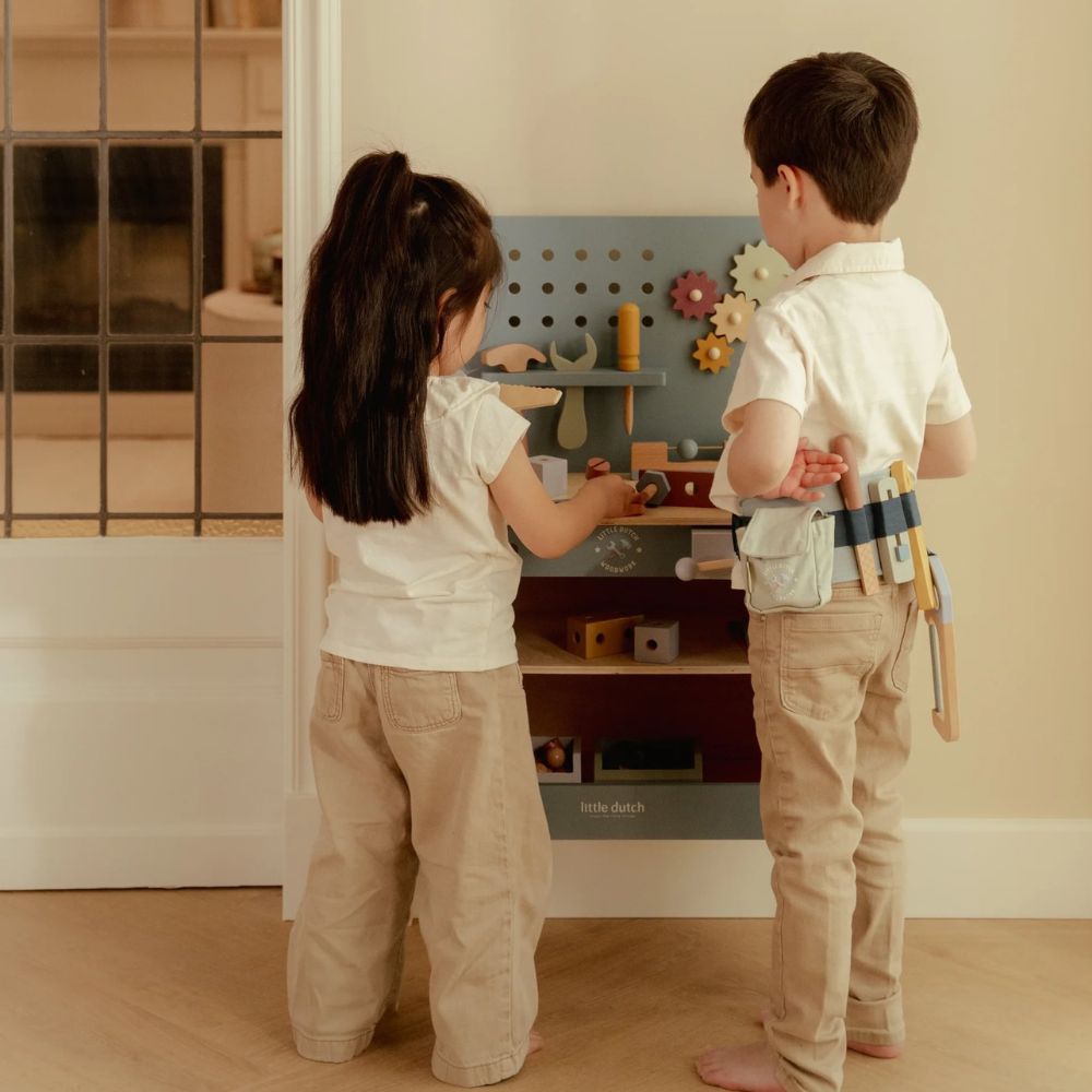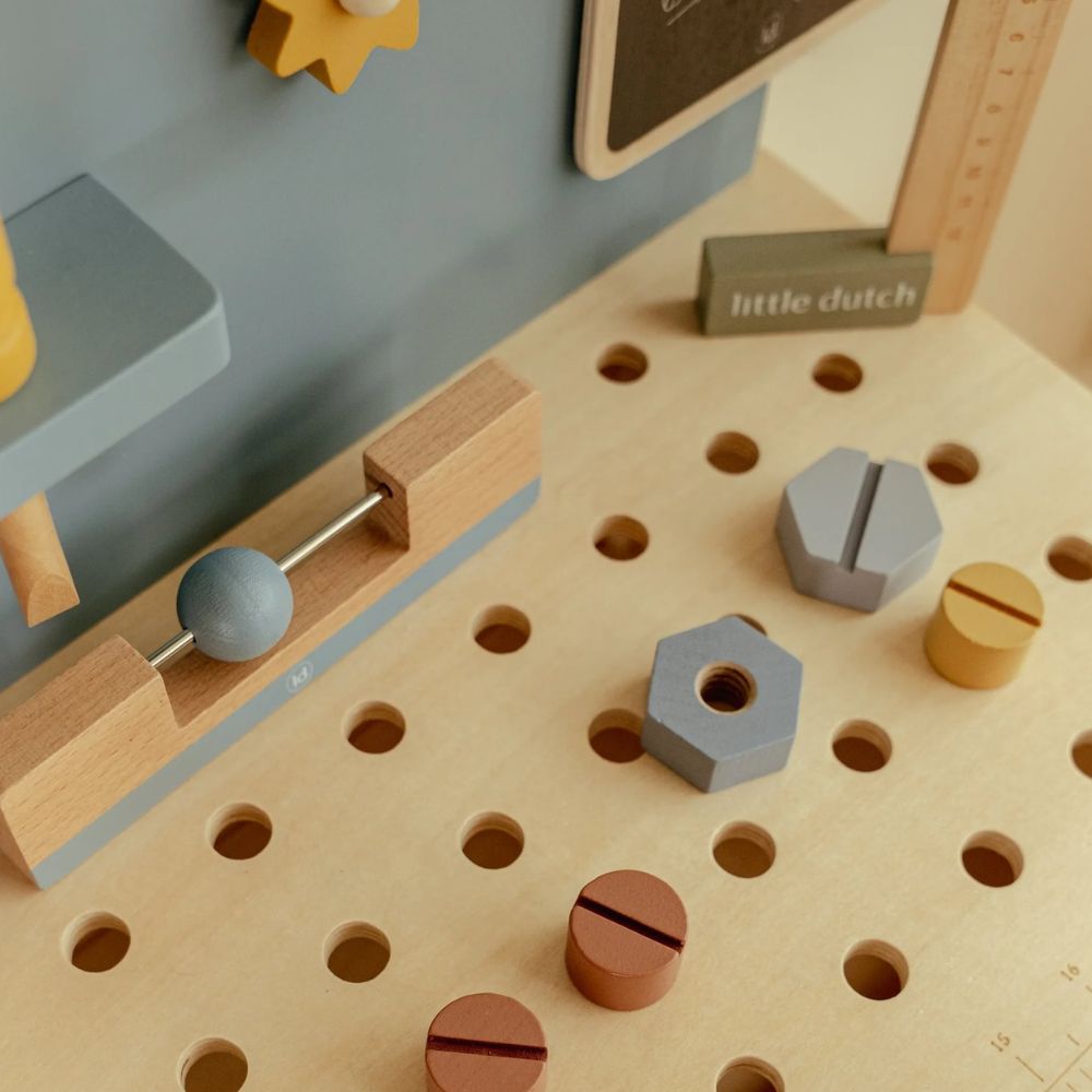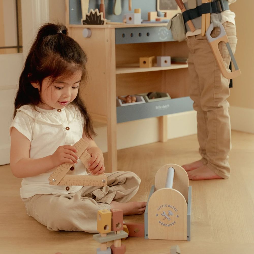 Drewniany warsztat z narzędziami Little Dutch to wymarzona zabawka dla każdego małego majsterkowicza! Dzięki niemu dzieci mogą naprawiać, konstruować i wymyślać własne projekty, rozwijając przy tym zdolności manualne oraz wyobraźnię. To świetny pomysł na prezent dla 3-latka, który pokocha skręcanie, piłowanie i budowanie. Warsztat utrzymany jest w nowej, pastelowej kolorystyce, charakterystycznej dla marki Little Dutch, i wykonany z drewna z certyfikatem FSC – bezpiecznego i ekologicznego materiału.