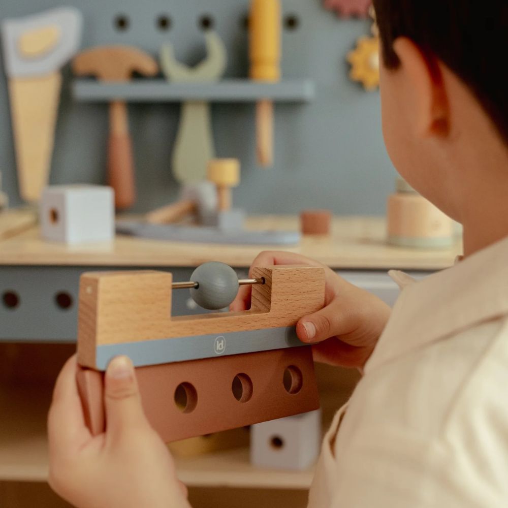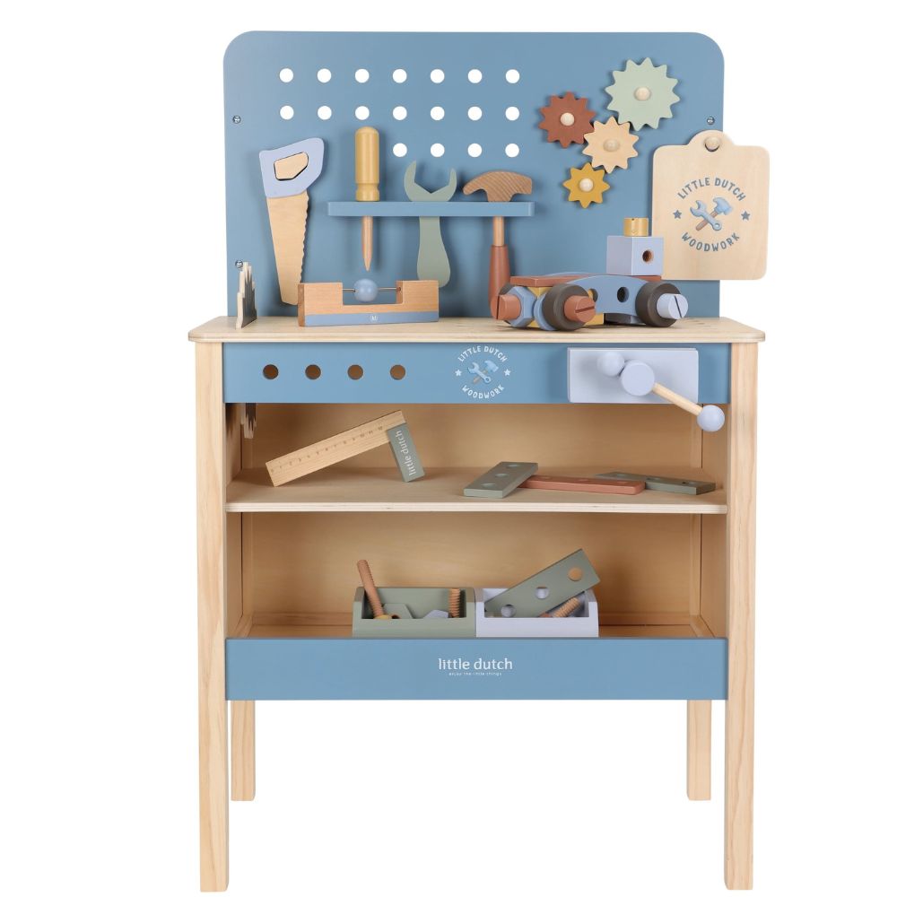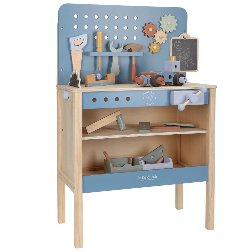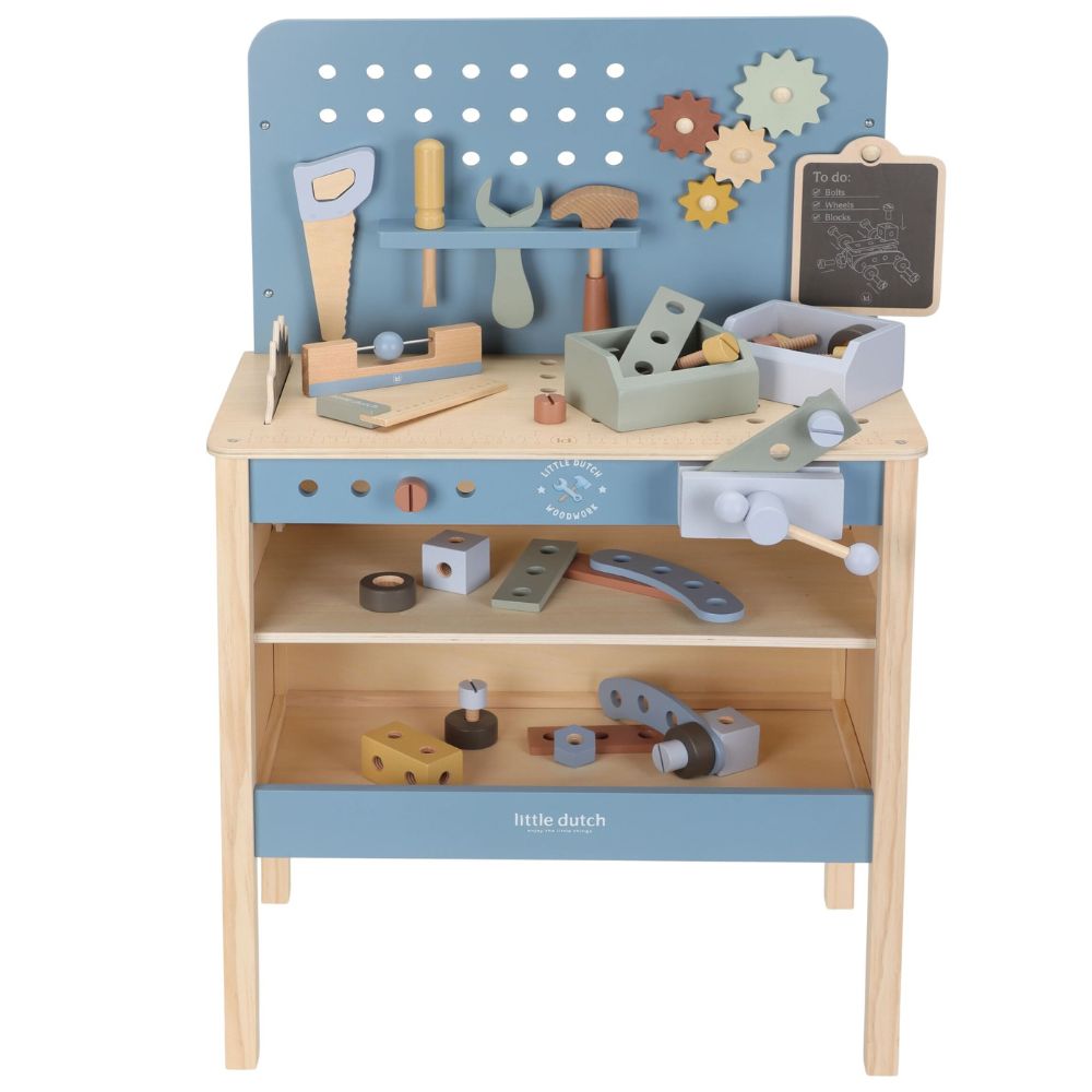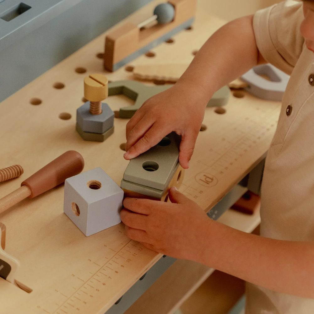 Drewniany warsztat z narzędziami Little Dutch to wymarzona zabawka dla każdego małego majsterkowicza! Dzięki niemu dzieci mogą naprawiać, konstruować i wymyślać własne projekty, rozwijając przy tym zdolności manualne oraz wyobraźnię. To świetny pomysł na prezent dla 3-latka, który pokocha skręcanie, piłowanie i budowanie. Warsztat utrzymany jest w nowej, pastelowej kolorystyce, charakterystycznej dla marki Little Dutch, i wykonany z drewna z certyfikatem FSC – bezpiecznego i ekologicznego materiału.