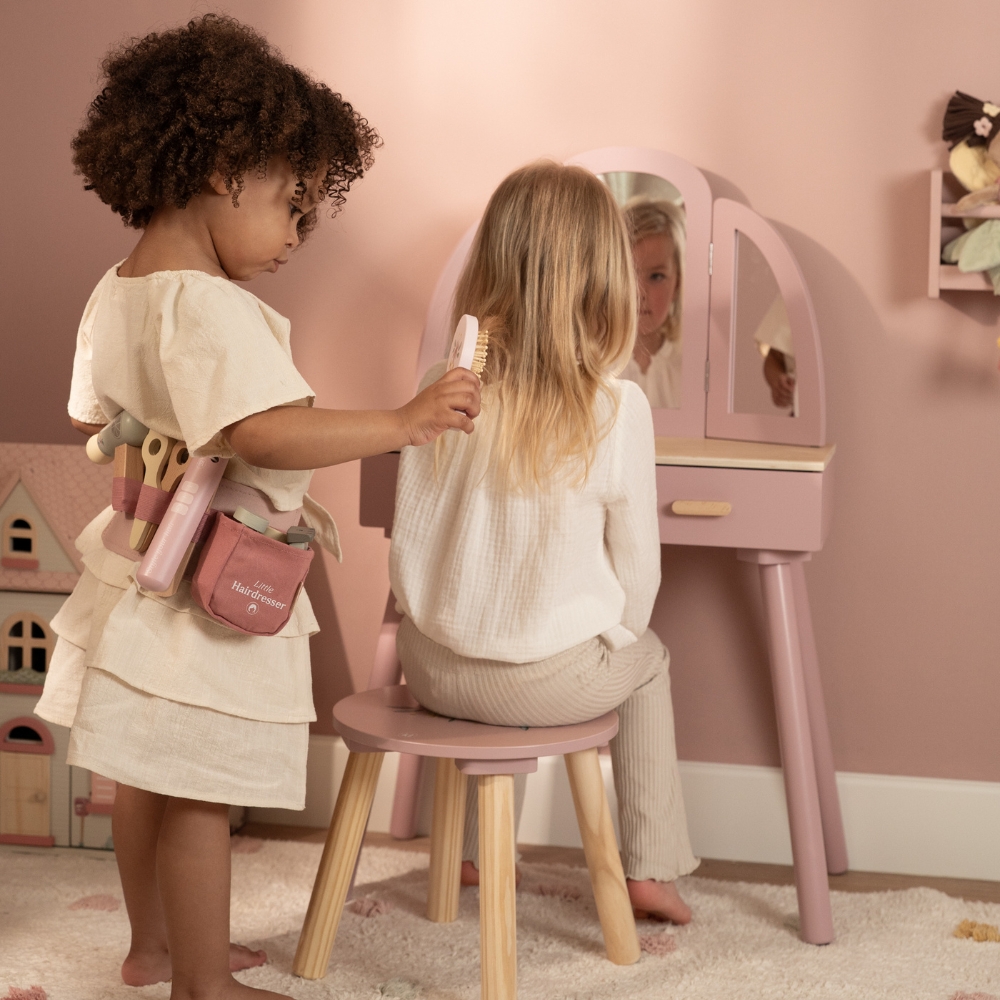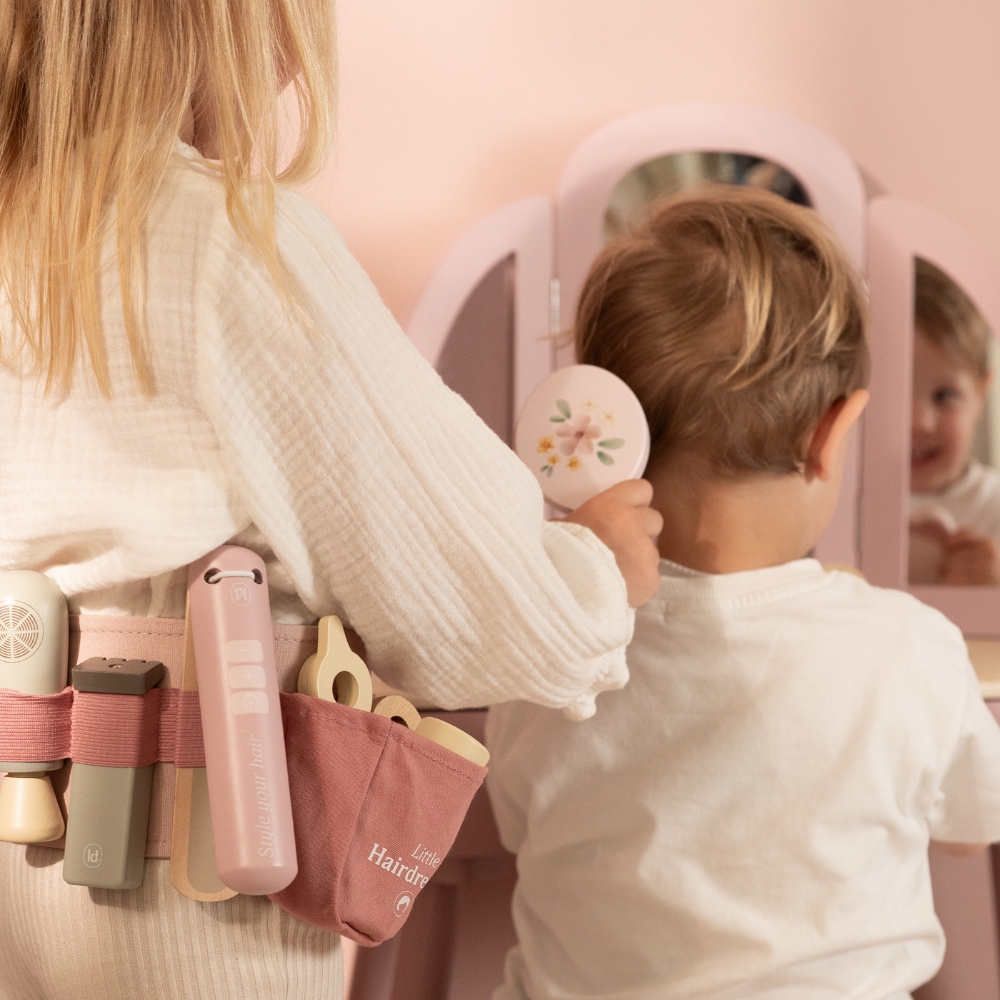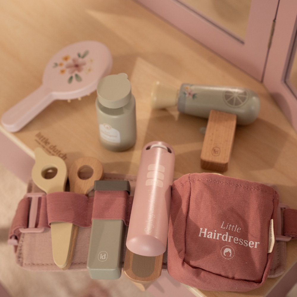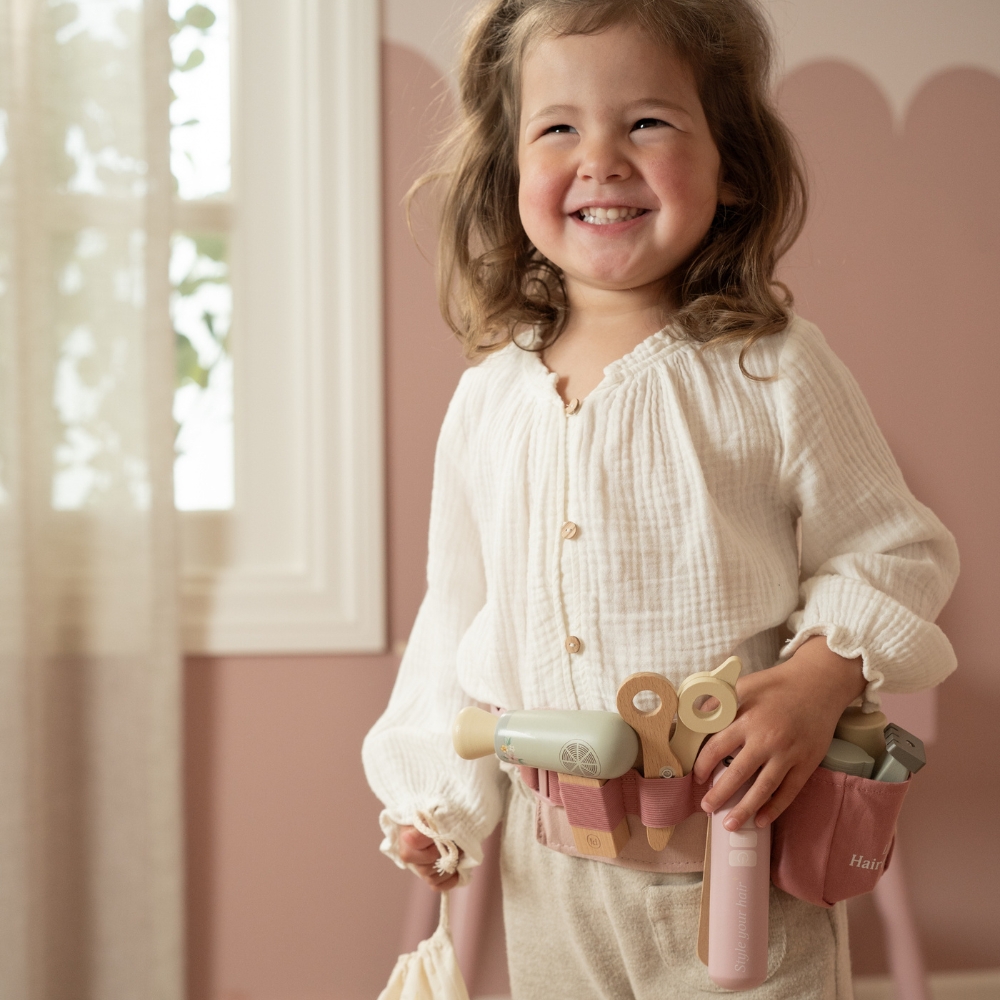Twoje dziecko marzy o własnym salonie fryzjerskim? Zestaw fryzjerski od Little Dutch to idealna propozycja dla małych stylistów i stylistek! Dzięki niemu maluch może wcielić się w rolę fryzjera, ćwiczyć kreatywność i tworzyć wyjątkowe fryzury dla lalek, maskotek czy nawet rodziny. Regulowany pas biodrowy z akcesoriami sprawia, że wszystkie narzędzia są zawsze pod ręką – zupełnie jak u profesjonalisty. To świetny pomysł na prezent dla 3-latka, który uwielbia zabawę w odgrywanie ról.