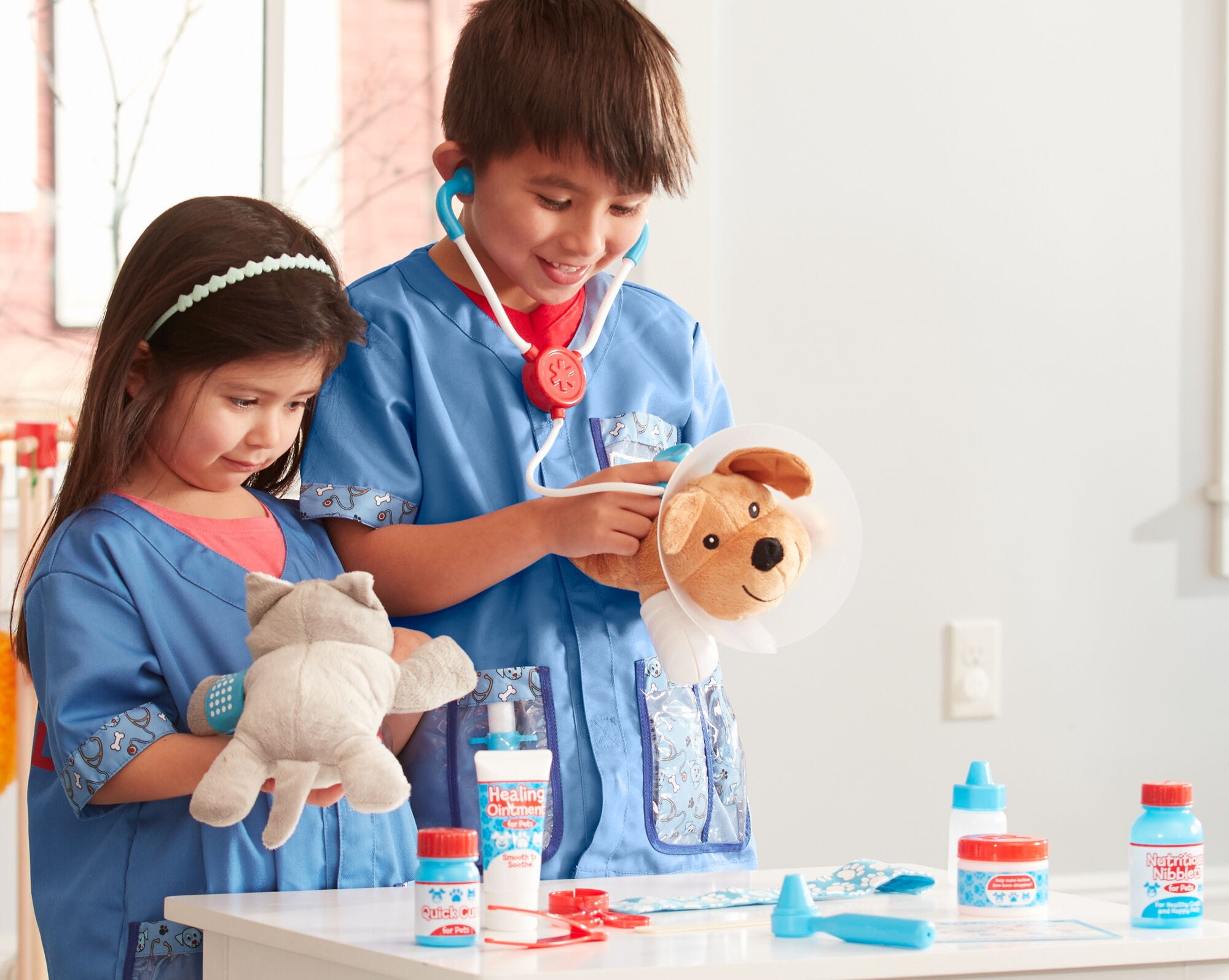 Niezbędny zestaw dla małego weterynarza. Posiada wszystkie akcesoria niezbędne do zbadania i leczenia zwierzątek. Zestaw składa się z 24 elementów w tym: dwa urocze pluszaki (pies i kot), stetoskop, termometr, strzykawka, otoskop, pinceta, zacisk, butelki, tubki, maści, bandaże, gips a nawet kołnierz ochronny na szyję. Wszystko łącznie z listą kontrolną (wielokrotnego użytku) przechowuje się w poręcznej torbie.