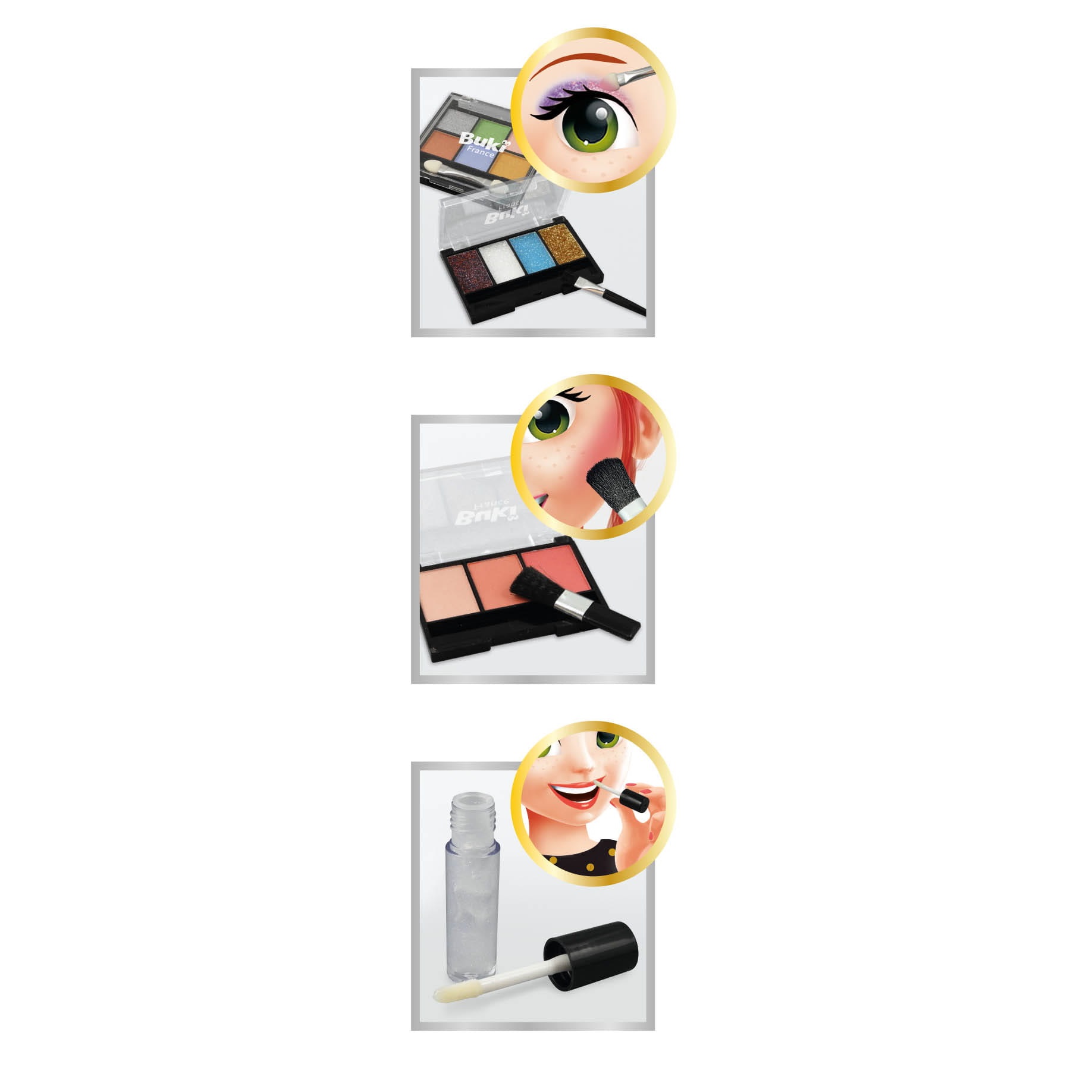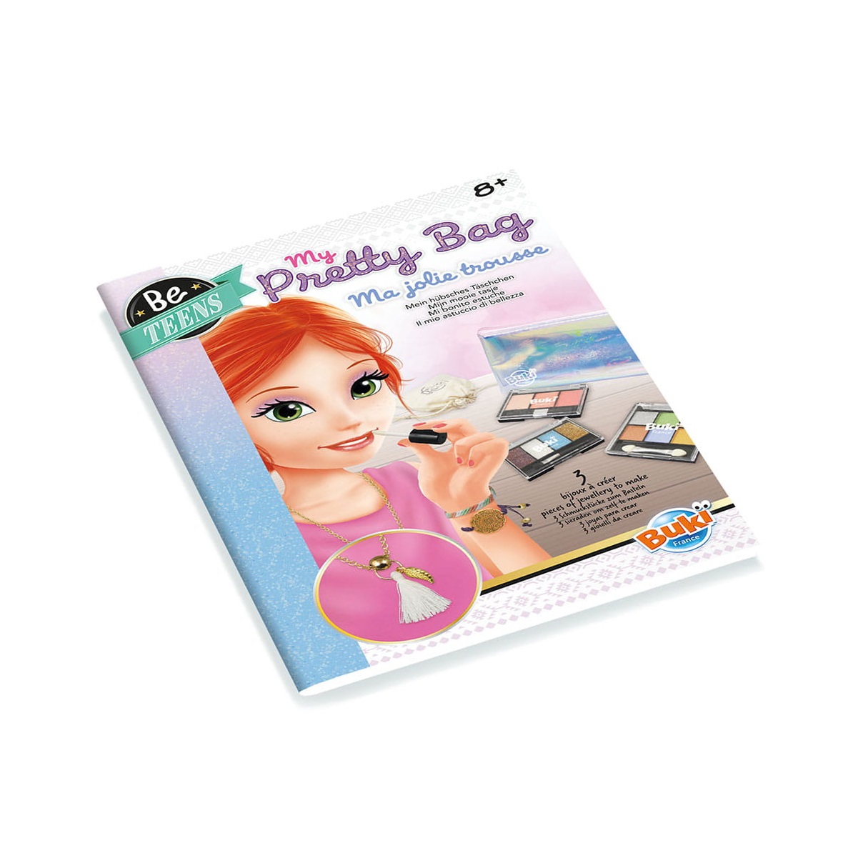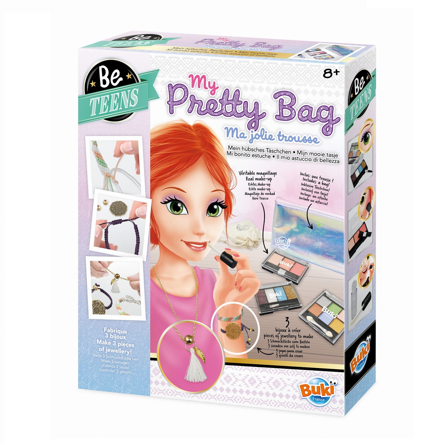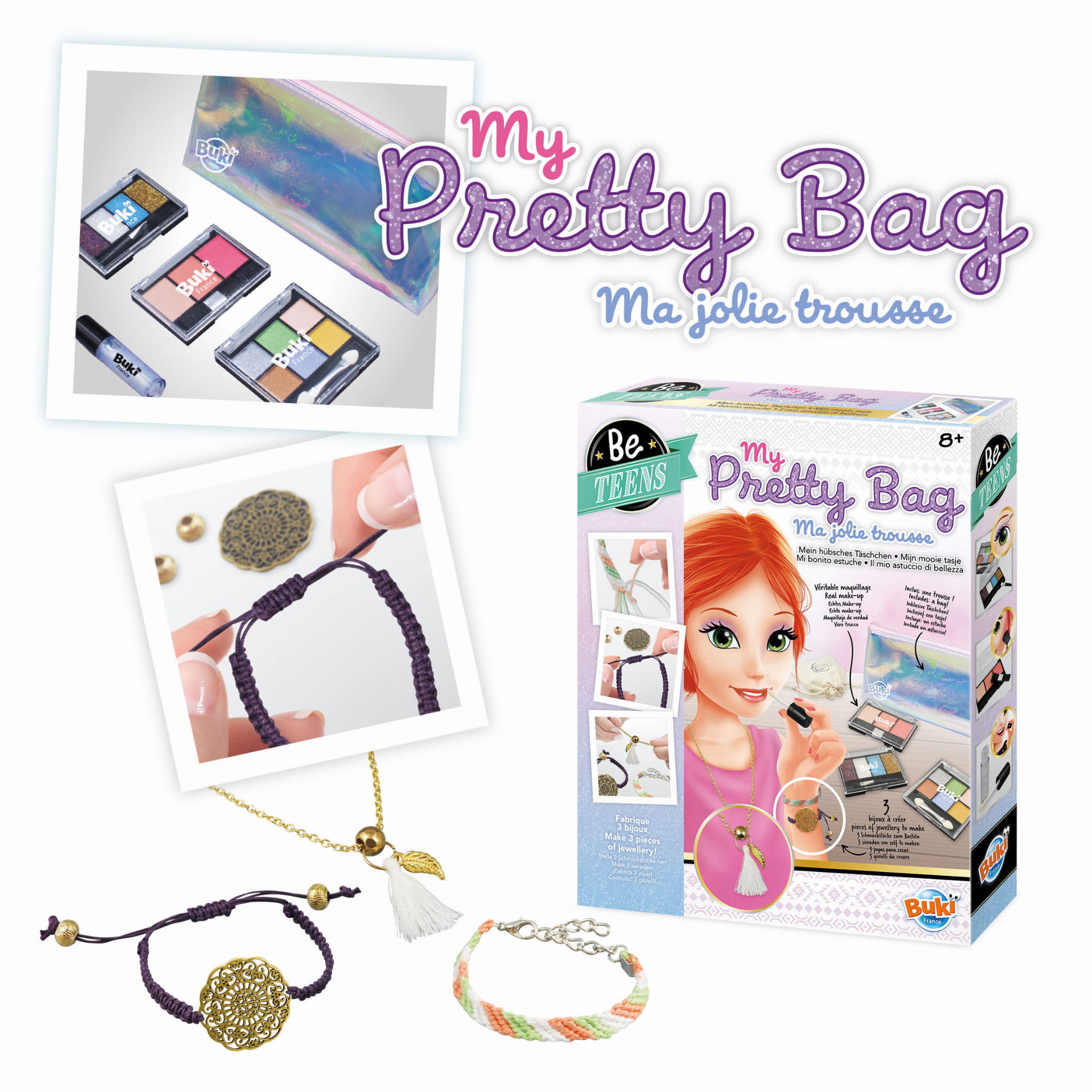 Idealny zestaw dla każdej dziewczynki. Zestaw z prawdziwymi produktami do makijażu: błyszczyk, paleta cieni i akcesoriami do wykonania 3 sztuk biżuterii. Możesz wykonać 2 bransoletki i naszyjnik, a następnie schować do materiałowej sakiewki. Kosmetyki i biżuterię możesz przechowywać w dołączonej kosmetyczce, aby móc zabierać je wszędzie ze sobą. Skład produktów do makijażu znajdziesz w instrukcji.