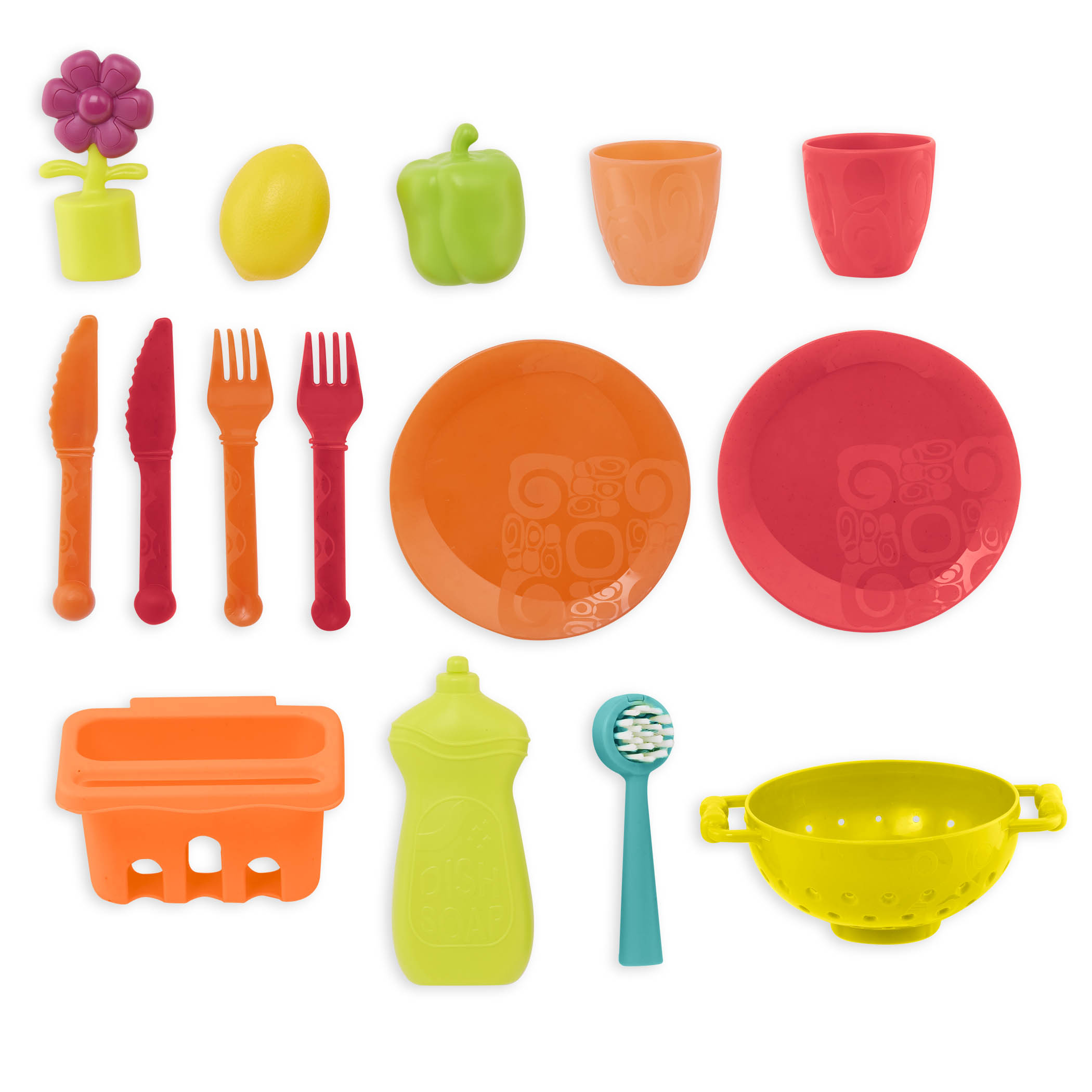 Zestaw z pewnością sprawdzi się w kuchni Twojego dziecka. Po odkręceniu kurka leje się woda – ale frajda. Dodatkową atrakcję stanowią wydobywające się z kranu odgłosy. A to nie wszystkie zalety unikatowego zestawu! Naczynia i sztućce zmieniają kolor pod wpływem temperatury wody. Wyjęte i pozostawione do osuszenia odzyskują swoje pierwotne zabarwienie.
