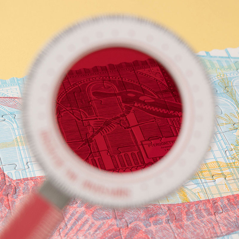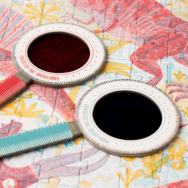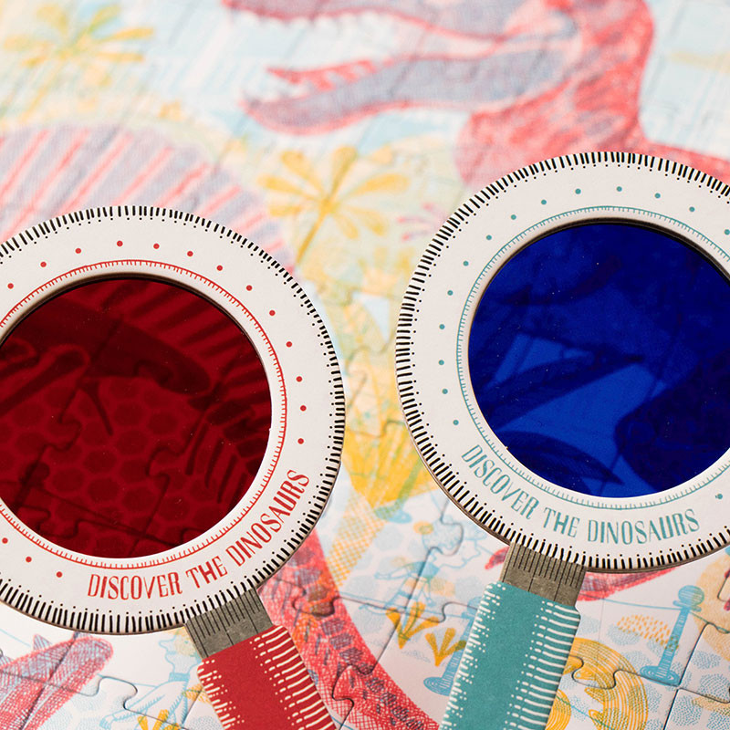 Puzzle edukacyjne marki Londji, które po ułożeniu przedstawiają dinozaury. Ilość elementów: 200. W zestawie znajdują się także 2 lupy. Patrząc przez niebieską dziecko zobaczy dinozaury: tyranozaura, triceratopsa, pterozuara czy brachiozura. Patrząc przez czerwoną ukażą nam się szkielety tych prehistorycznych zwierząt. Idealne połączenie zabawy z nauką.