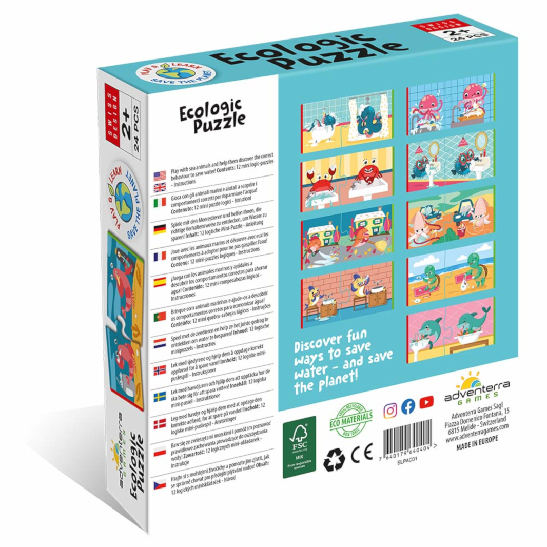 Ekopuzzle Oszczędzanie wody to prosta układanka dla dzieci z motywem zwierzątek, która rozwija u dziecka spostrzegawczość, logiczne myślenie oraz zaznajamia ze światem zwierząt morskich. Bawiąc się puzzlami dziecko uczy się wyrażać i rozwijać swój wewnętrzny świat, a następnie porównywać go z otaczającą rzeczywistością. Różnorodność morza i przedstawione stworzenia pozwolą dziecku nauczyć się ich nazw, poszerzając tym samym jego słownictwo.