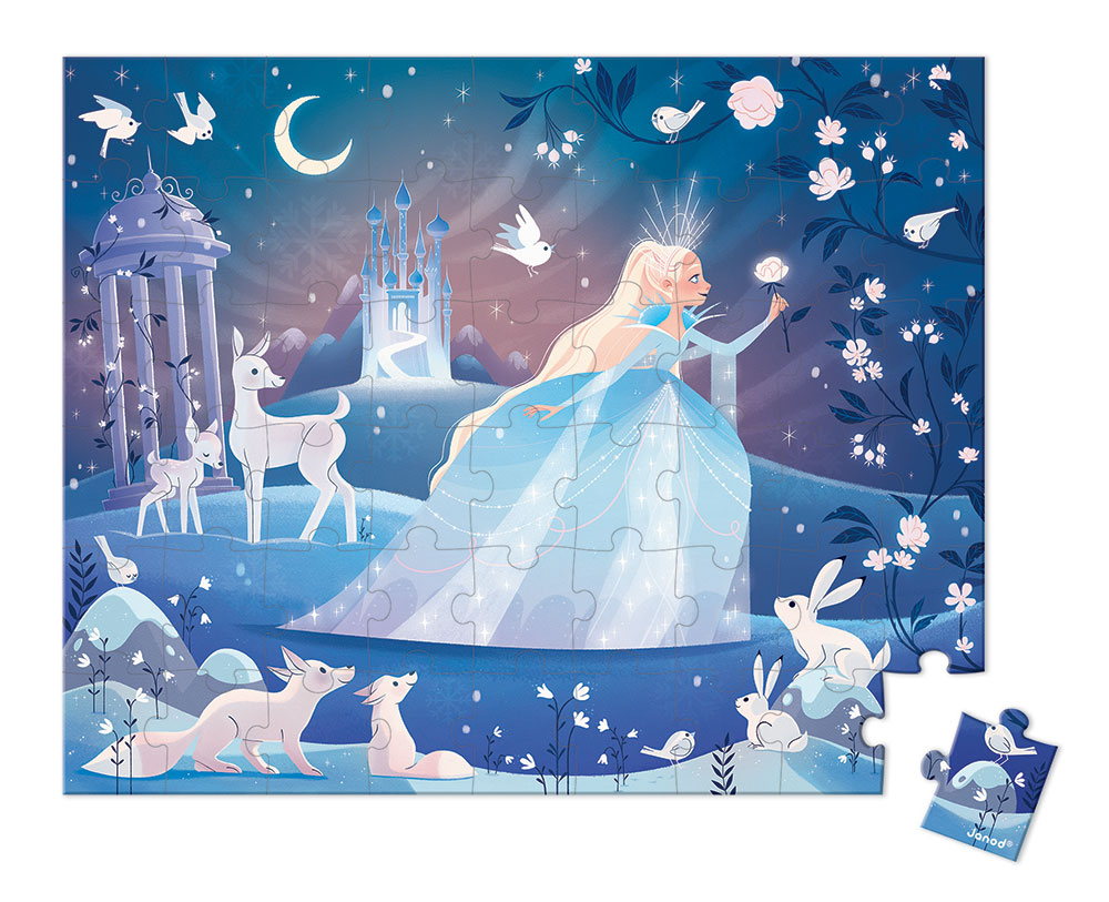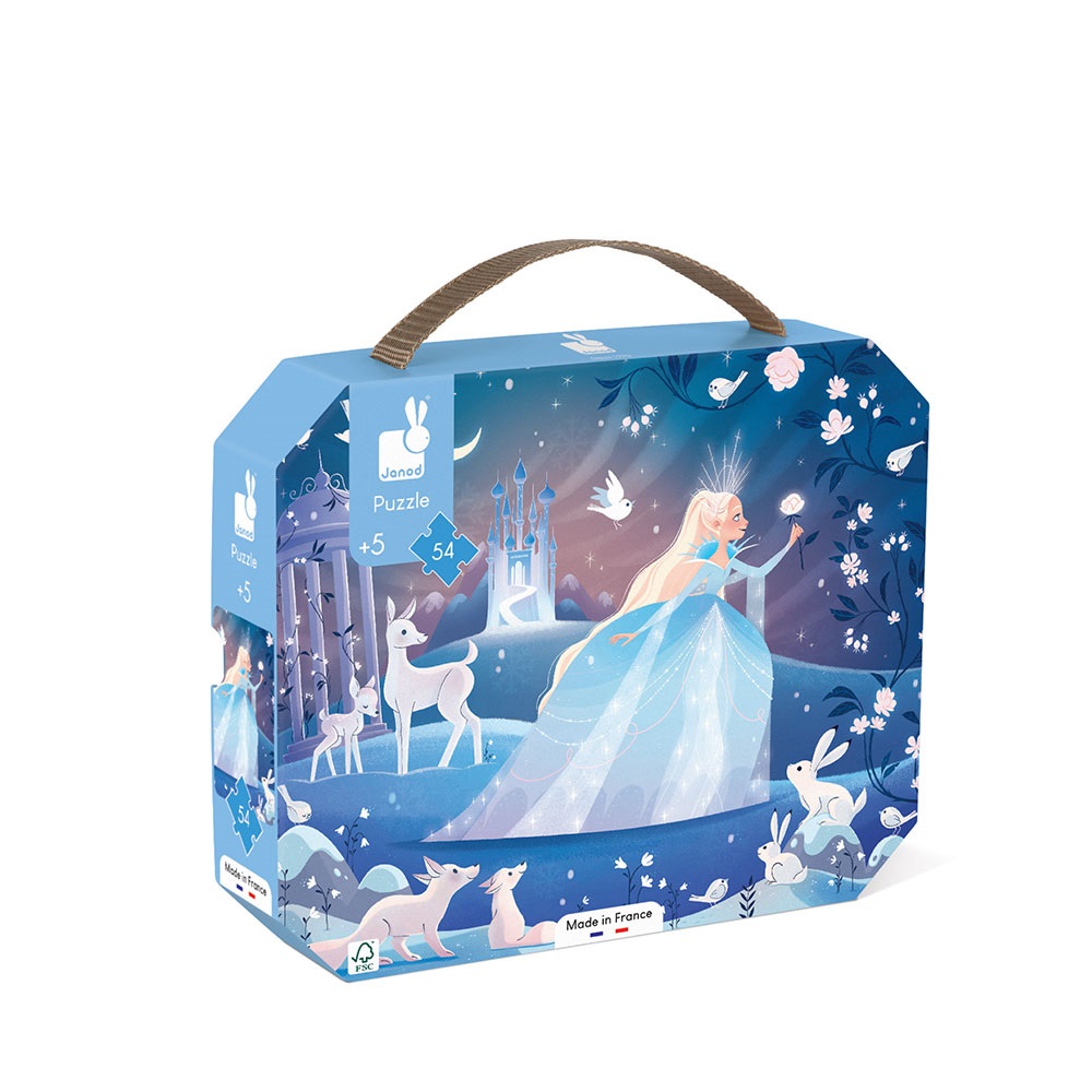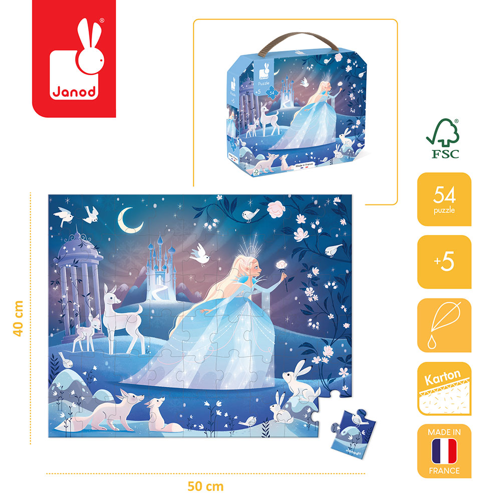 Zestaw puzzli w walizce Lodowa magia francuskiej marki JANOD składa się z 54 elementów, po ułożeniu tworzących piękny, bogaty w szczegóły obrazek, przedstawiający księżniczkę lodu w jej urokliwej zimowej krainie. Na pokrytej śniegiem polanie z lodowym pałacem w tle znajdują się m.in. białe lisy, ptaki, zające i jelonki, a na nocnym niebie świeci księżyc i migocą spadają płatki. Puzzle wykonane są z solidnego kartonu. Zaprojektowane i wyprodukowane we Francji. Zapakowane w estetyczną walizeczkę z rączką. Idealnie nadają się na prezent.